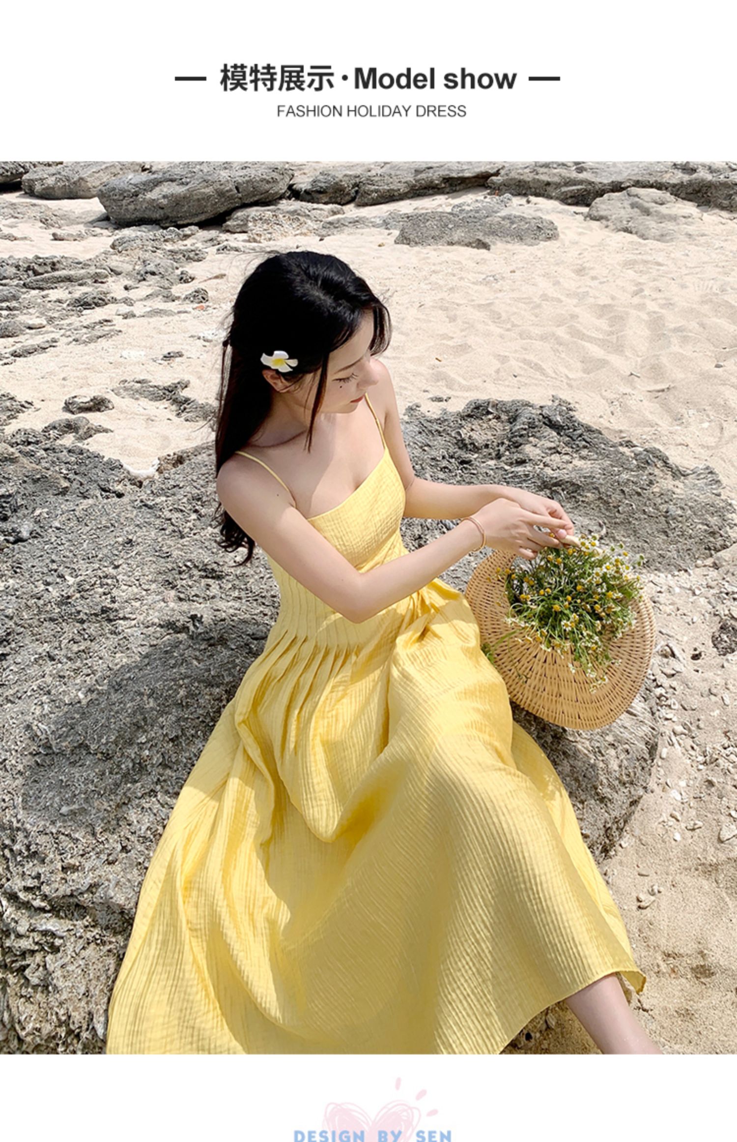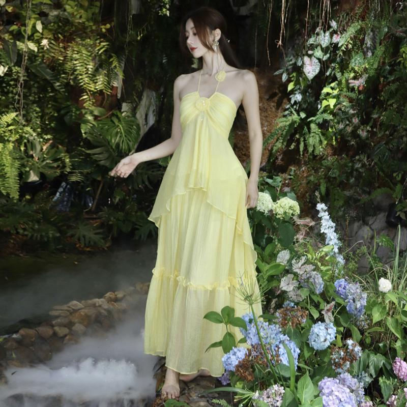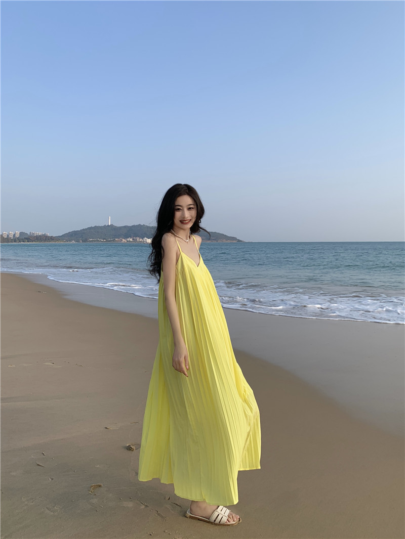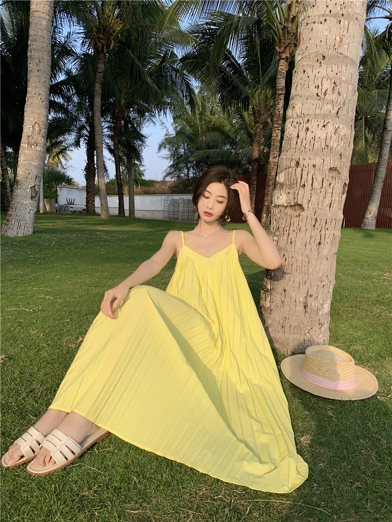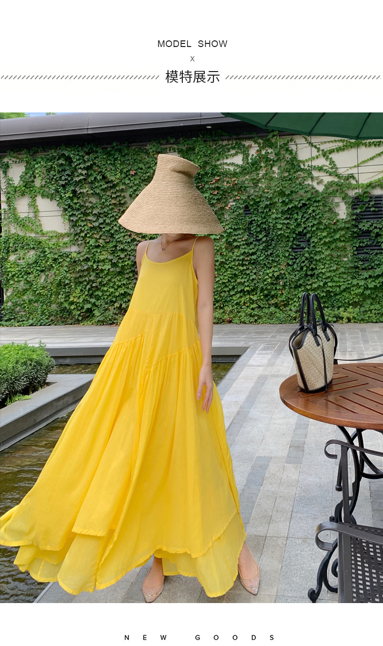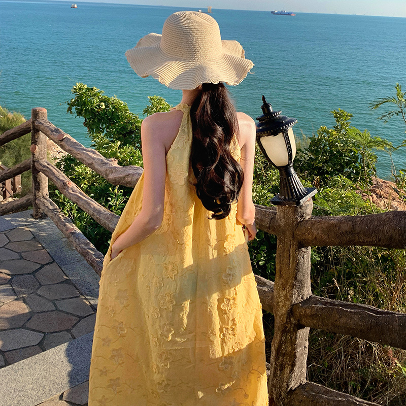 夏季新款巴厘島海邊度假黃色沙灘裙女復古顯瘦韓版連衣裙超仙長裙
