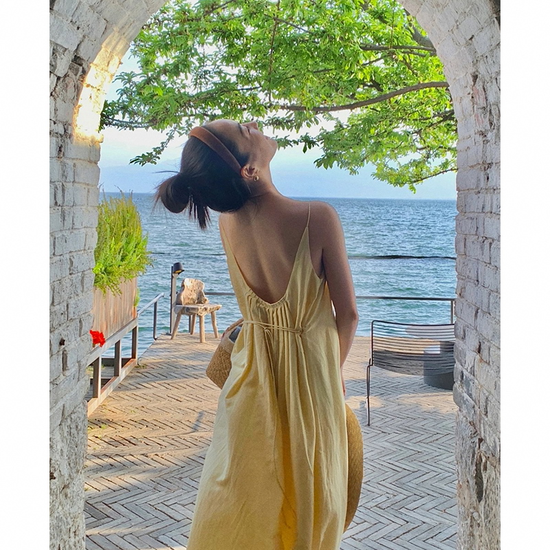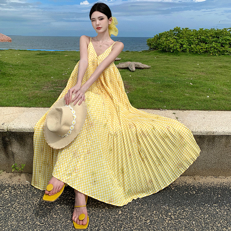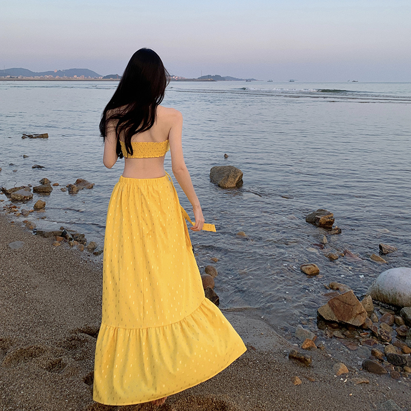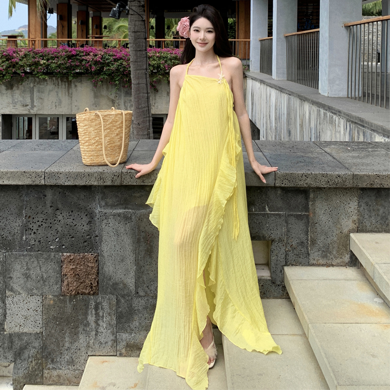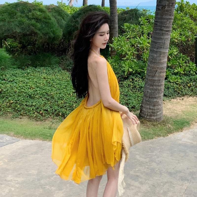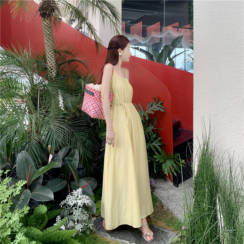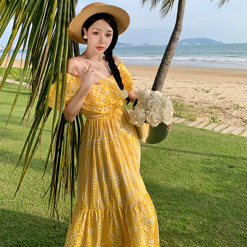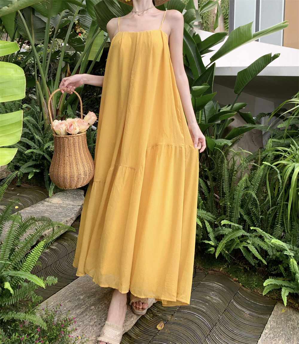 夏季新款巴厘島海邊度假黃色沙灘裙女復古顯瘦韓版連衣裙超仙長裙