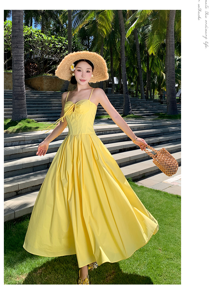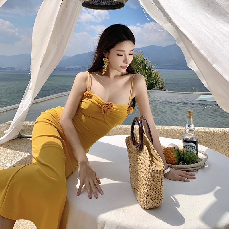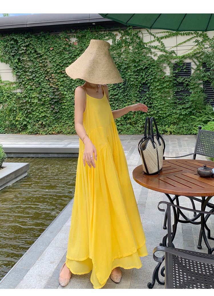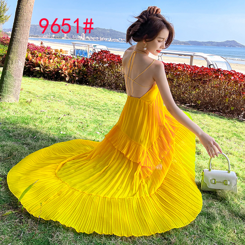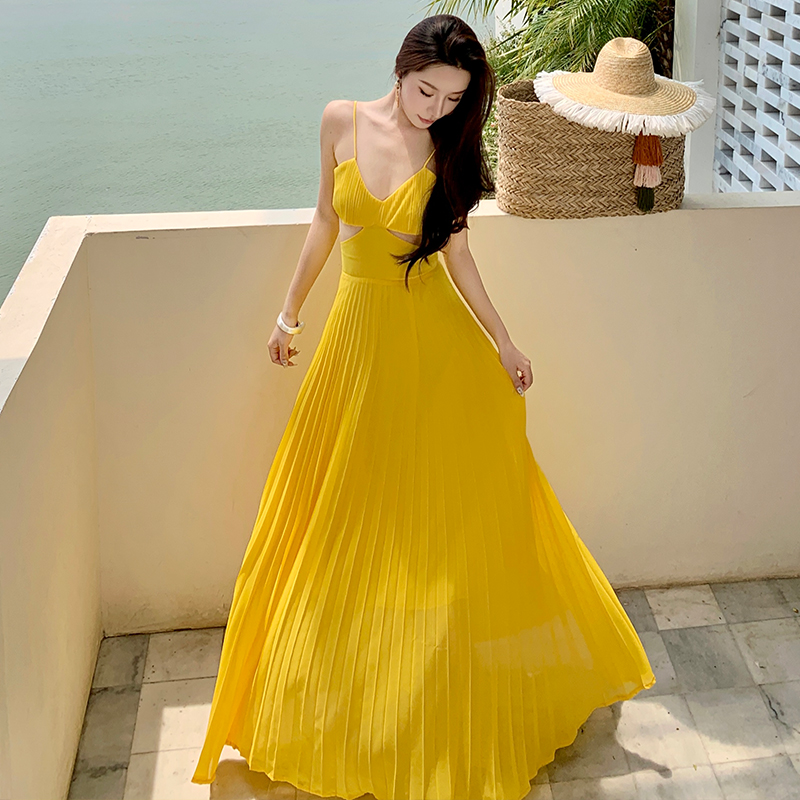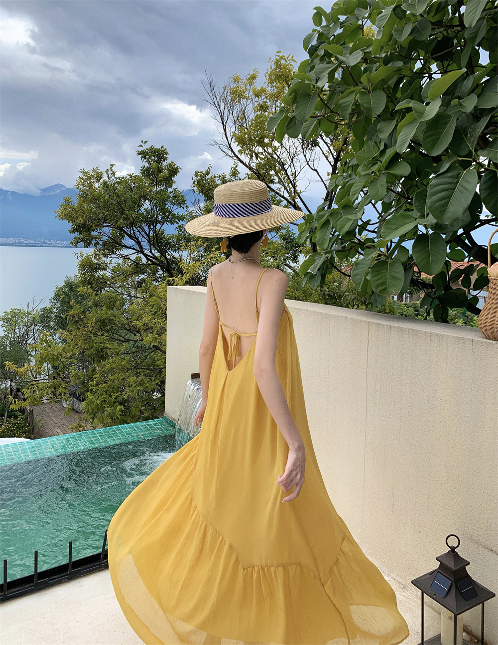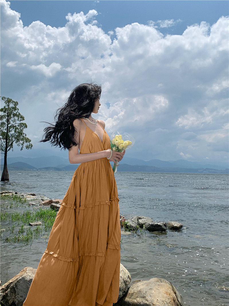 夏季新款巴厘島海邊度假黃色沙灘裙女復古顯瘦韓版連衣裙超仙長裙