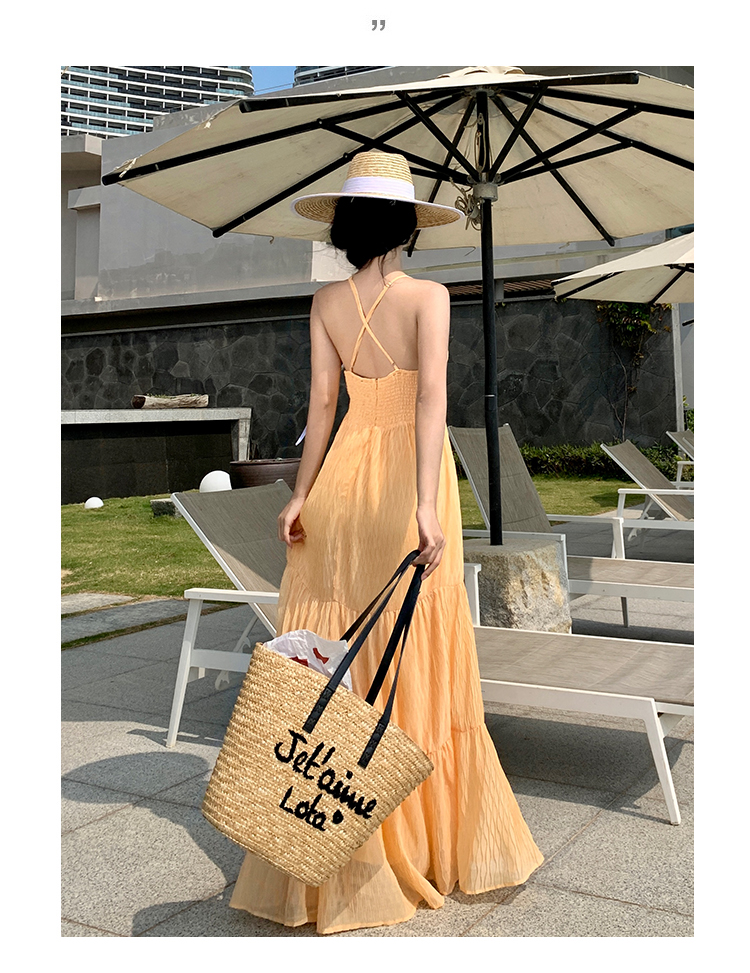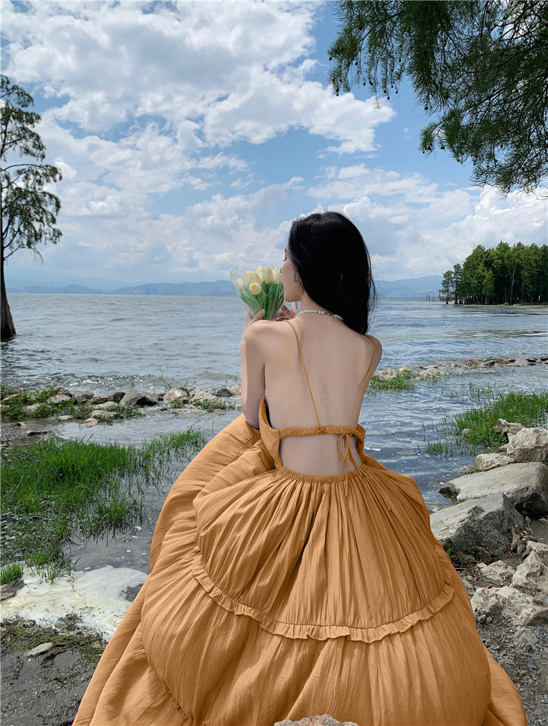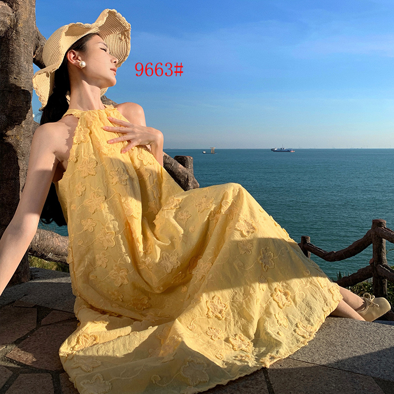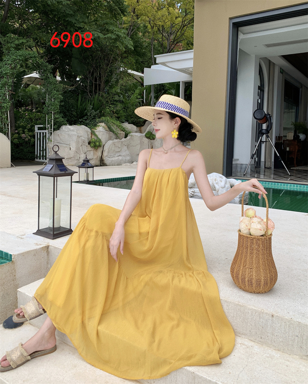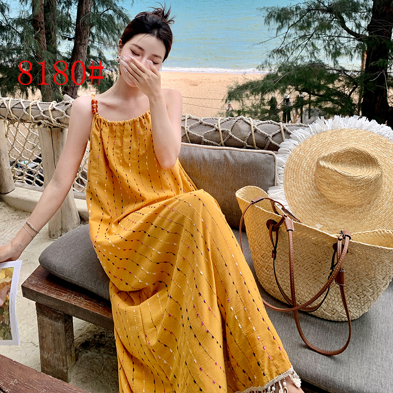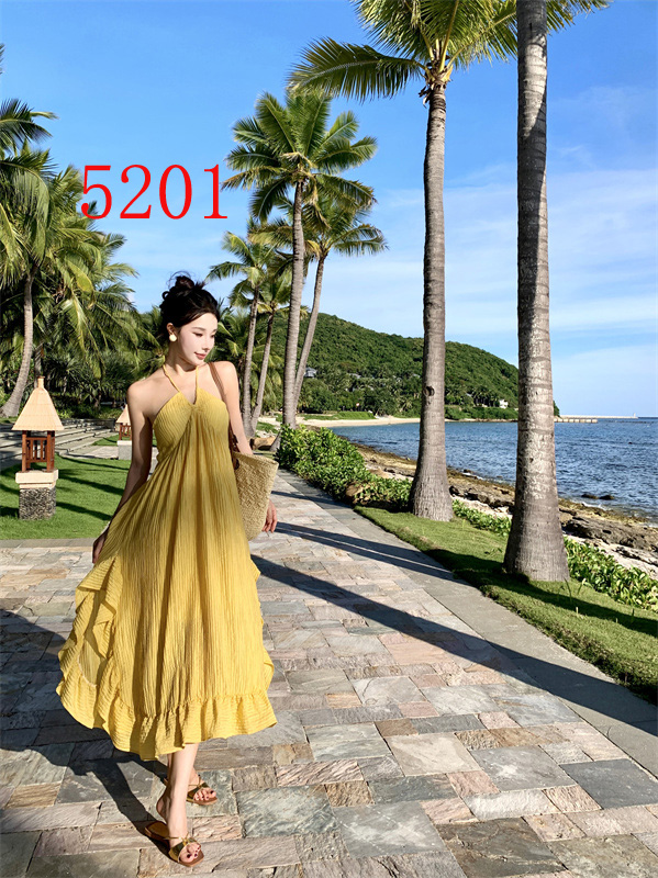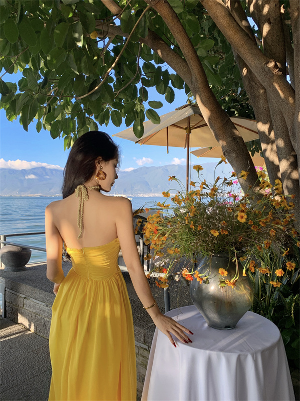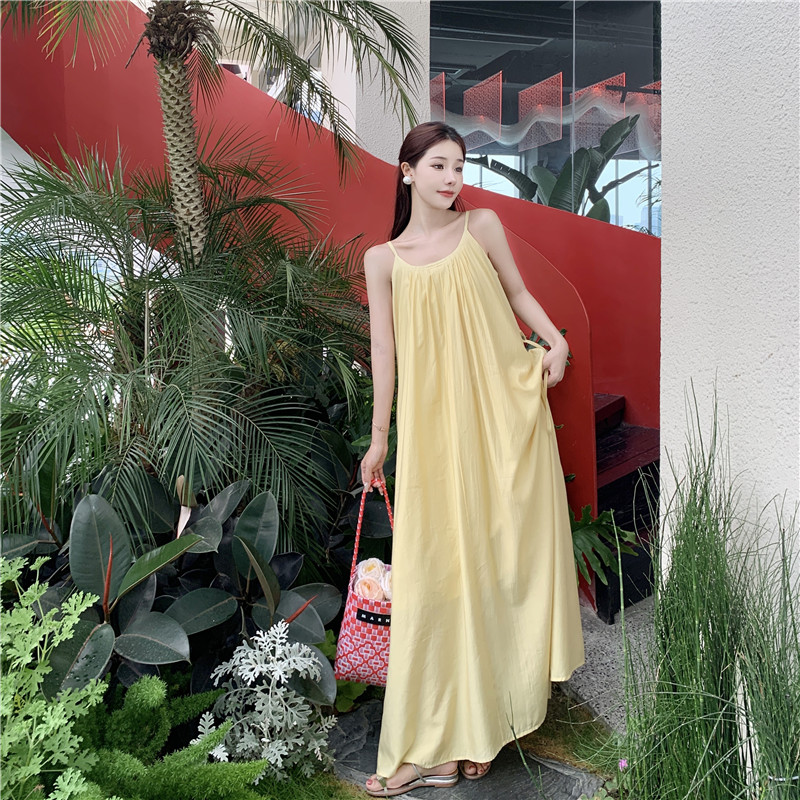 夏季新款巴厘島海邊度假黃色沙灘裙女復古顯瘦韓版連衣裙超仙長裙