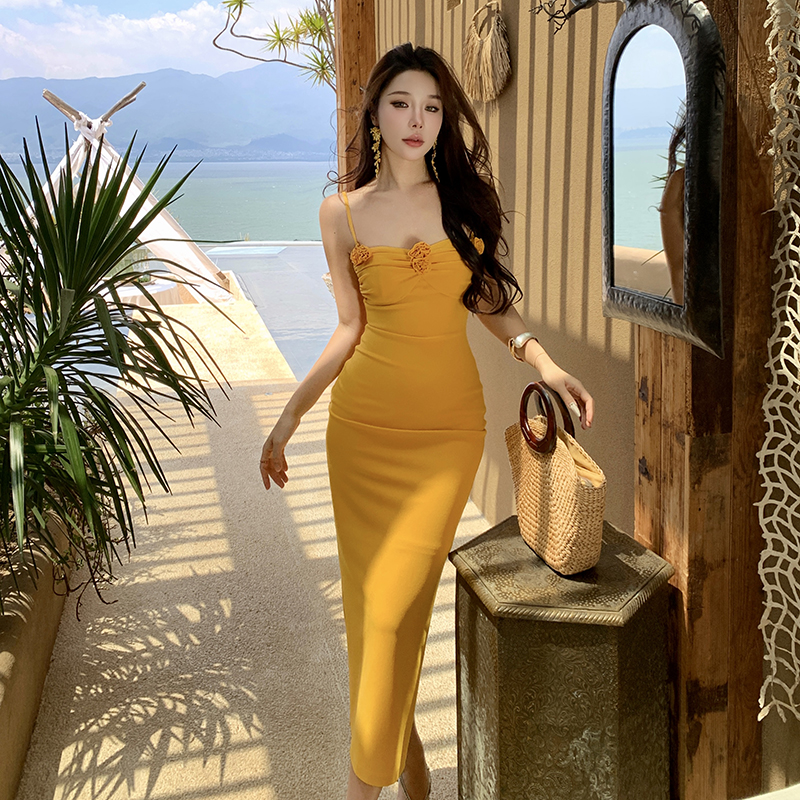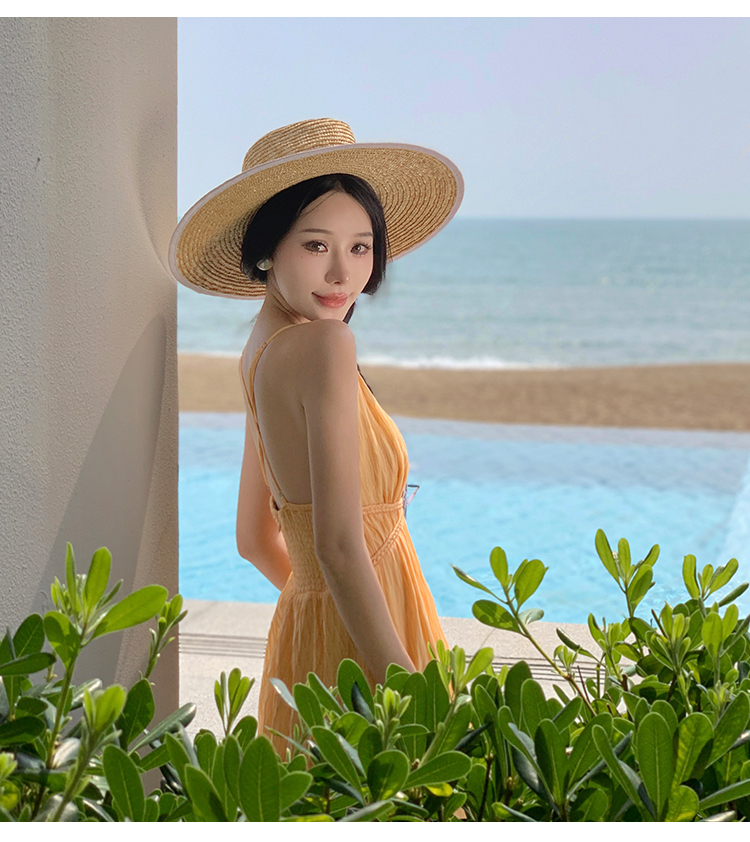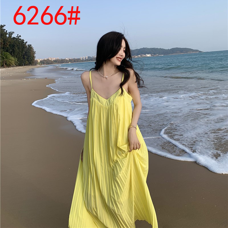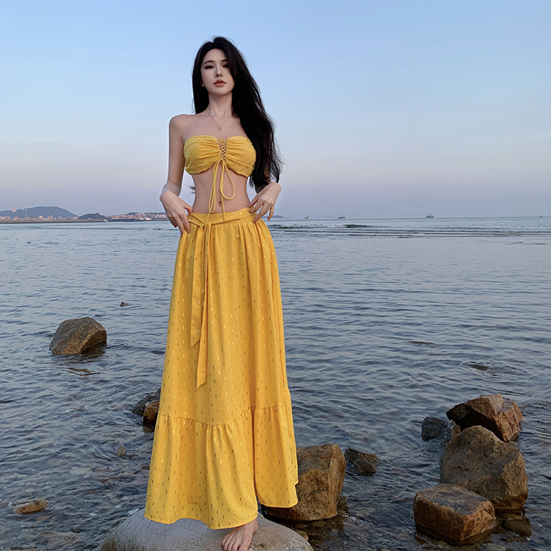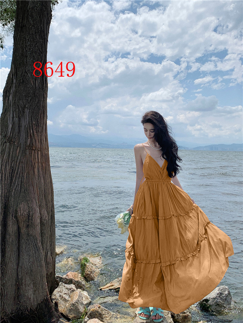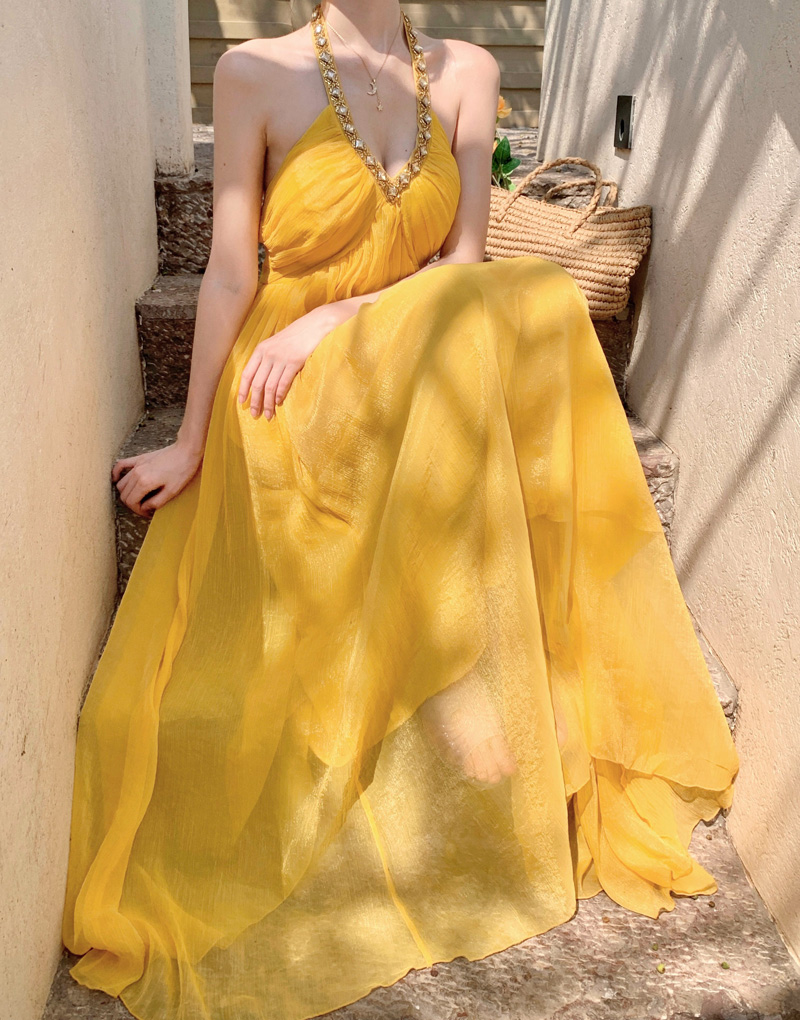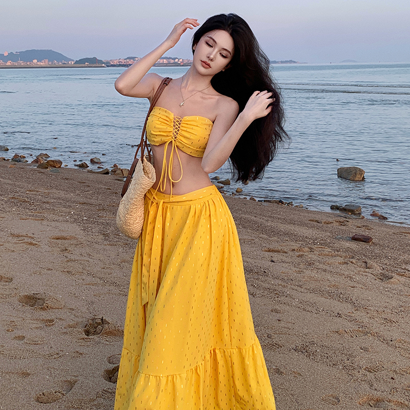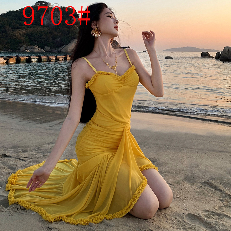 夏季新款巴厘島海邊度假黃色沙灘裙女復古顯瘦韓版連衣裙超仙長裙