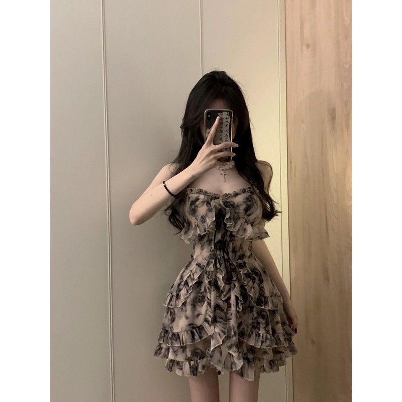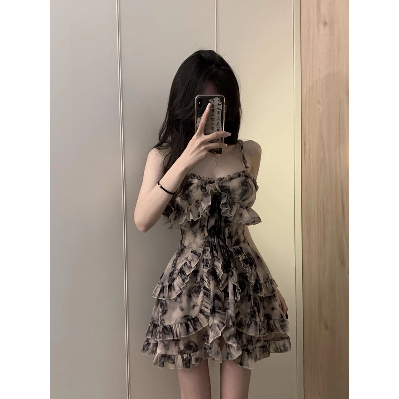 溫柔風水墨碎花吊帶連衣裙子女收腰氣質性感純欲辣妹a字短裙夏季