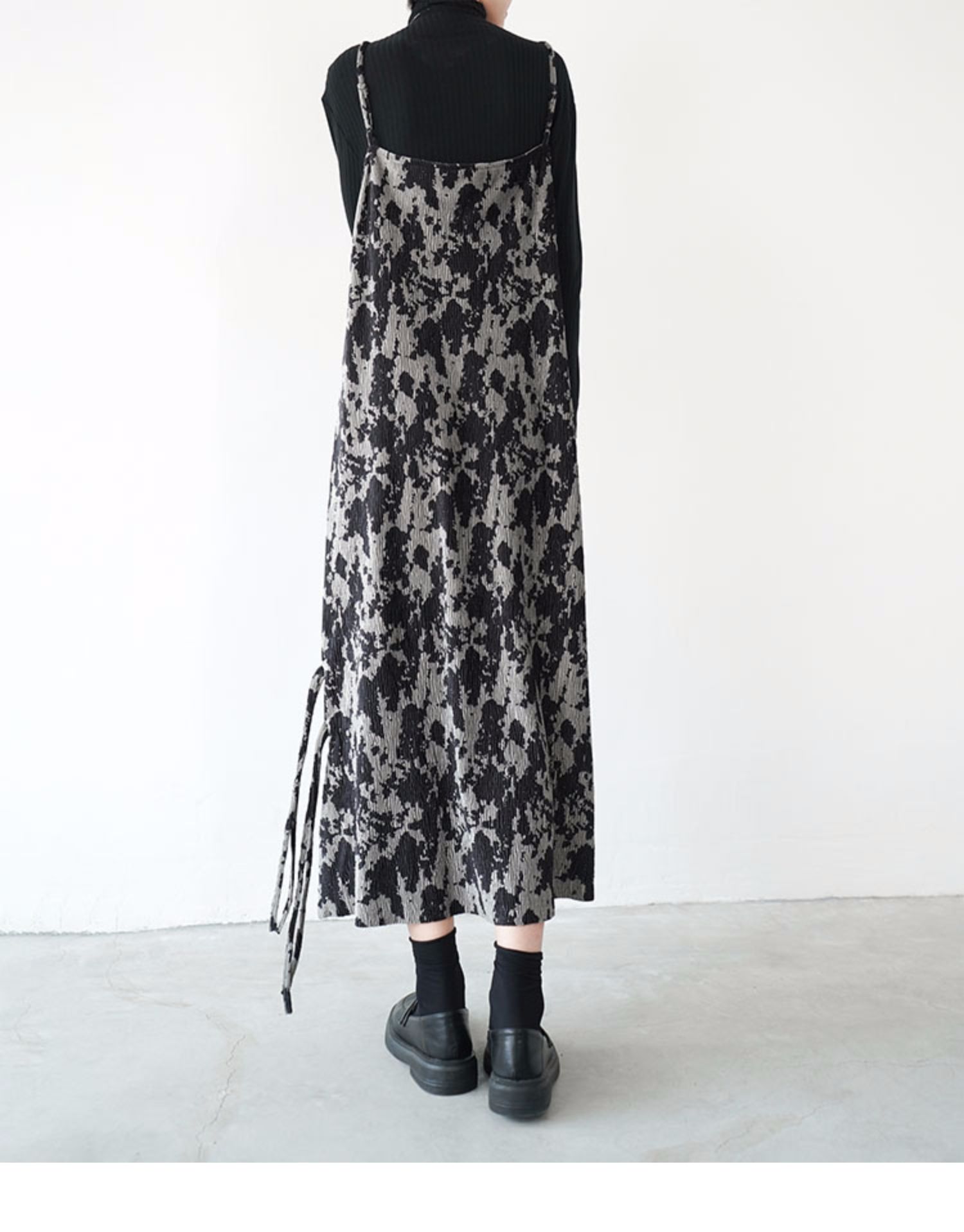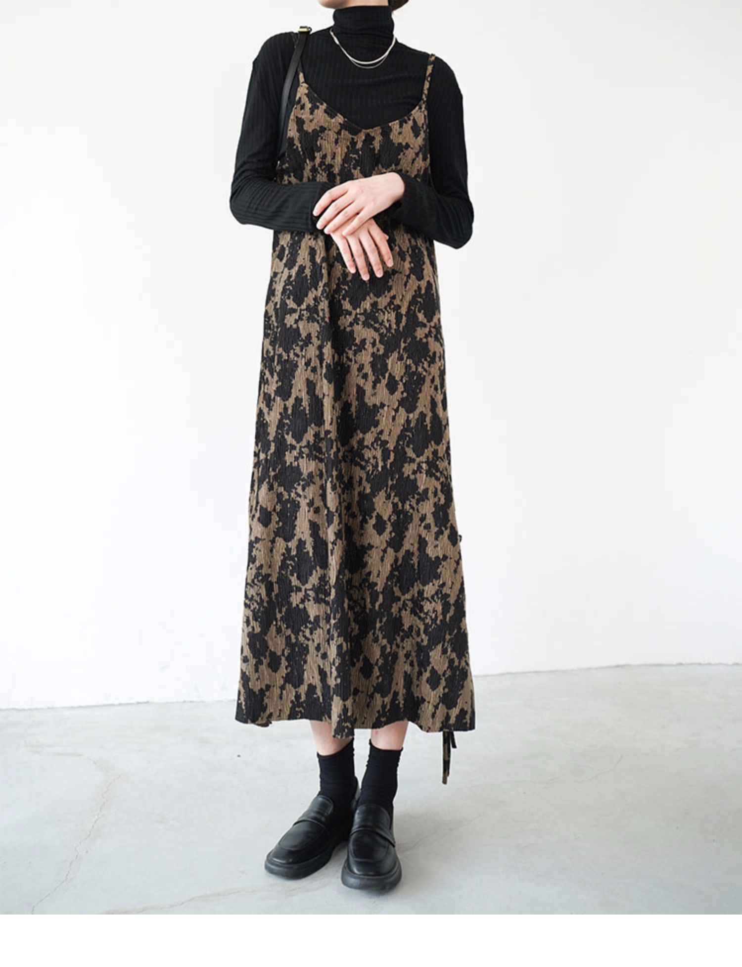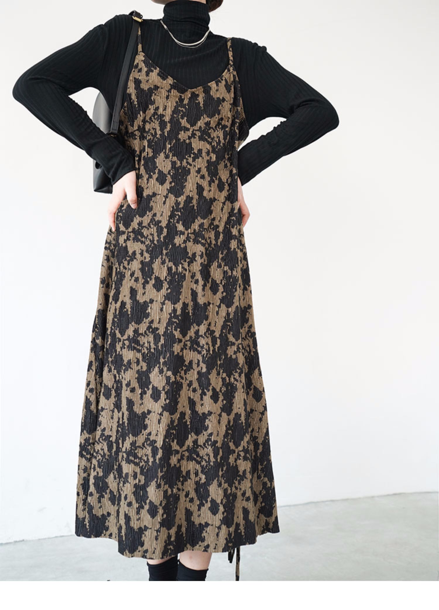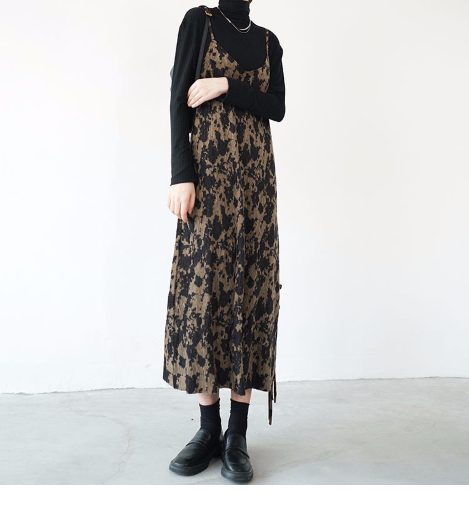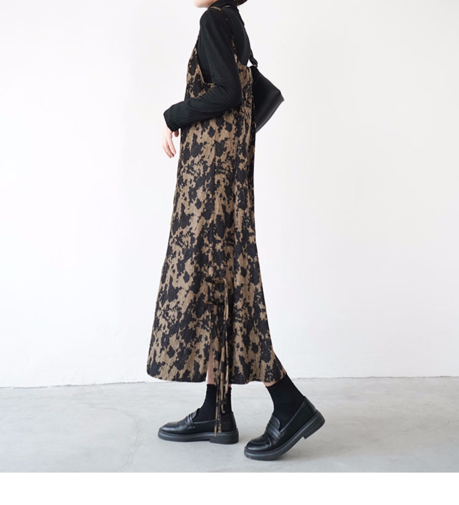 復古碎花絲絨吊帶裙秋冬背帶裙女豹紋連衣裙V領中長款燈芯絨裙子