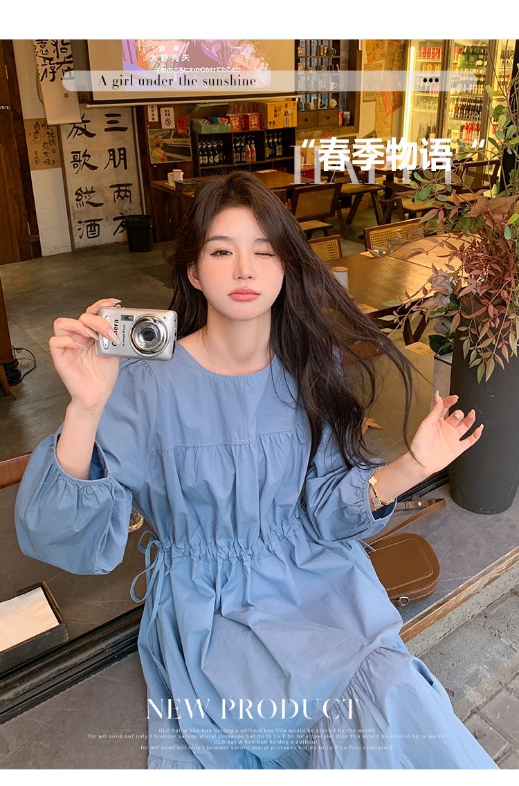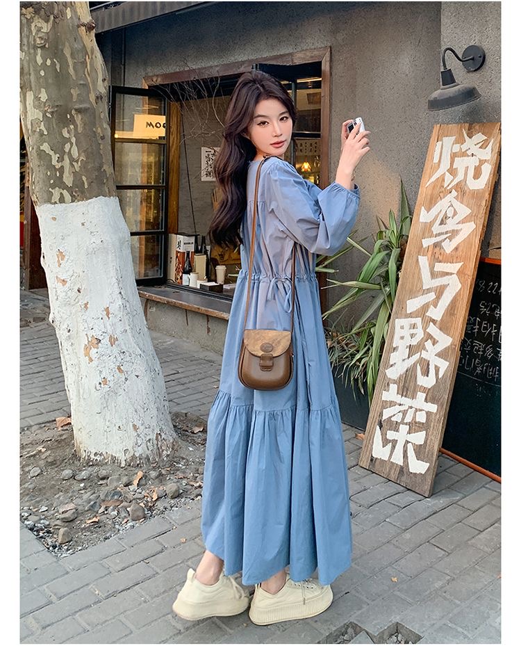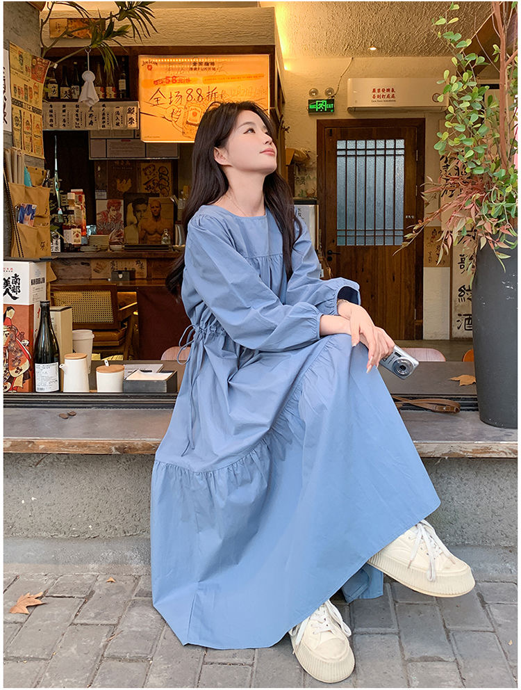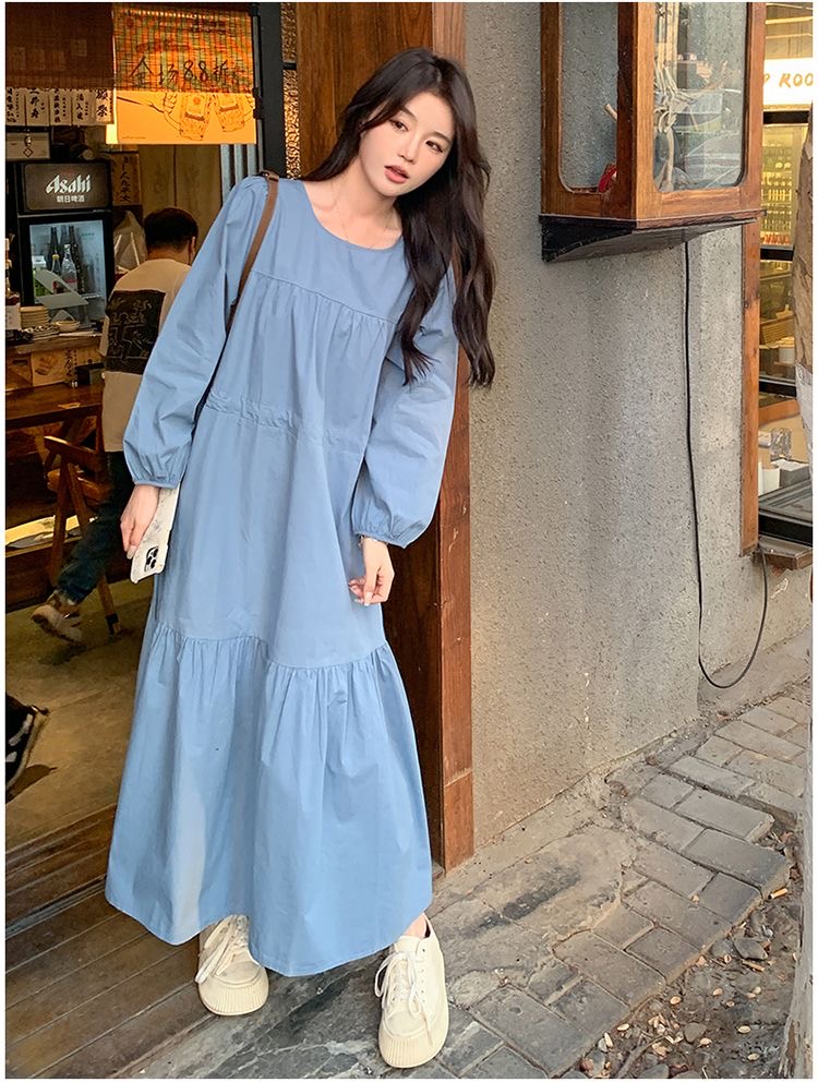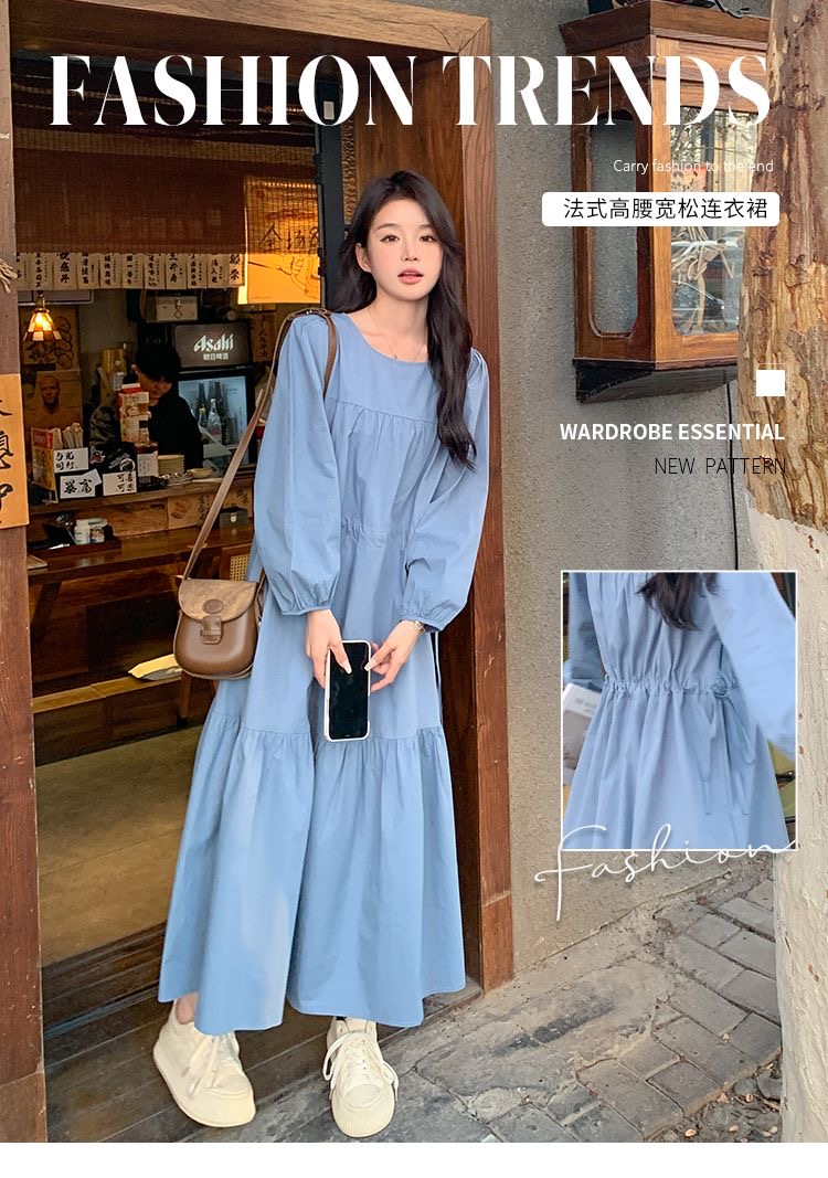 大碼300斤藍色魚尾長款連衣裙春秋時尚新款寬松遮肚顯瘦抽褶長裙