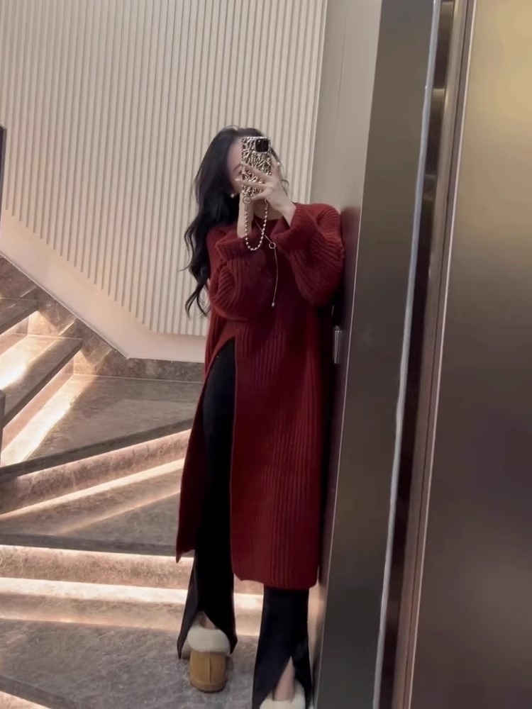 設計感復古毛衣裙女2024秋冬季新款套頭開叉過膝中長款針織連衣裙