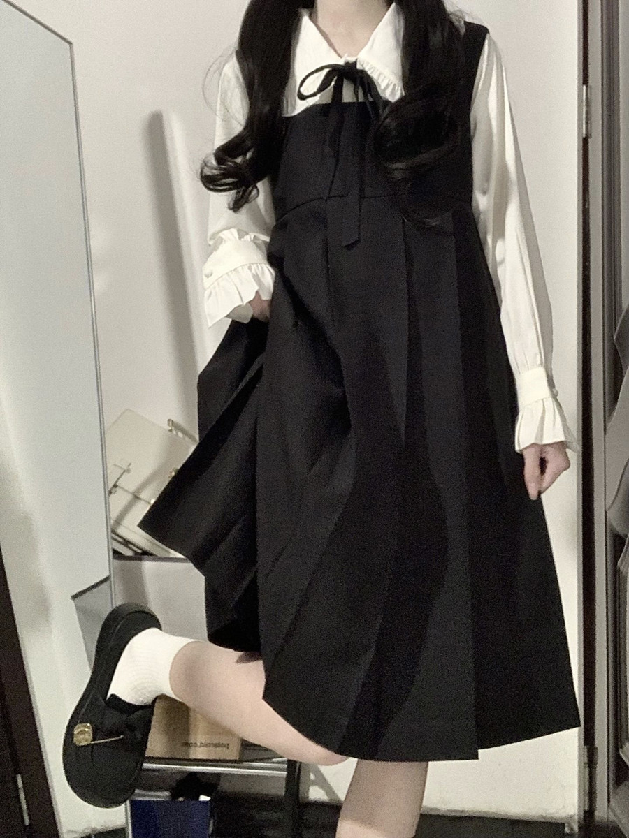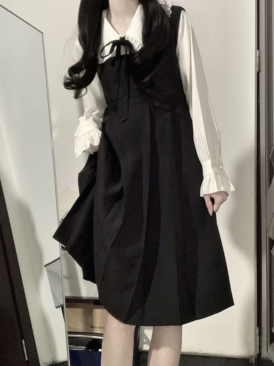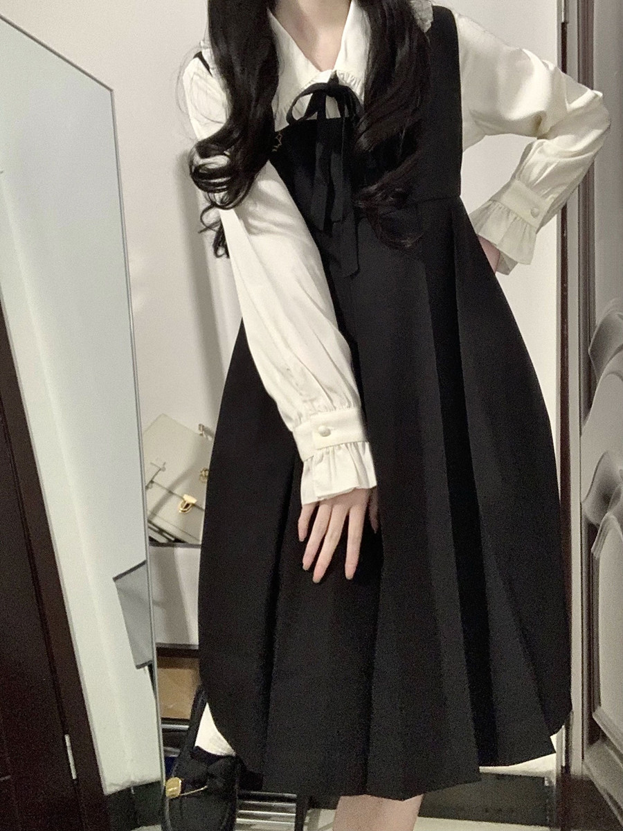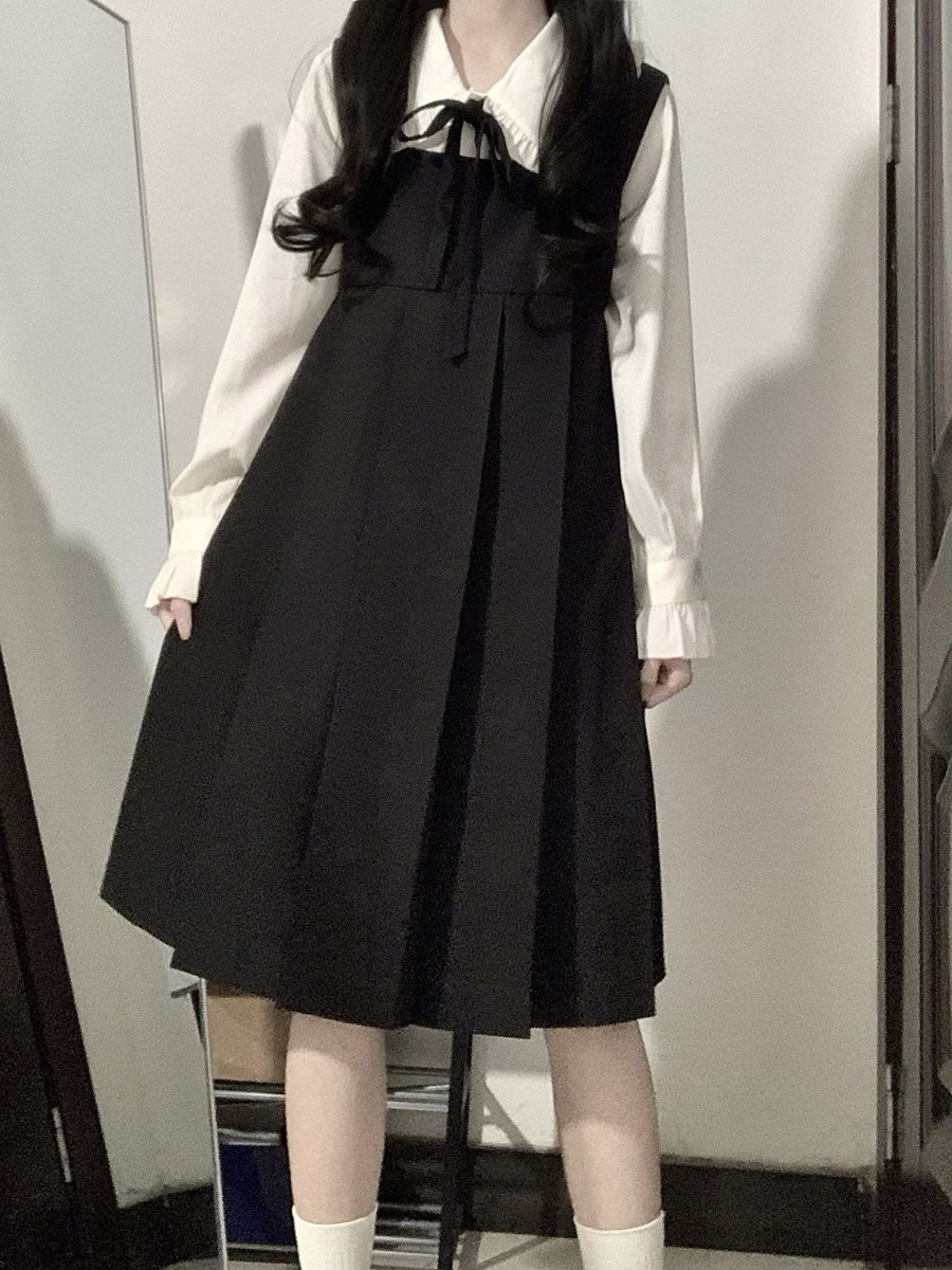 日系學院風小個子背帶裙兩件套女春秋奶乖裙學生娃娃領襯衫連衣裙