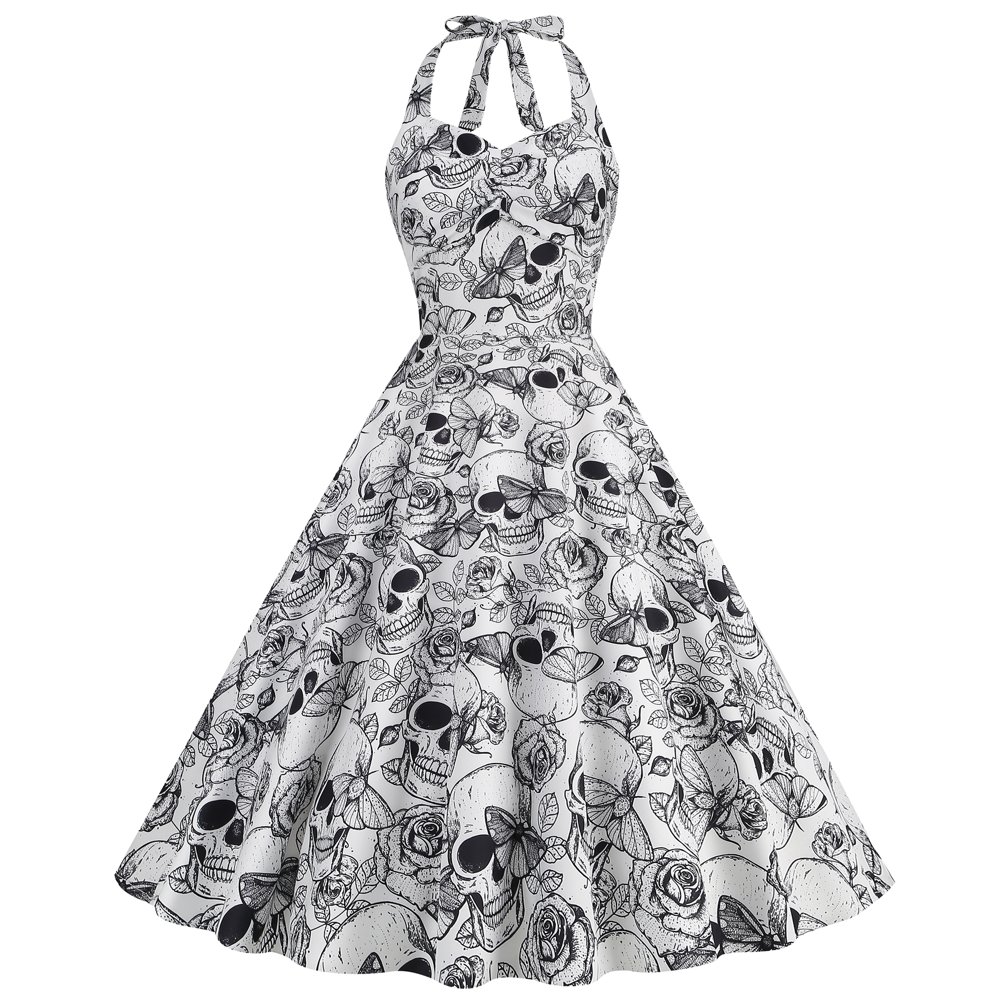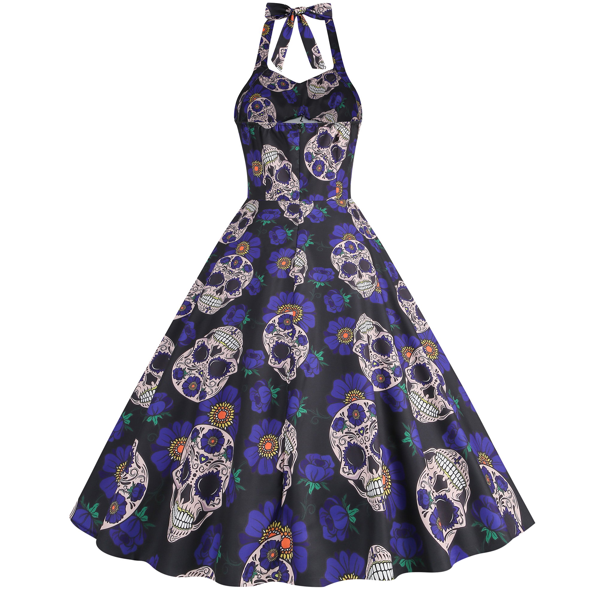 歐美萬聖節南瓜節Halloween卡通玫瑰掛脖露背修身無袖中長連衣裙