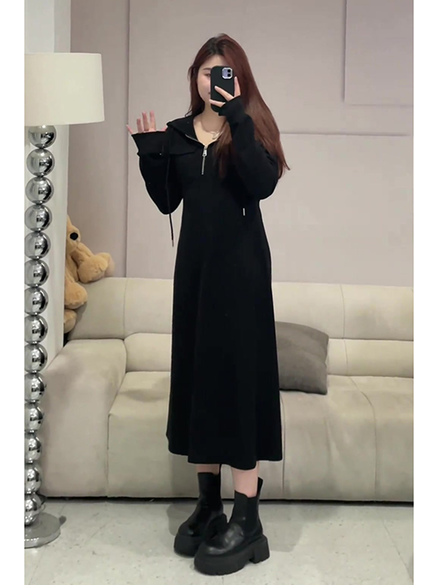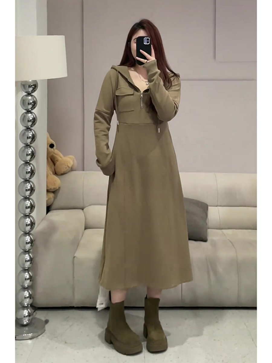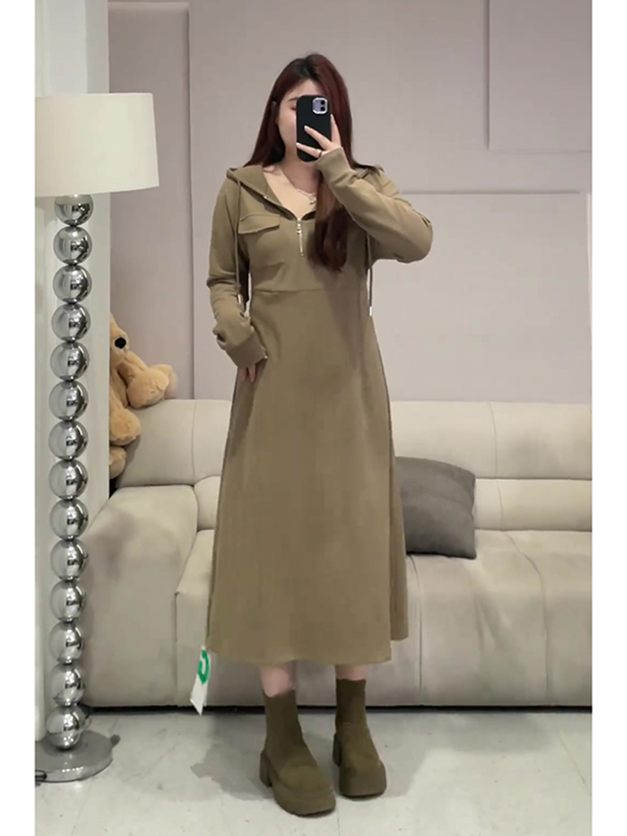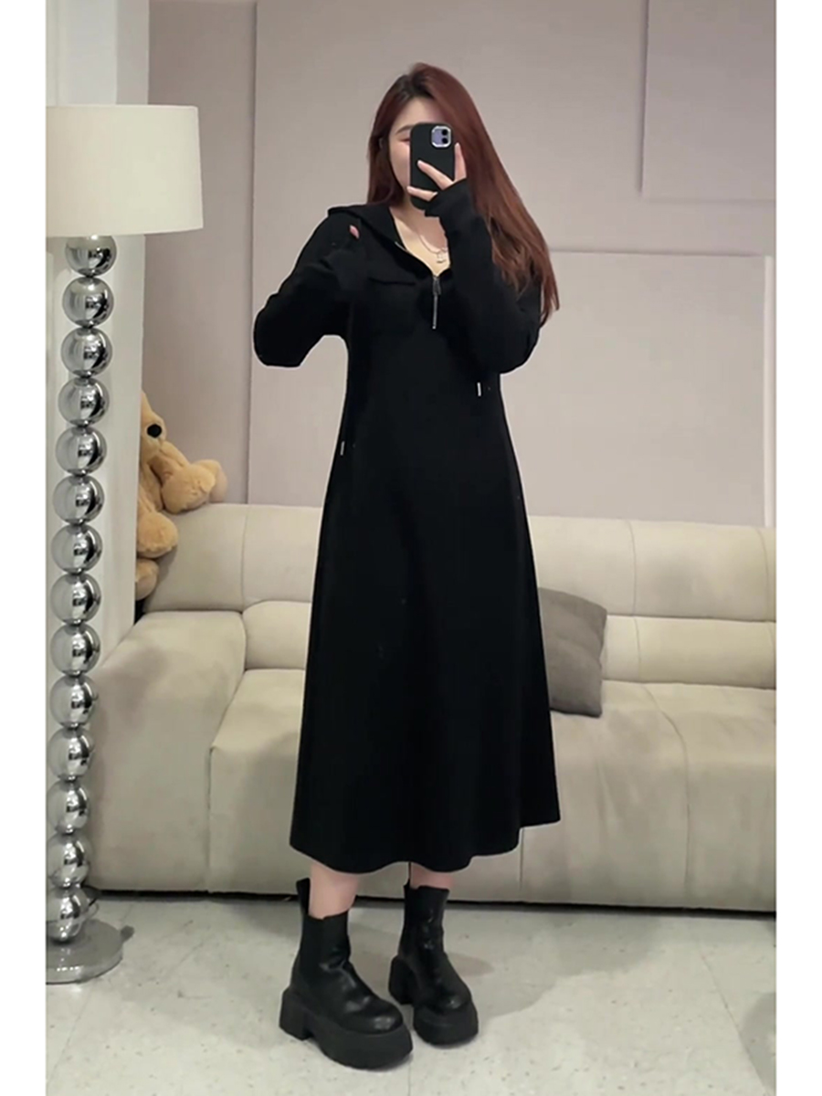 大碼女裝胖mm連帽半拉鍊收腰連衣裙女秋裝2025年新款遮肉顯瘦長裙