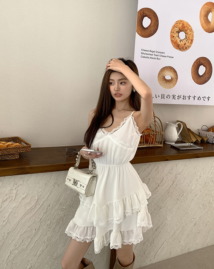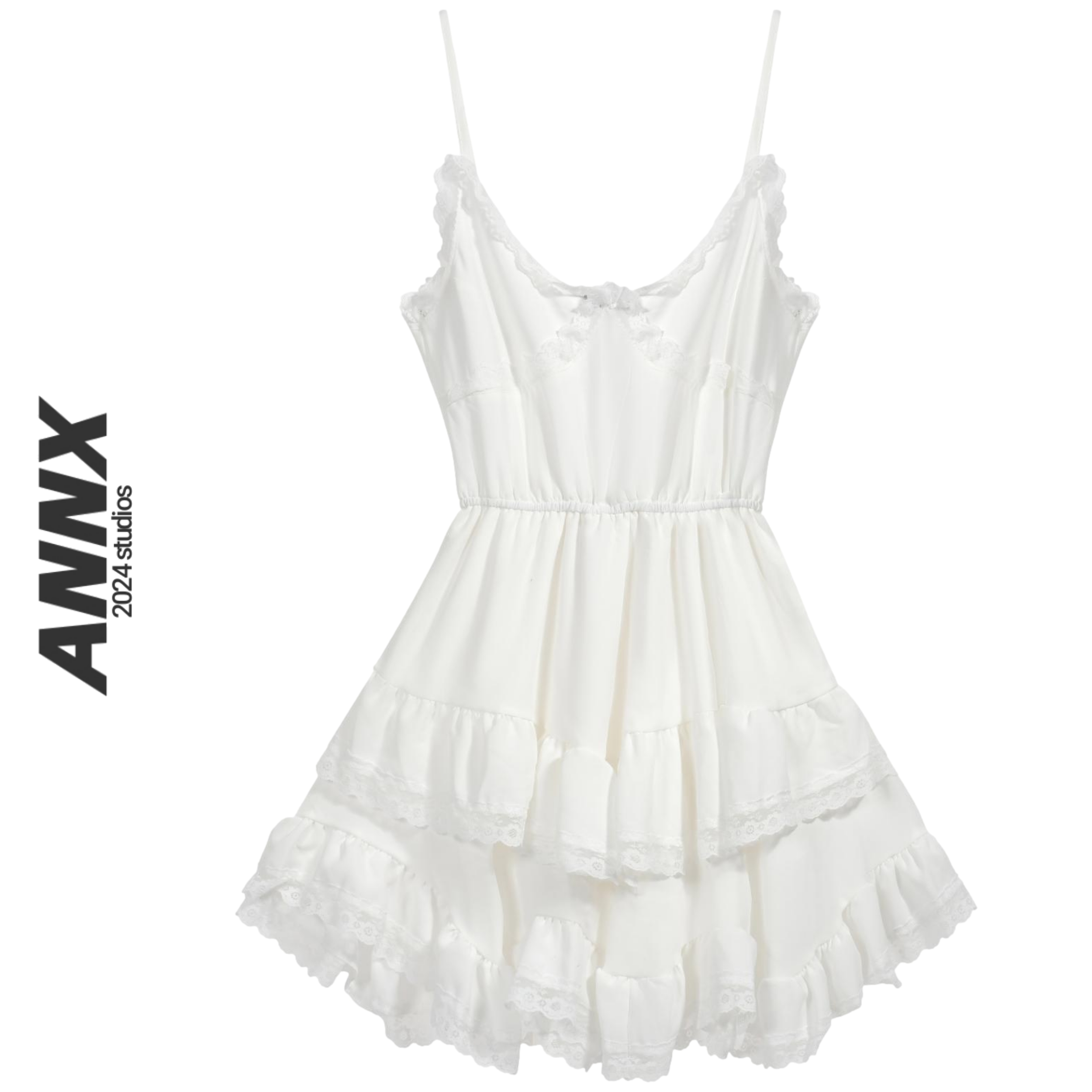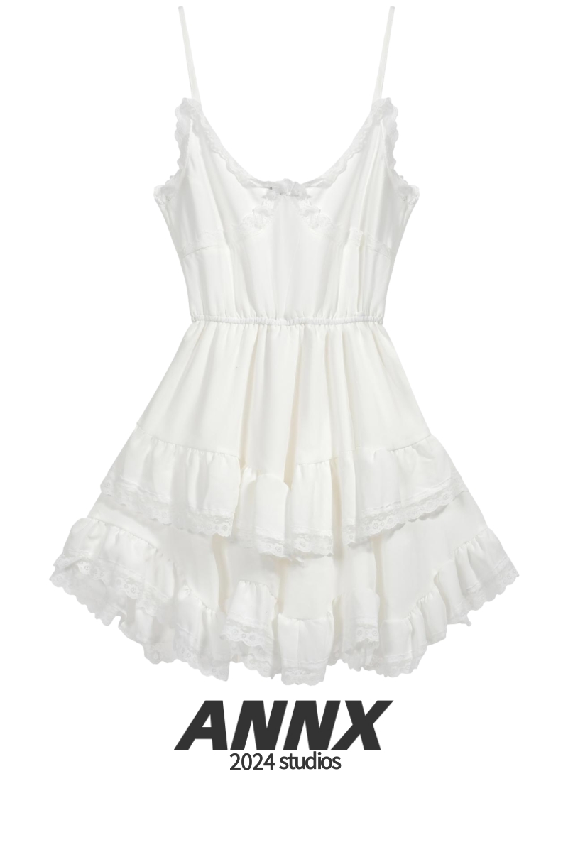 ANNX2025新款不規則白蕾絲拼接吊帶連衣裙女收腰顯瘦內搭短裙子