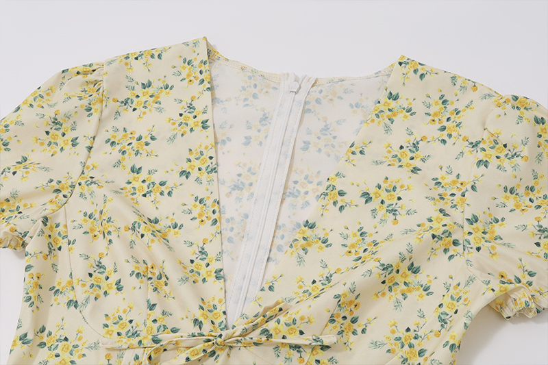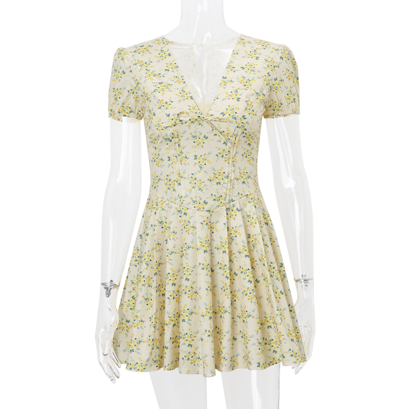 法式甜美碎花泡泡短袖性感V領連衣裙女夏純欲收腰顯瘦辣妹A字短裙