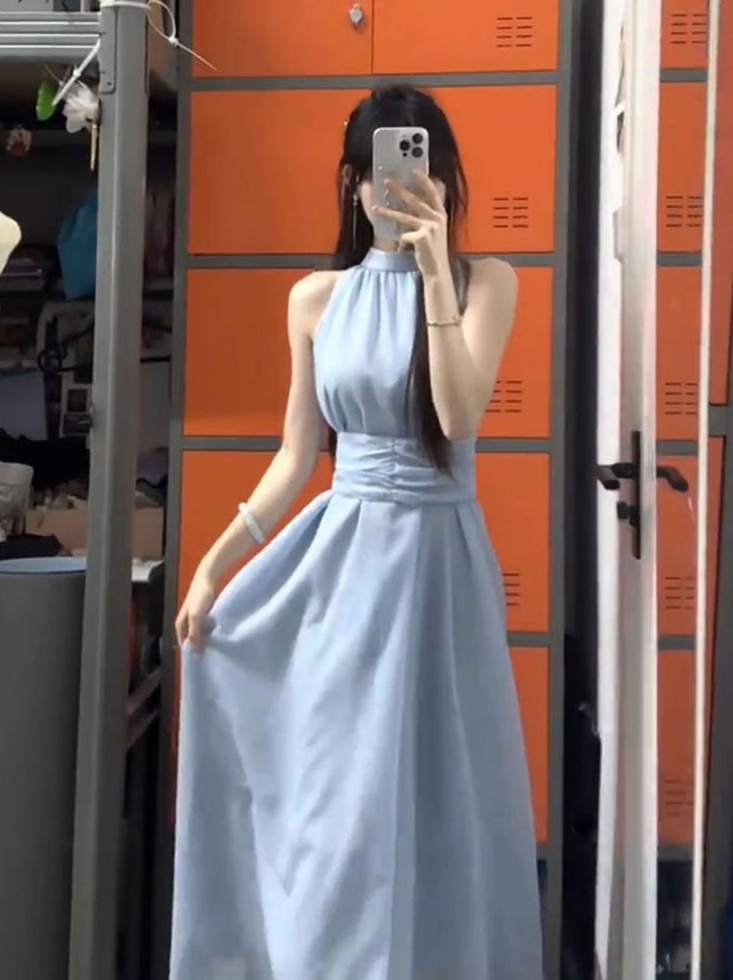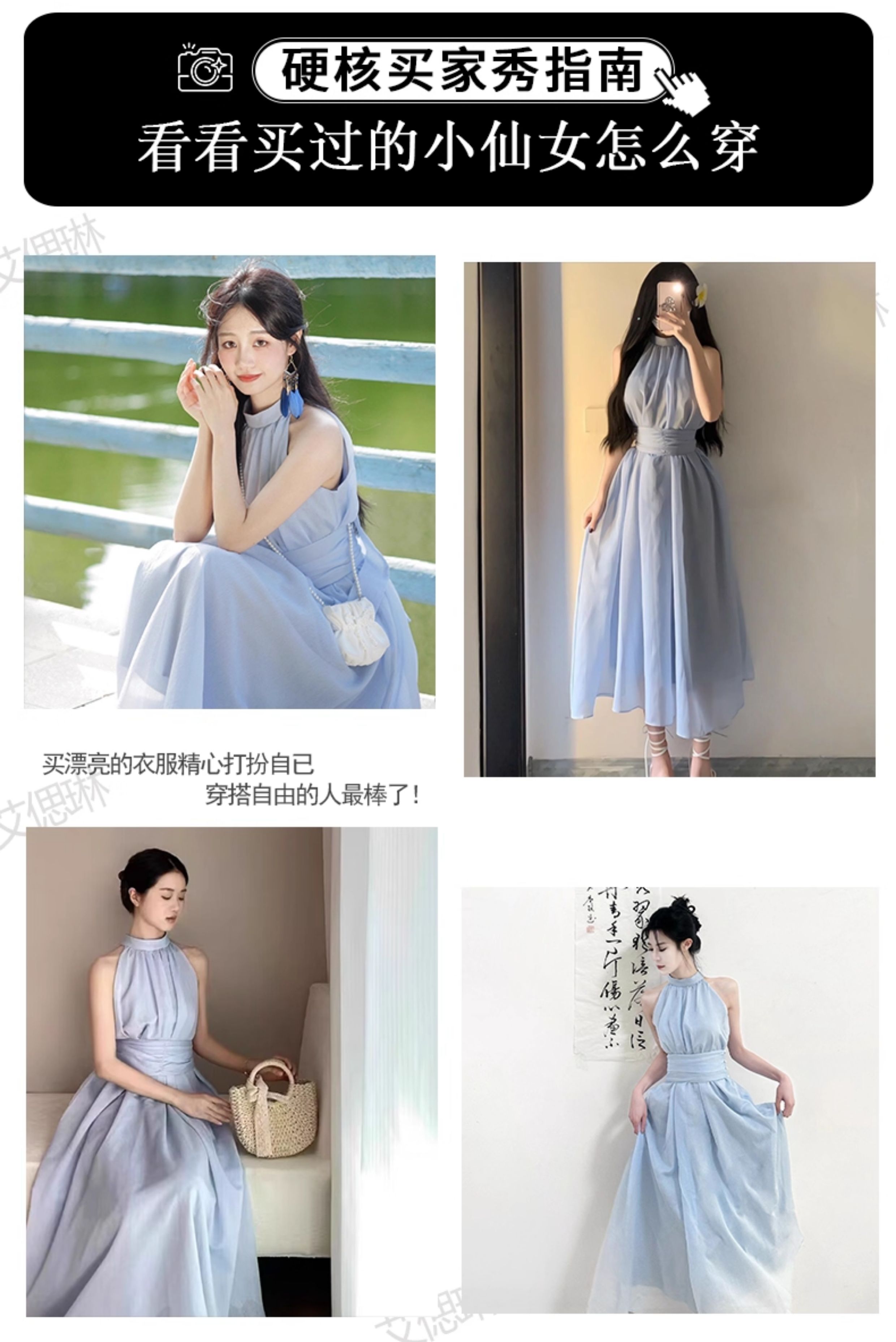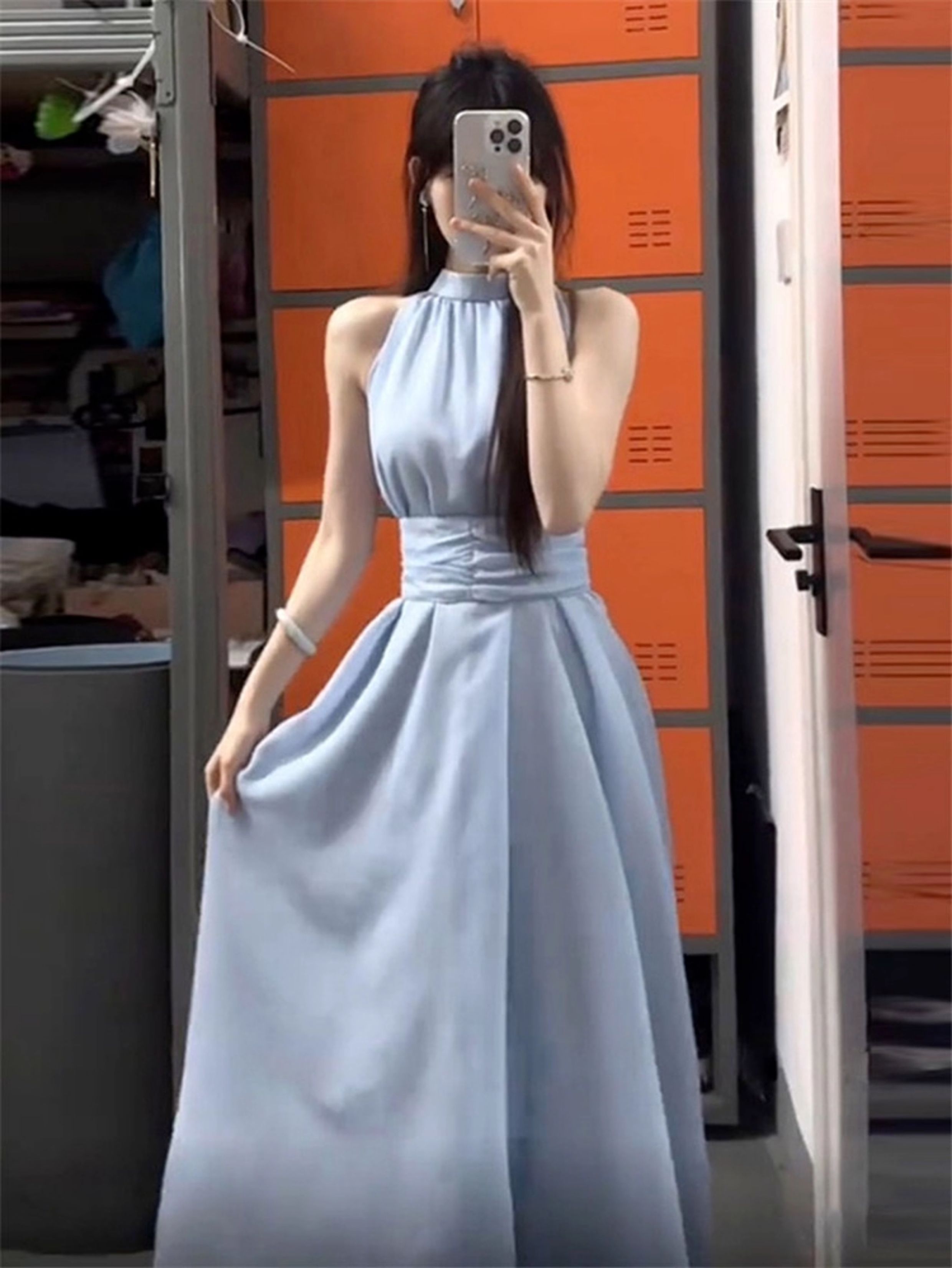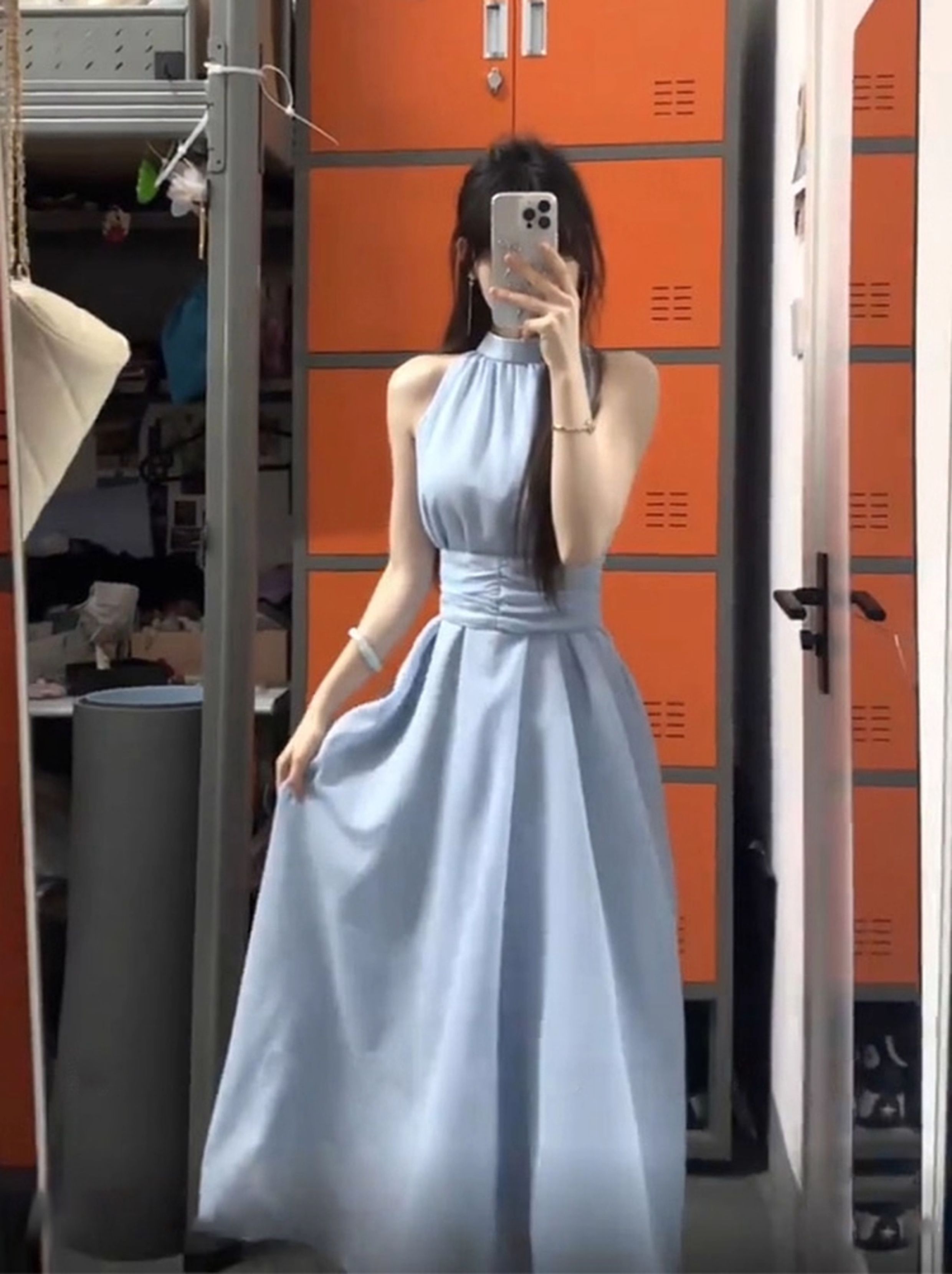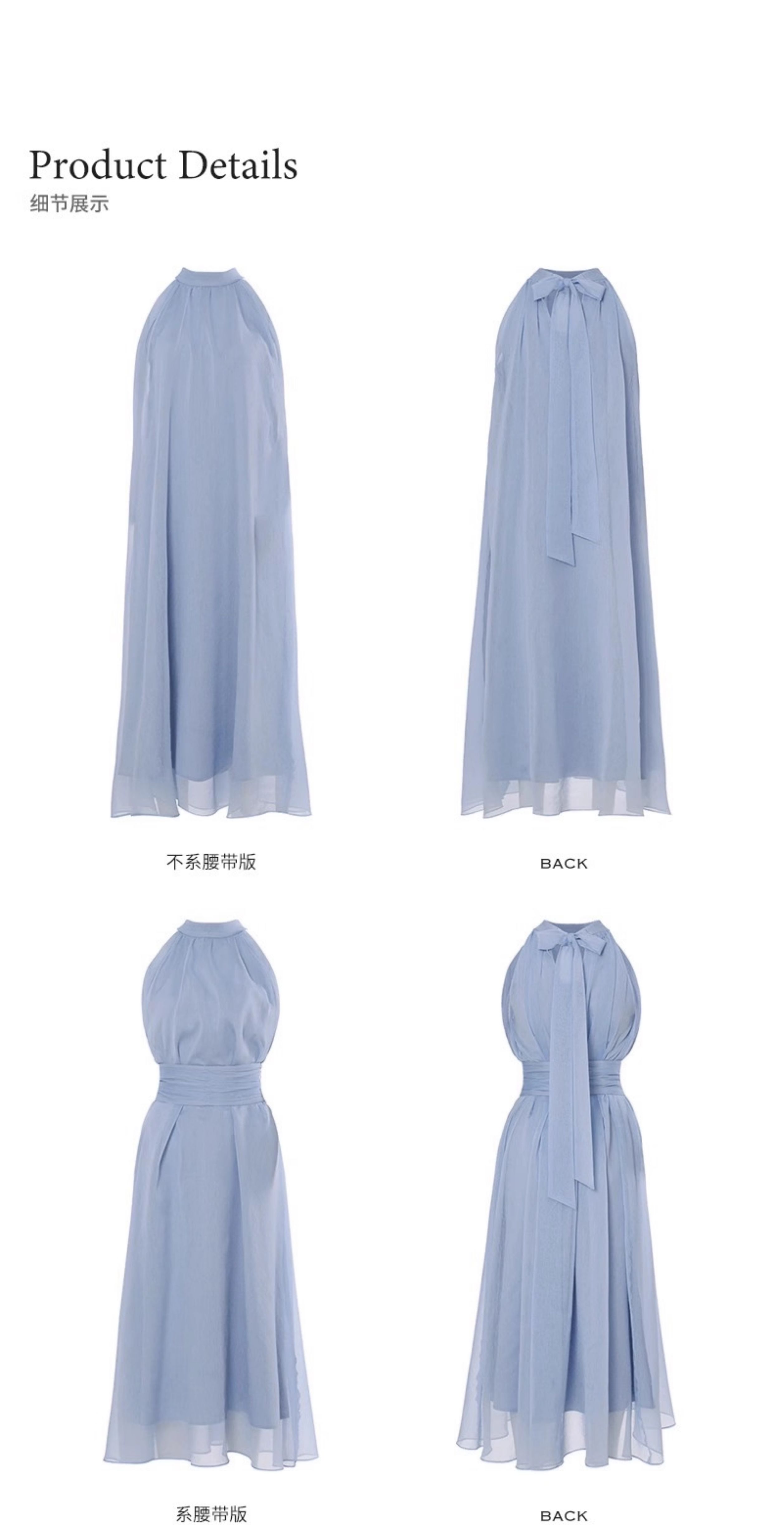 藍色法式無袖掛脖露肩連衣裙子女夏季2025新款氣質海邊小個子長裙