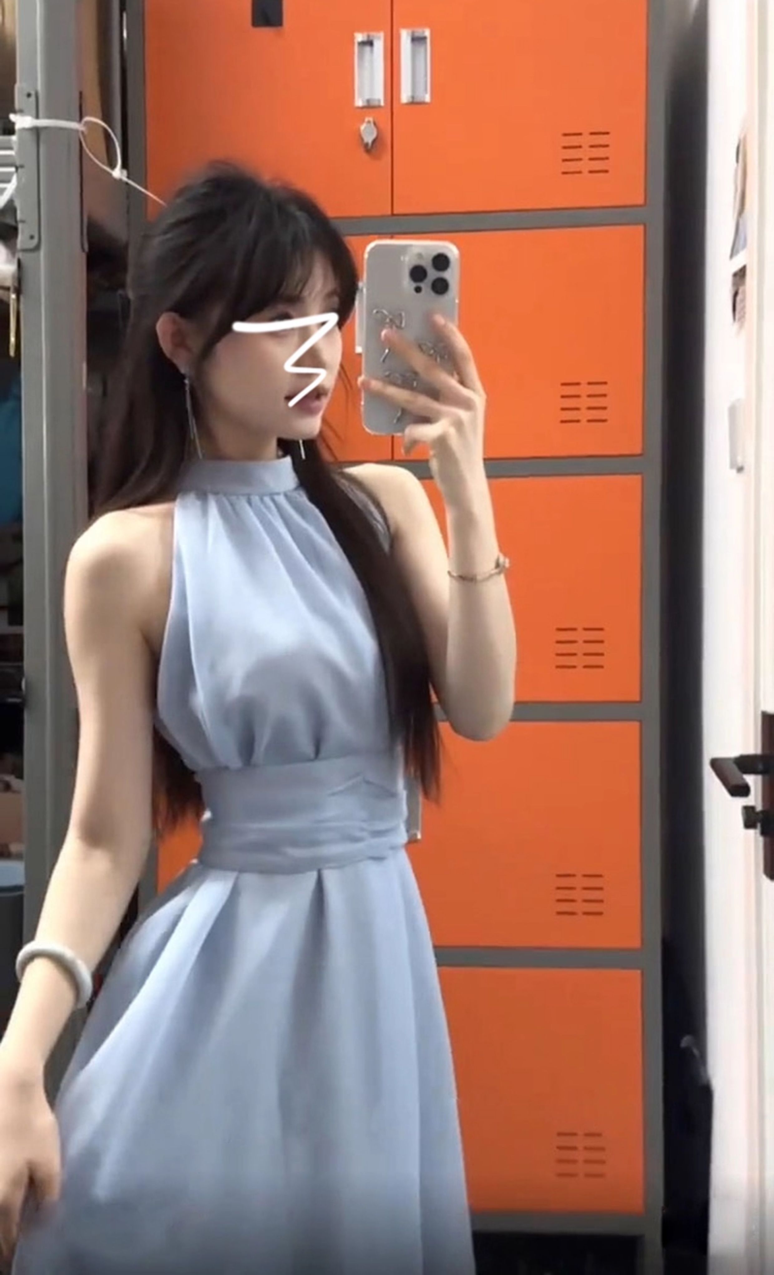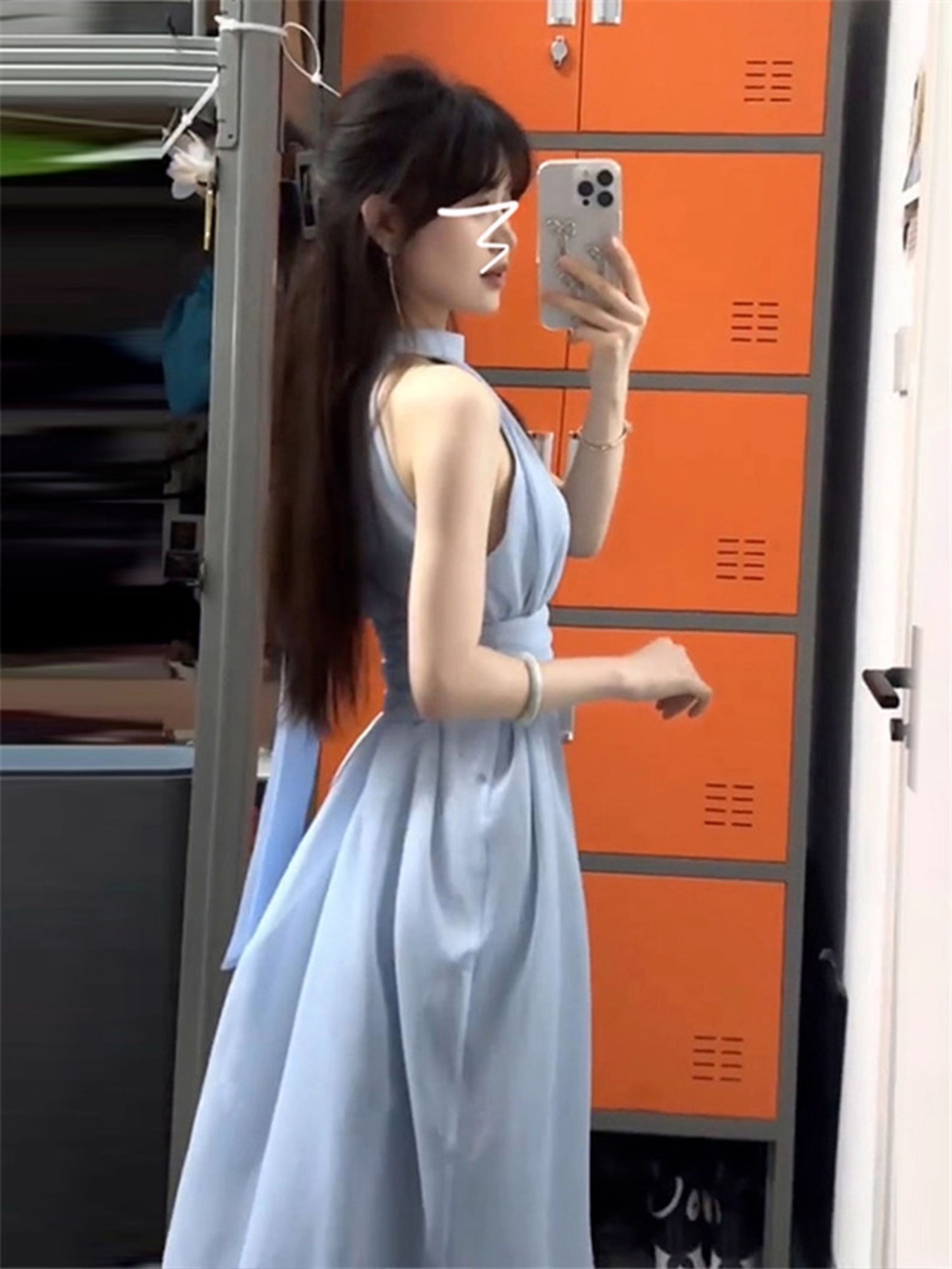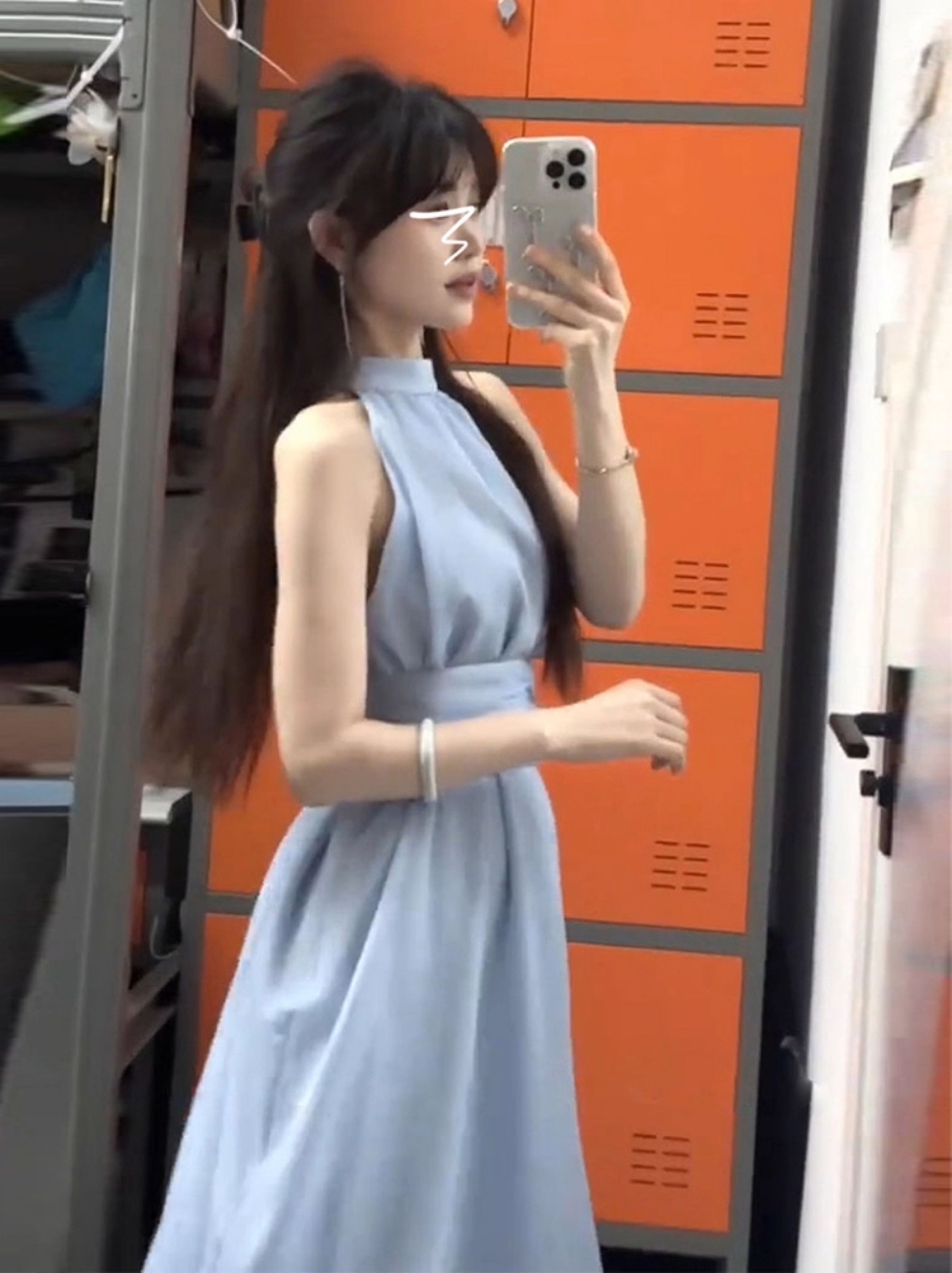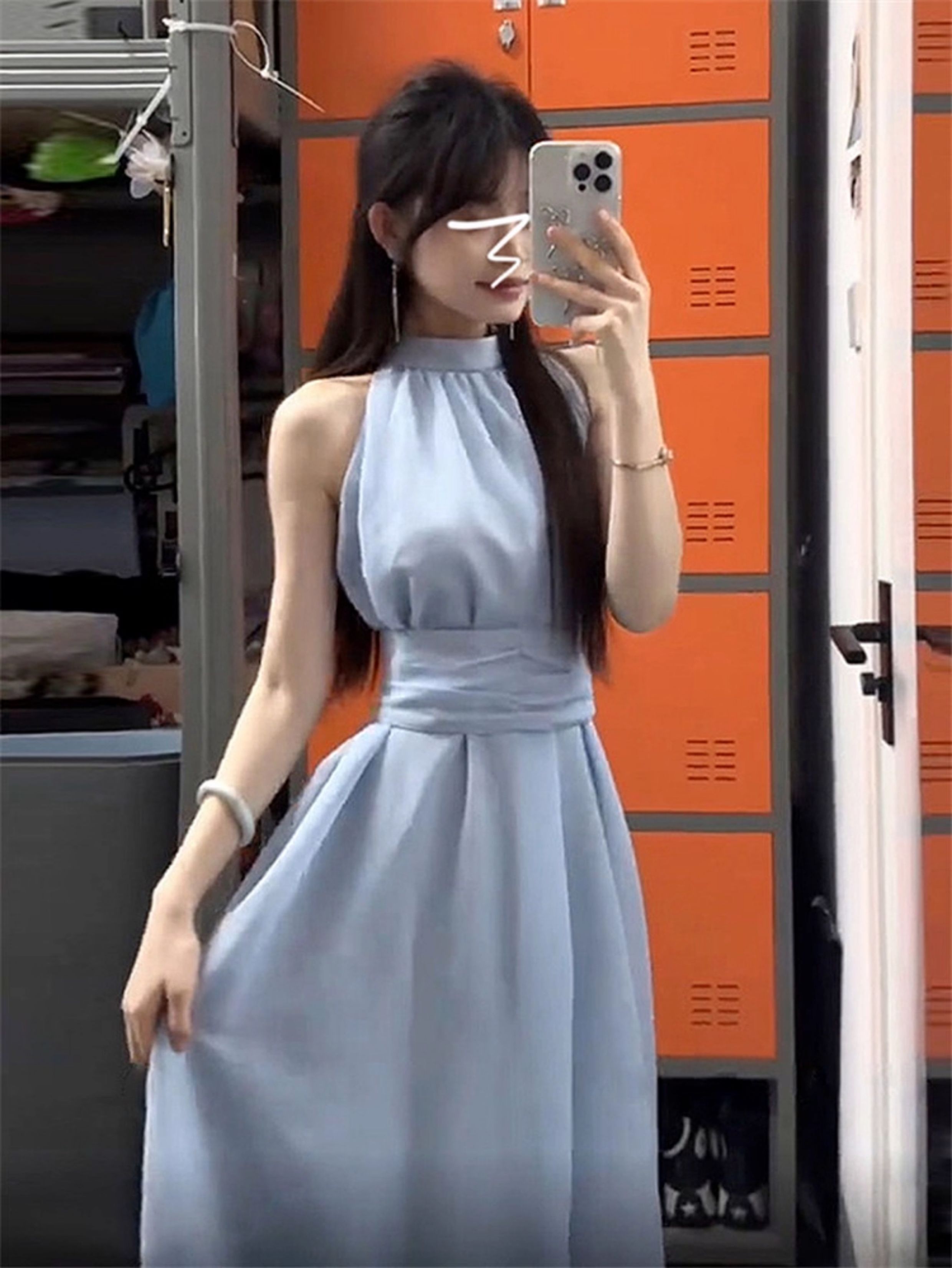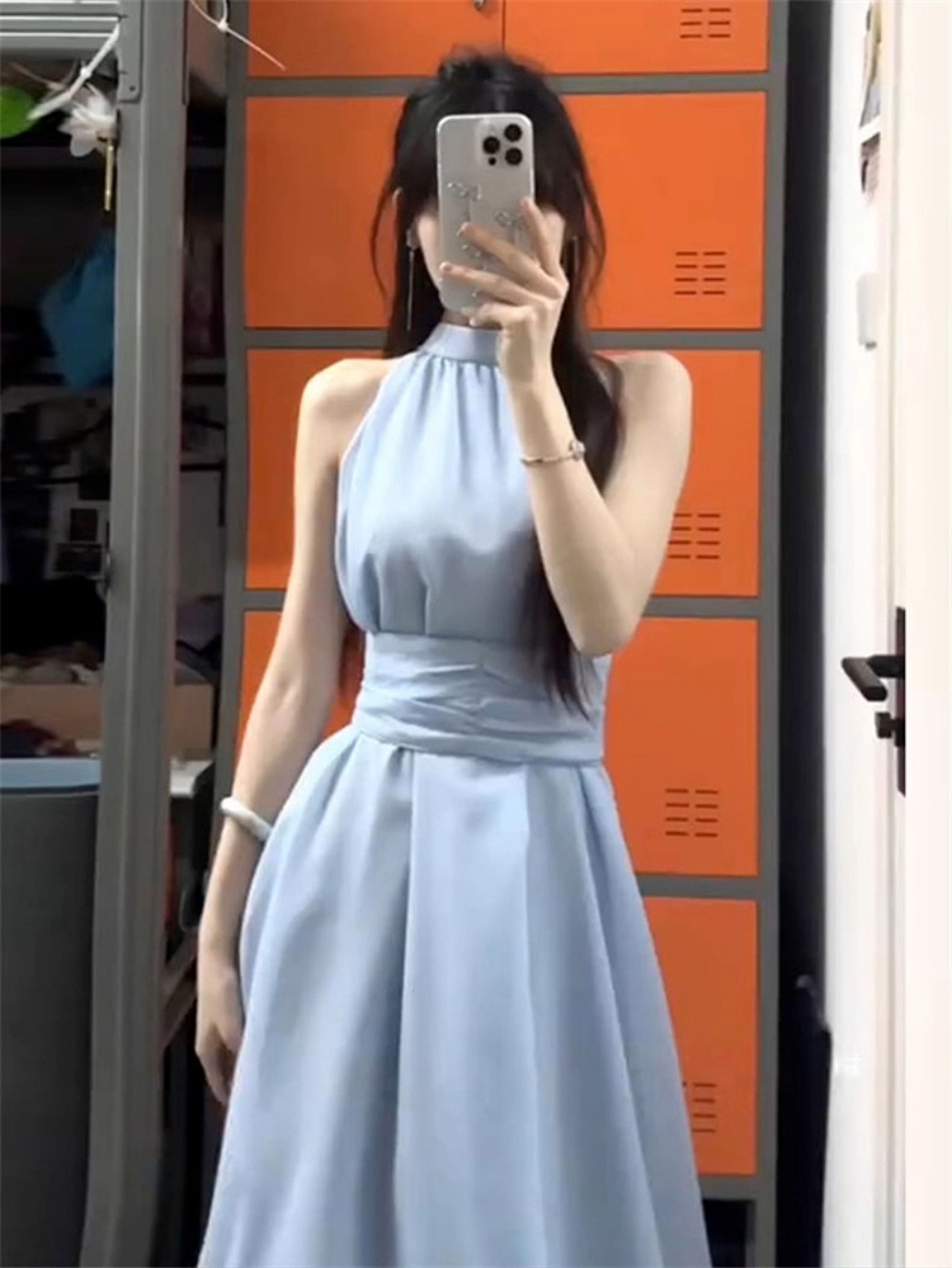 藍色法式無袖掛脖露肩連衣裙子女夏季2025新款氣質海邊小個子長裙