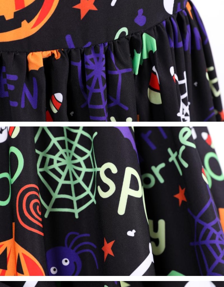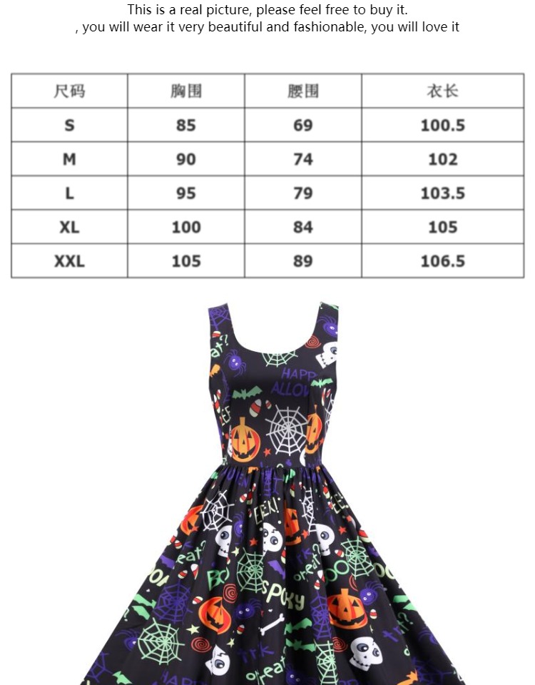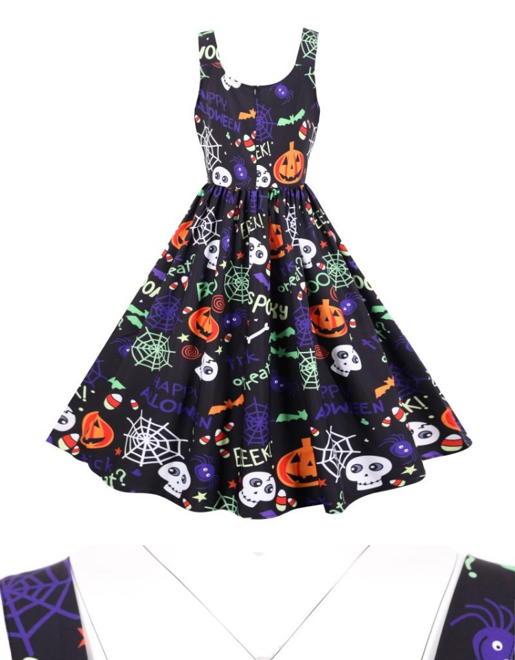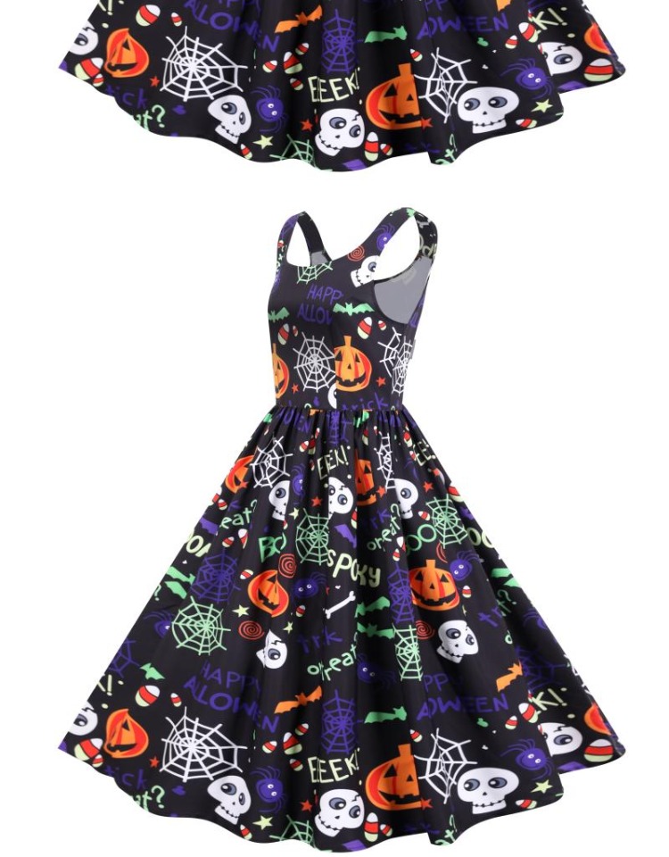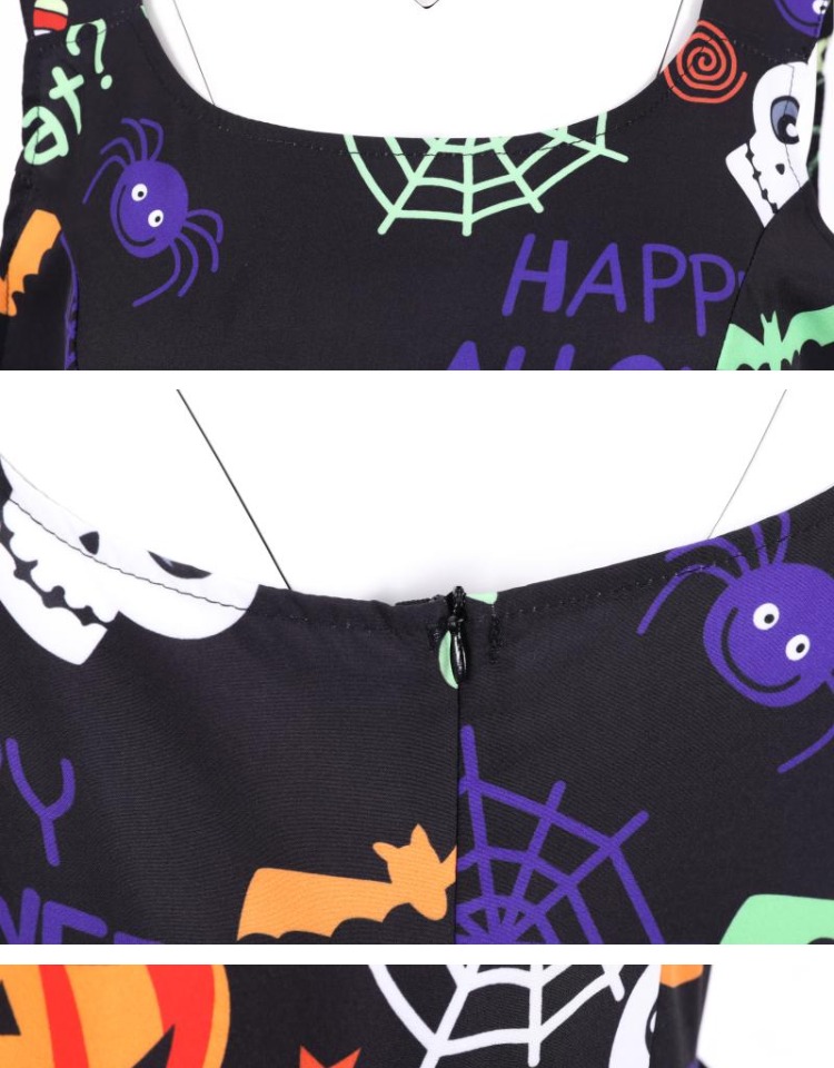 歐洲站萬聖節骷髏頭南瓜印花收腰顯瘦性感背帶無袖連衣裙女