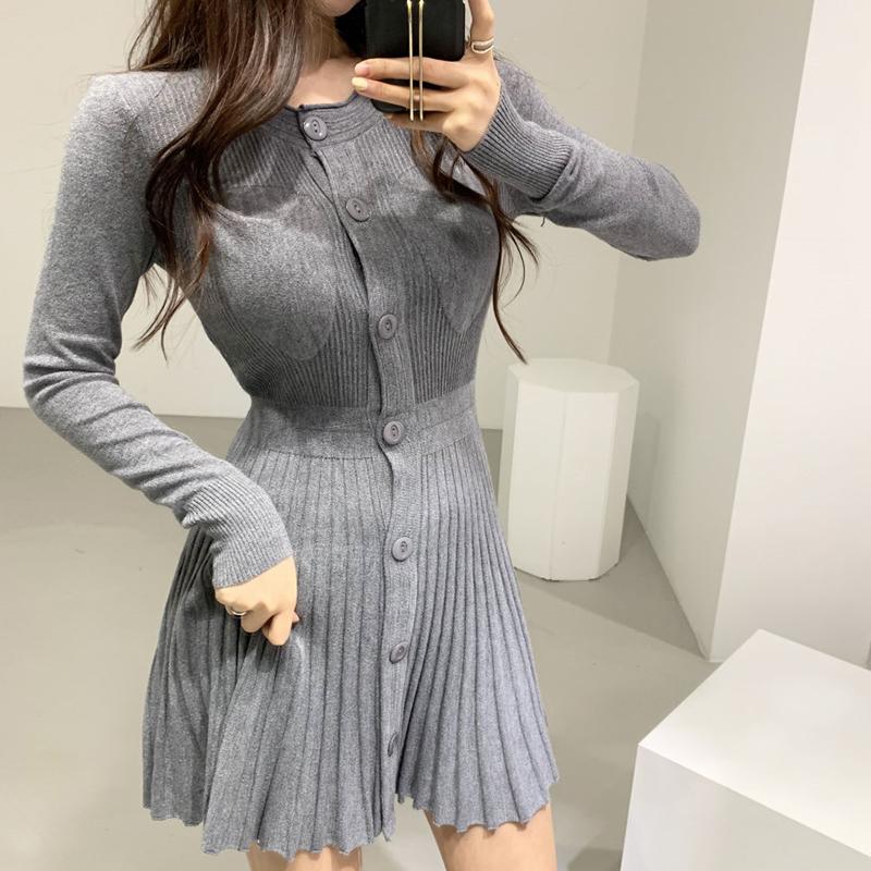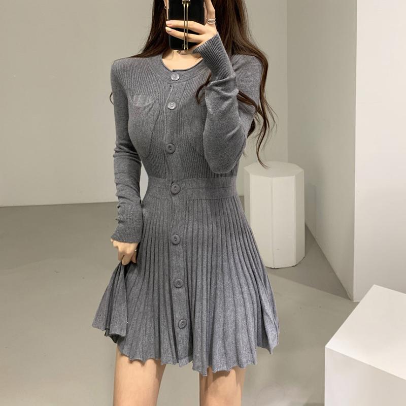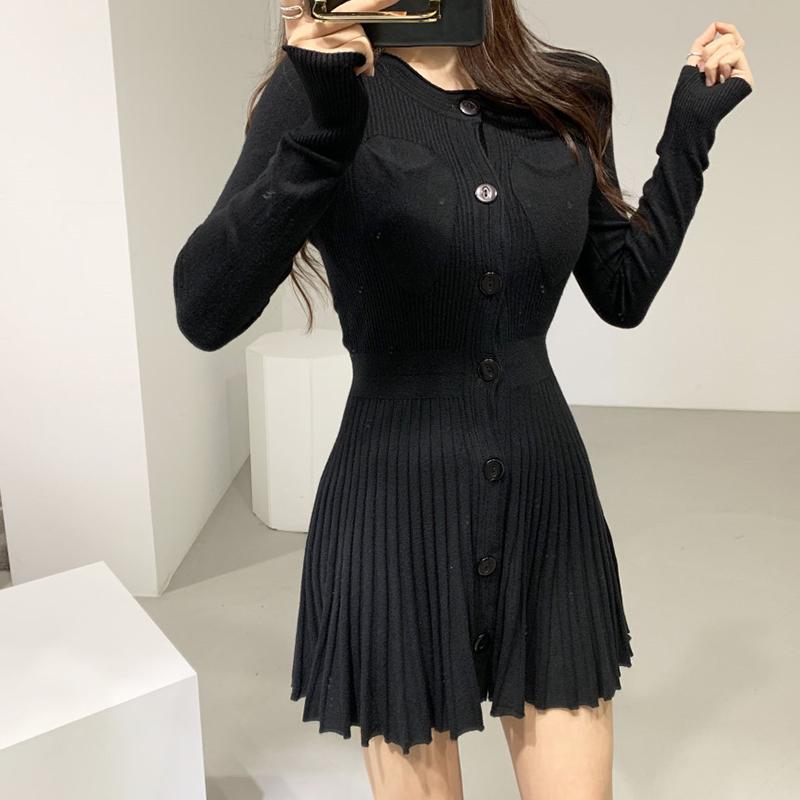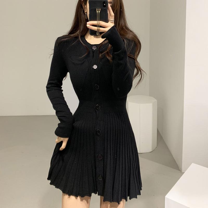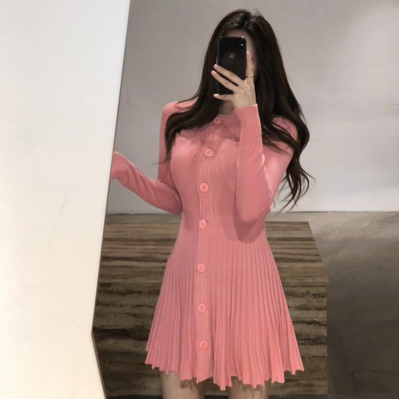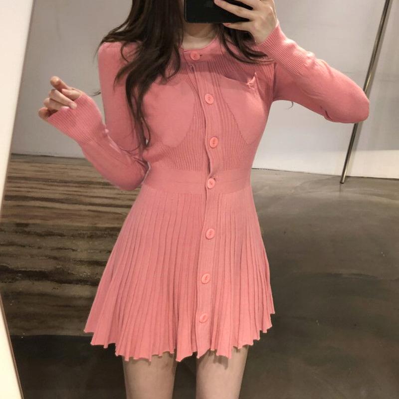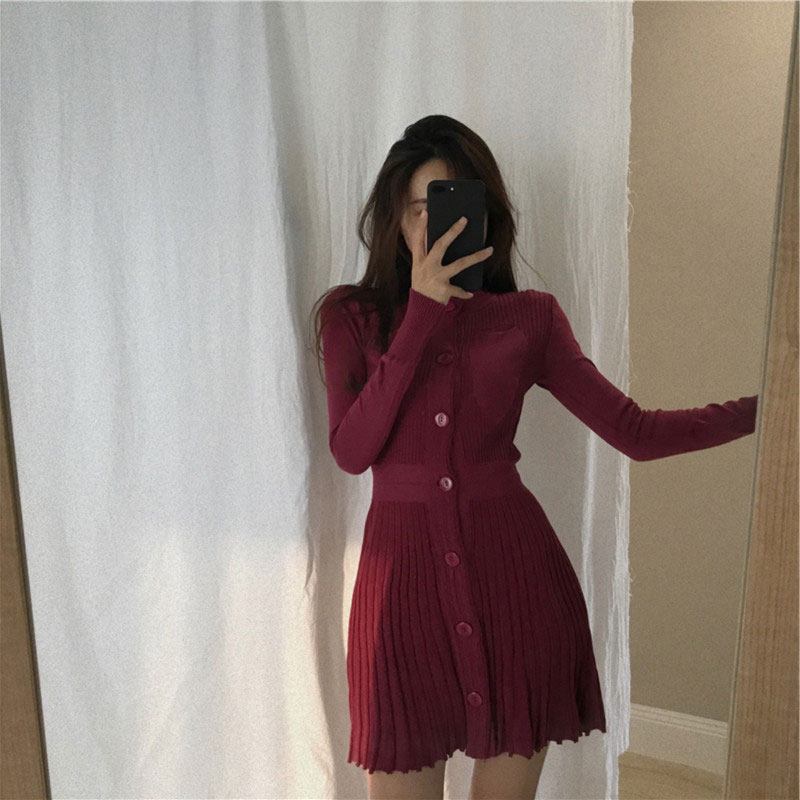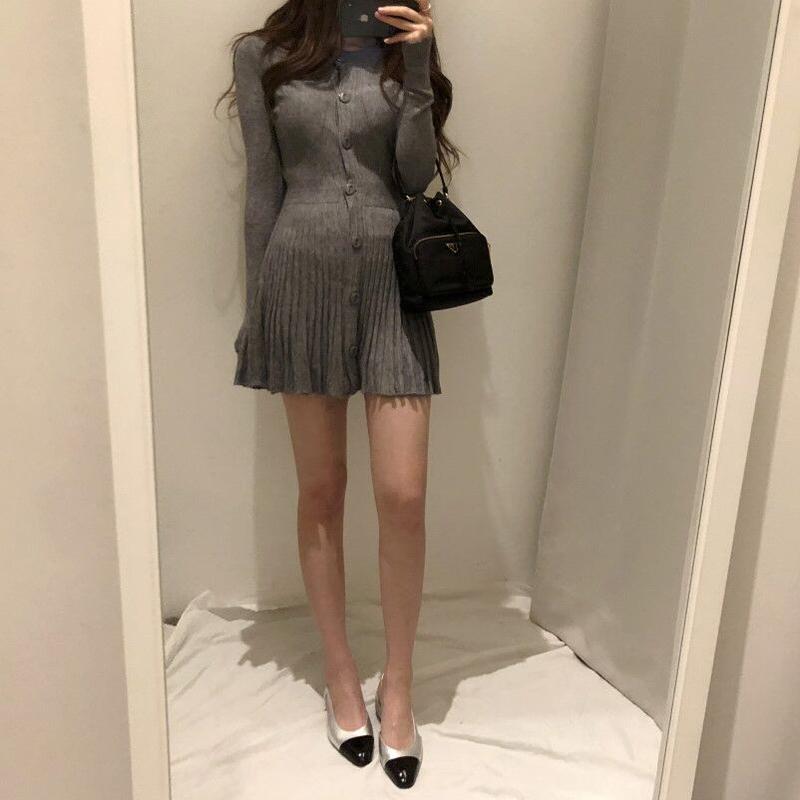 韓國chic復古網紅洋氣時尚修身顯瘦百搭毛針織打底連衣裙百褶短裙
