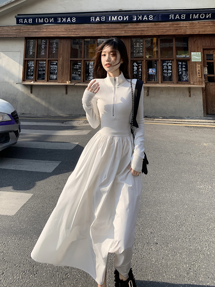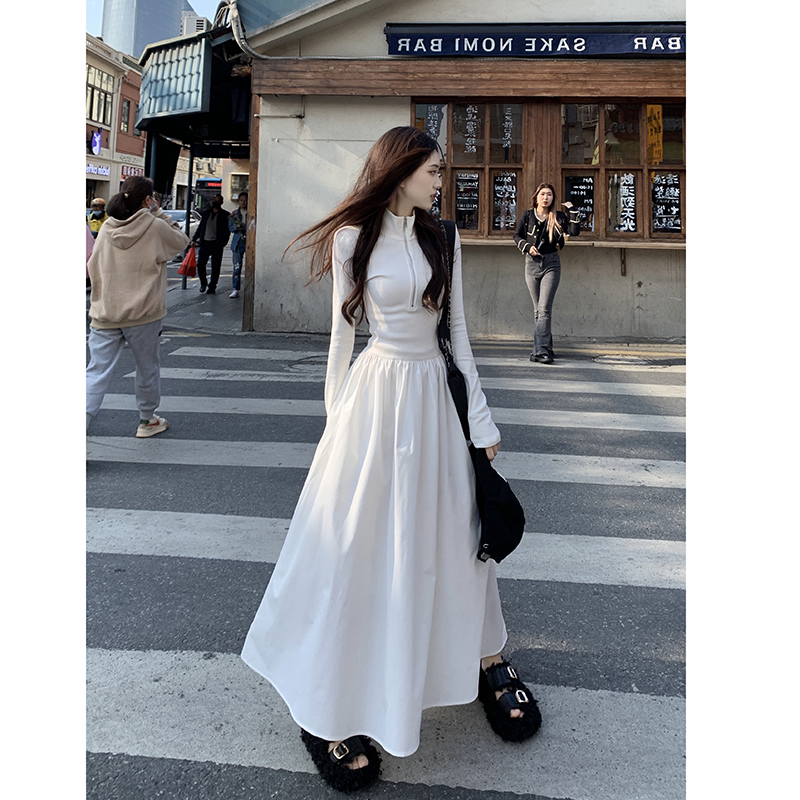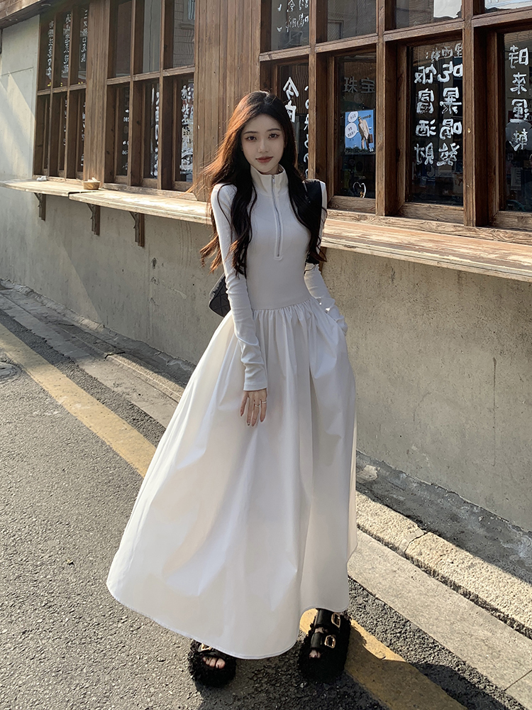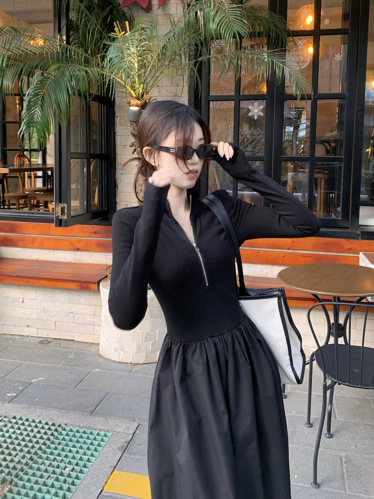 法式氣質立領長袖針織拼接連衣裙女早秋收腰顯瘦大擺裙A字長裙子