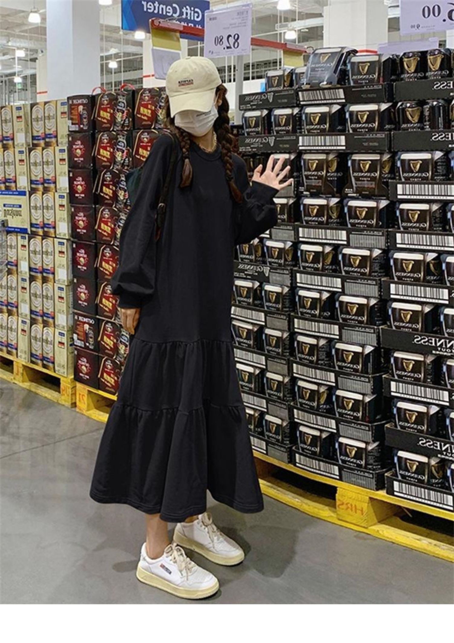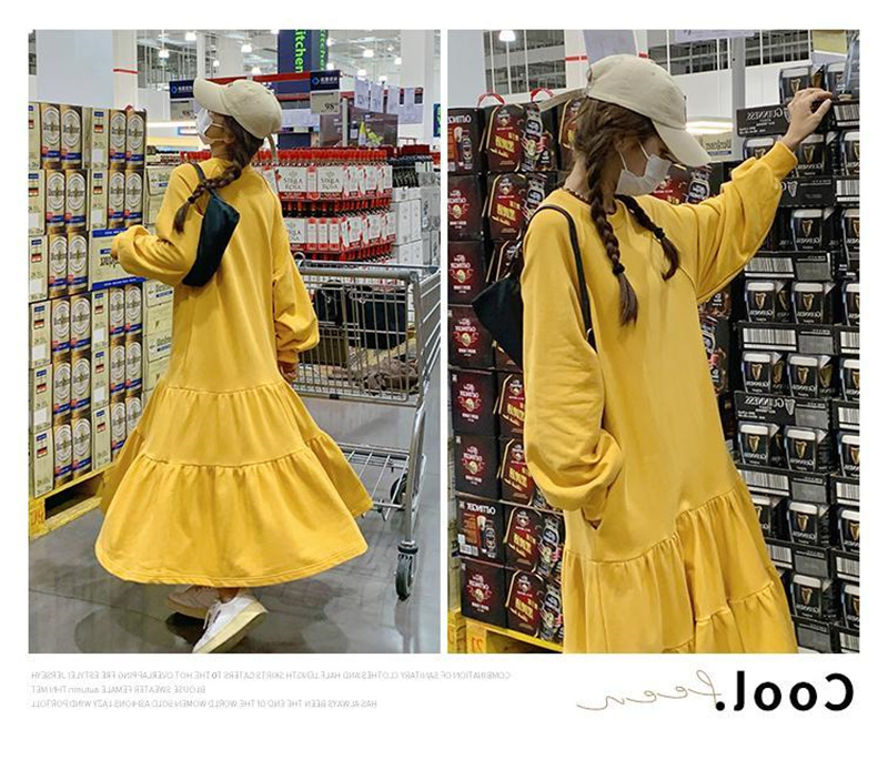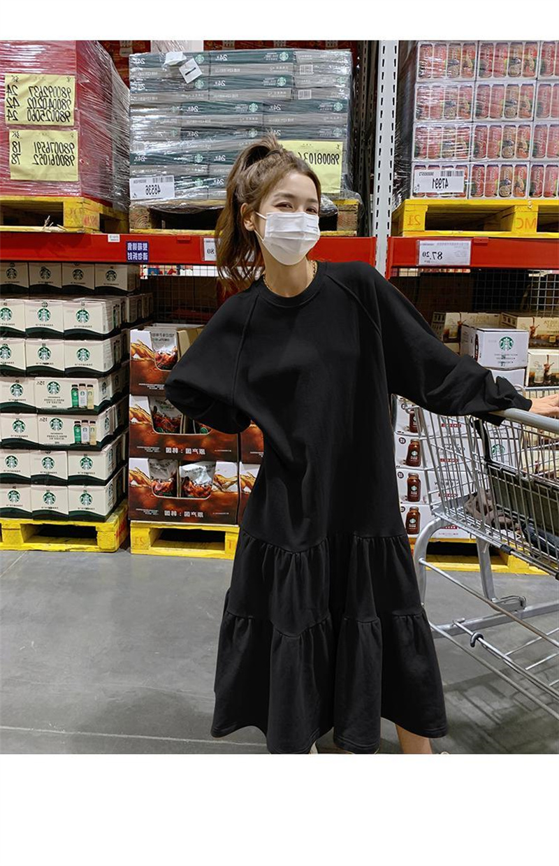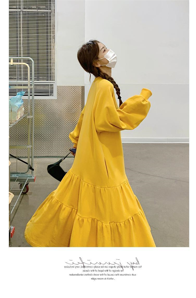 胖MM300斤春秋冬大碼長袖連衣裙女寬松遮肚加絨荷葉邊A字衛衣長裙