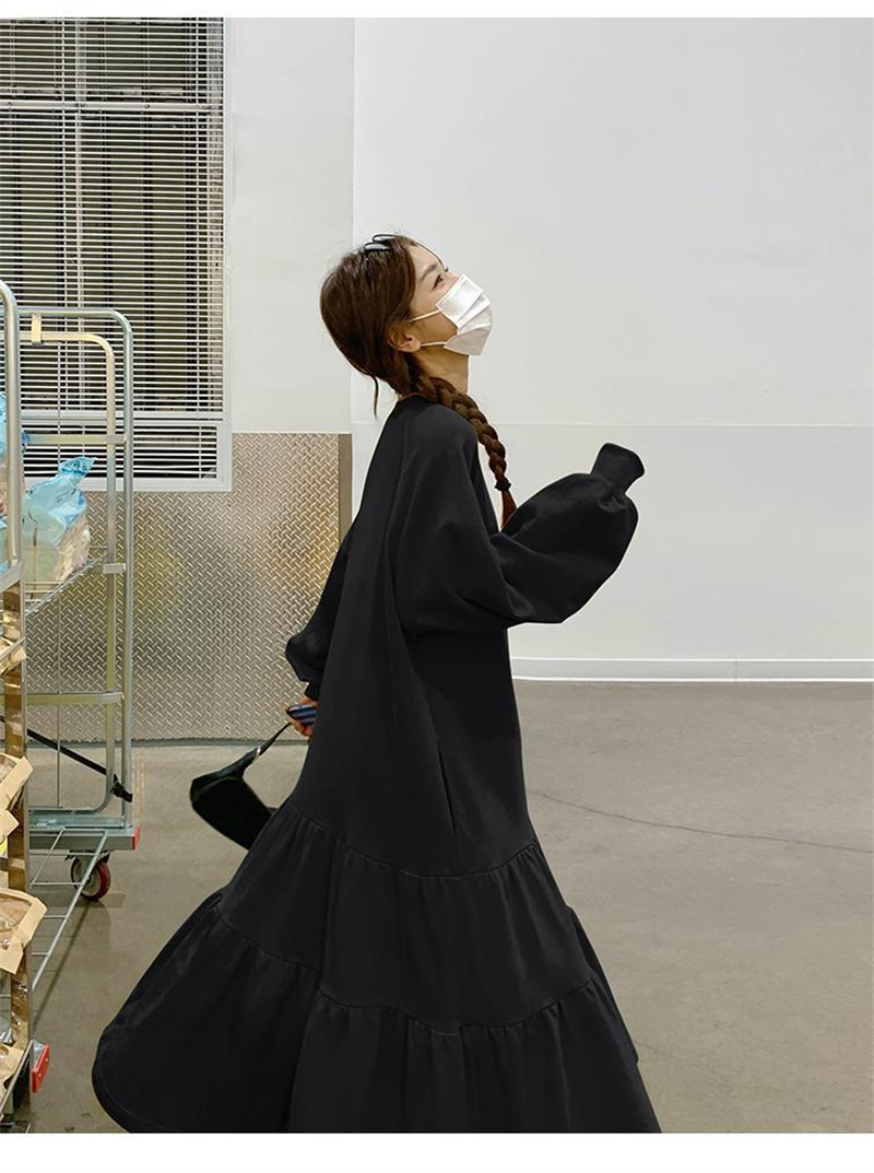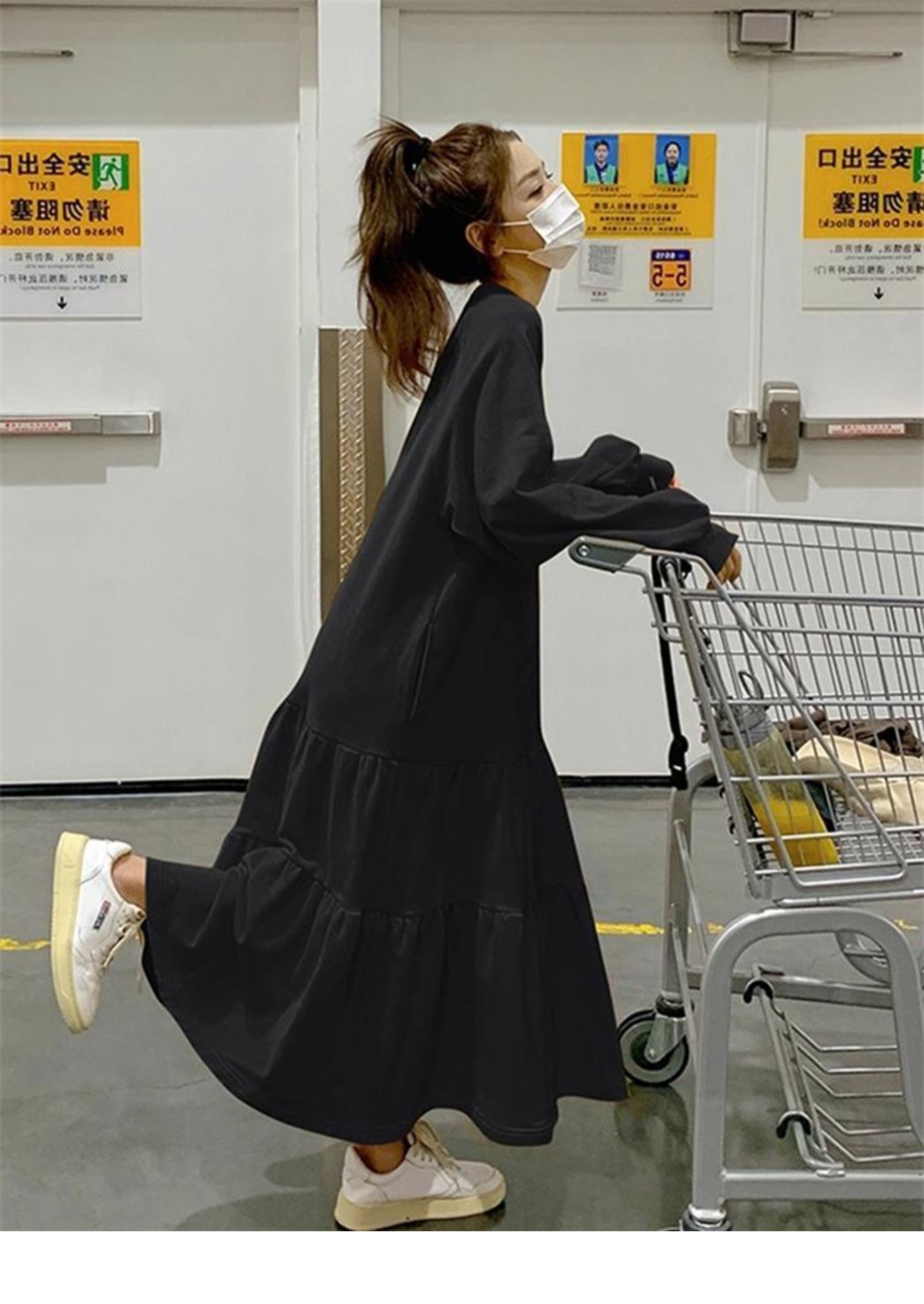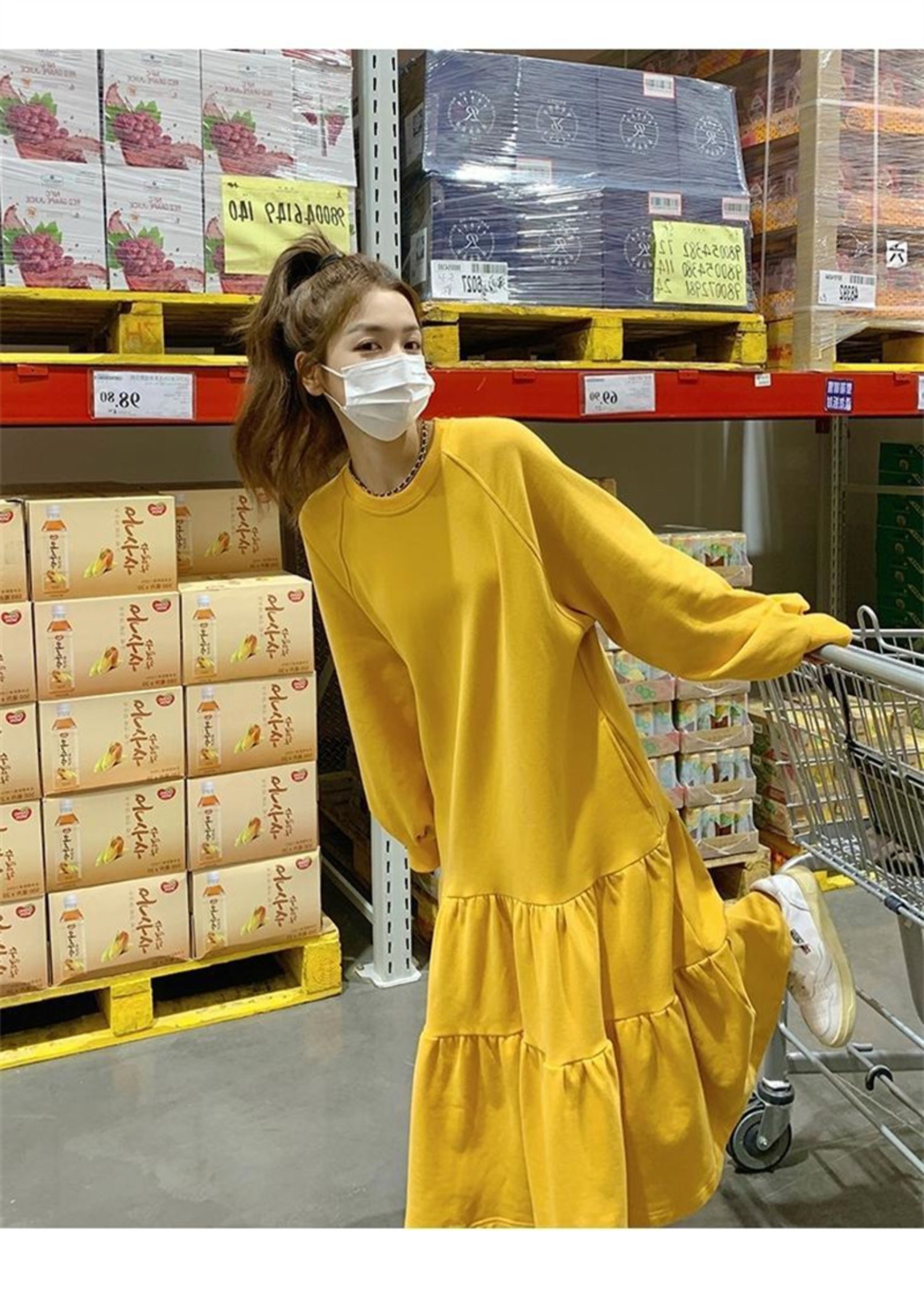 胖MM300斤春秋冬大碼長袖連衣裙女寬松遮肚加絨荷葉邊A字衛衣長裙