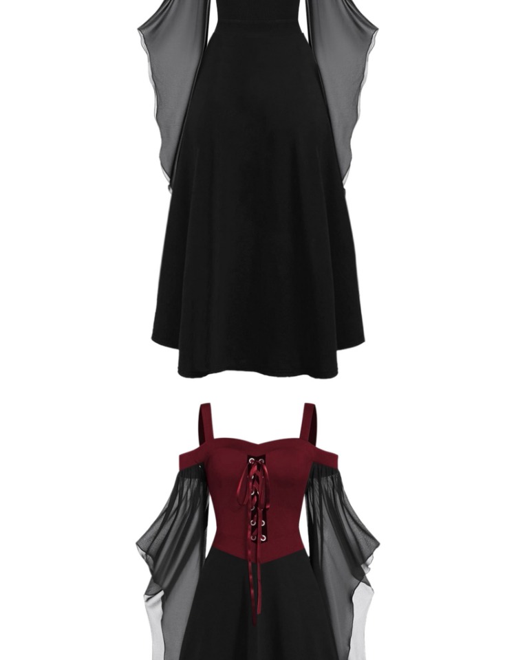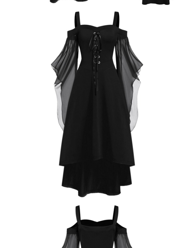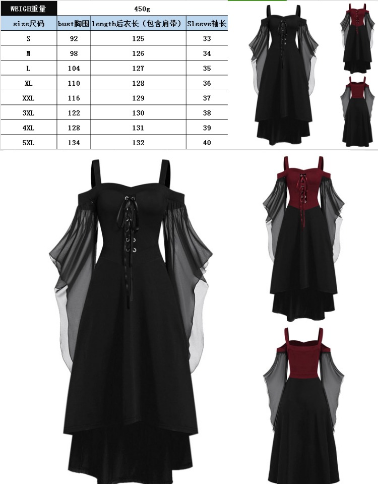 歐洲大碼復古一字領哥特式大擺袖不規則萬聖節女巫吊帶綁帶連衣裙