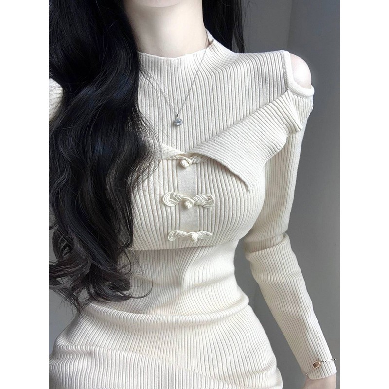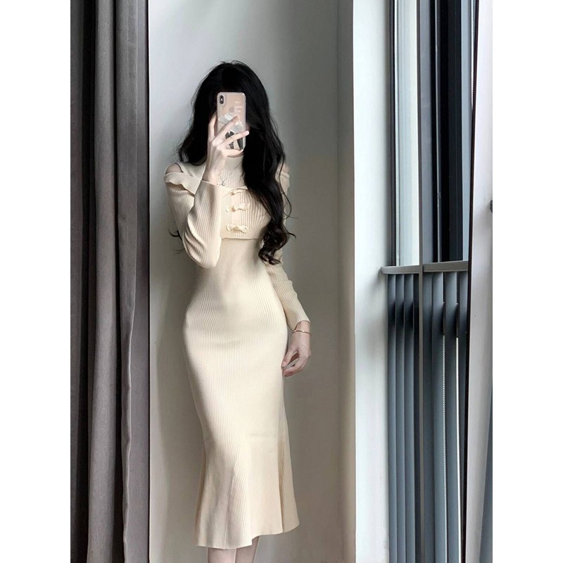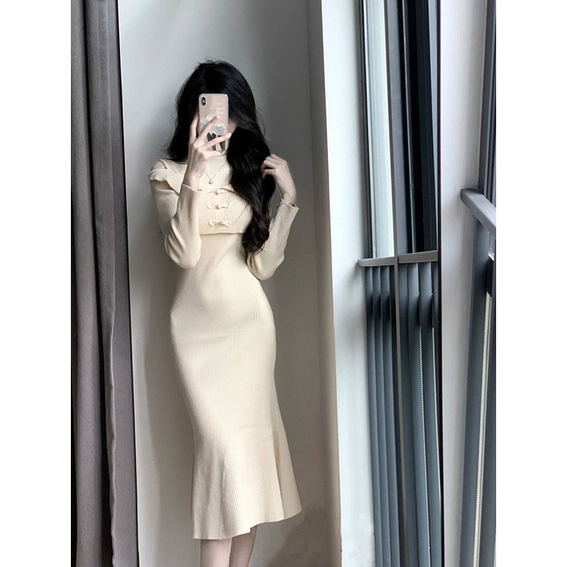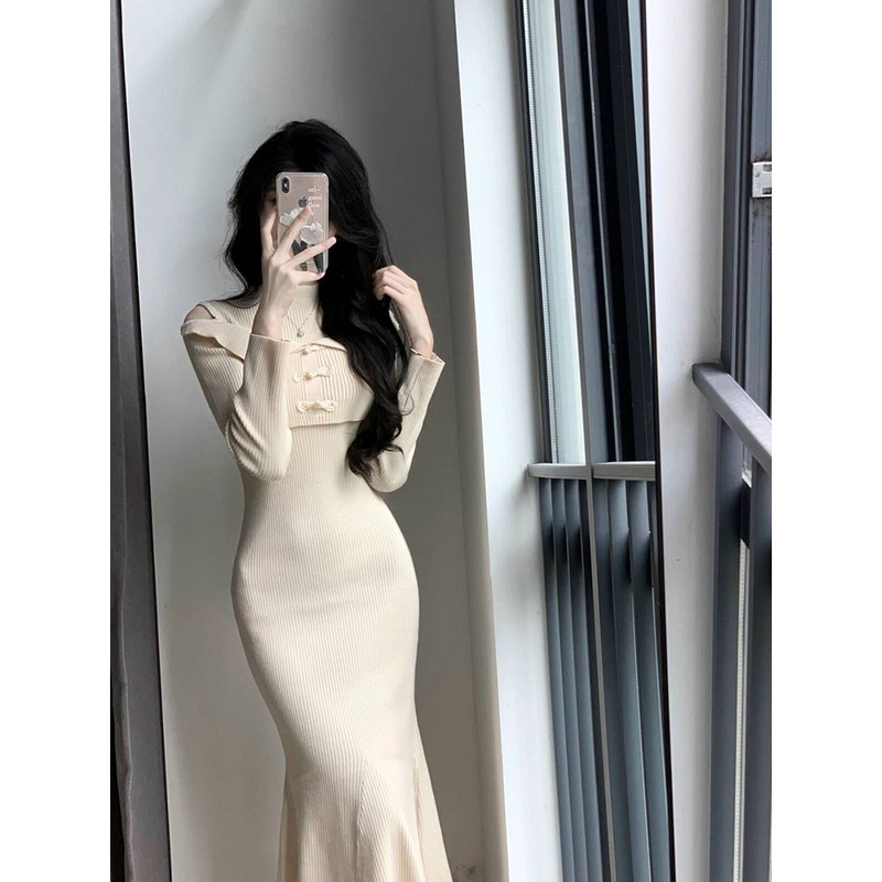 假兩件旗袍針織連衣裙子女修身氣質設計感打底內搭魚尾長裙春秋季