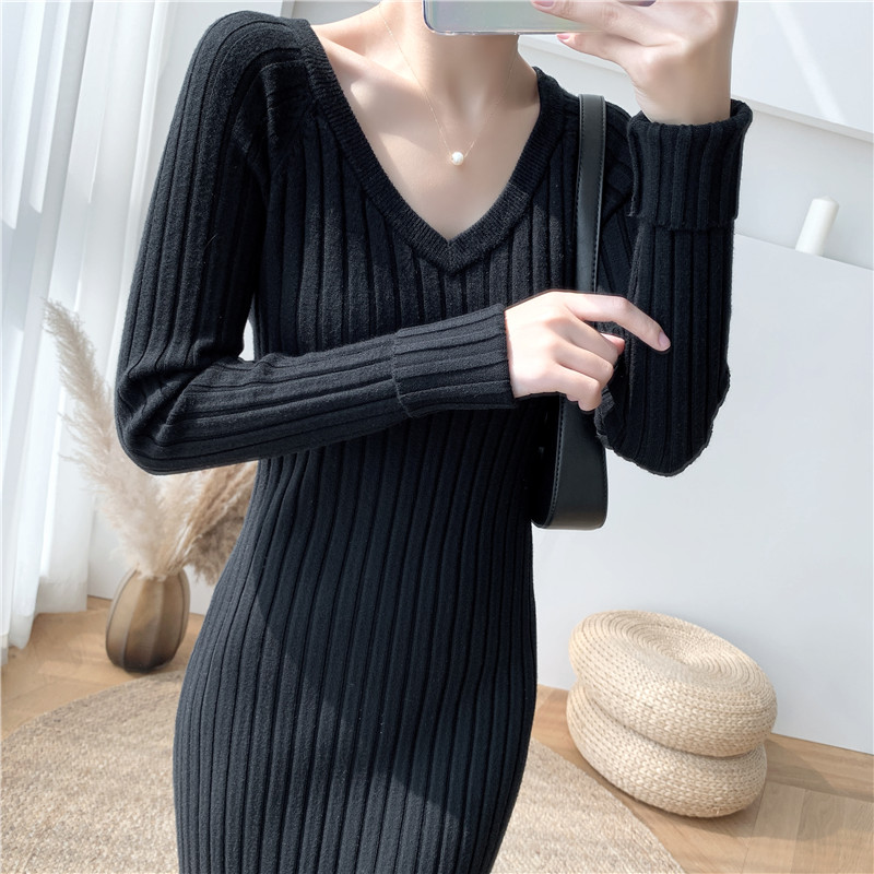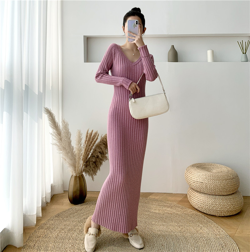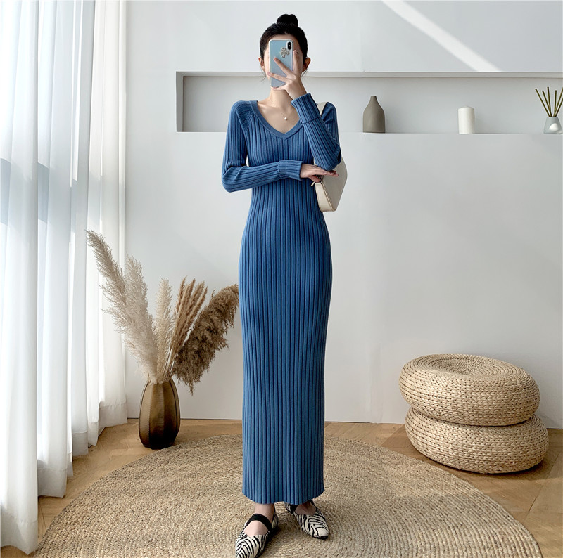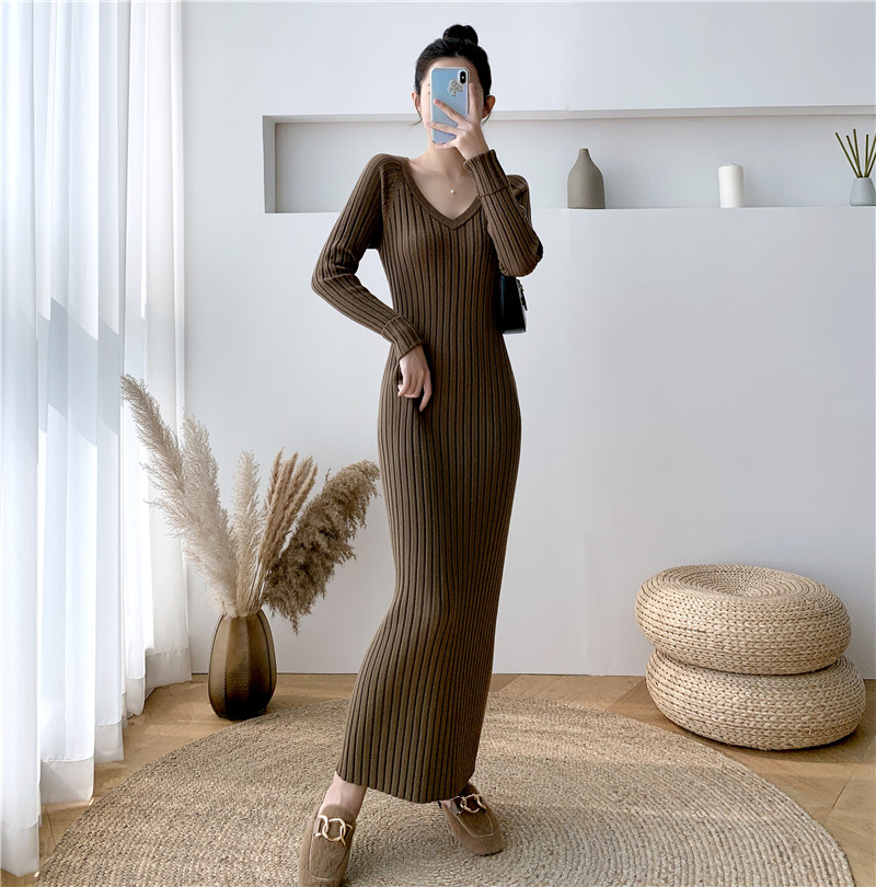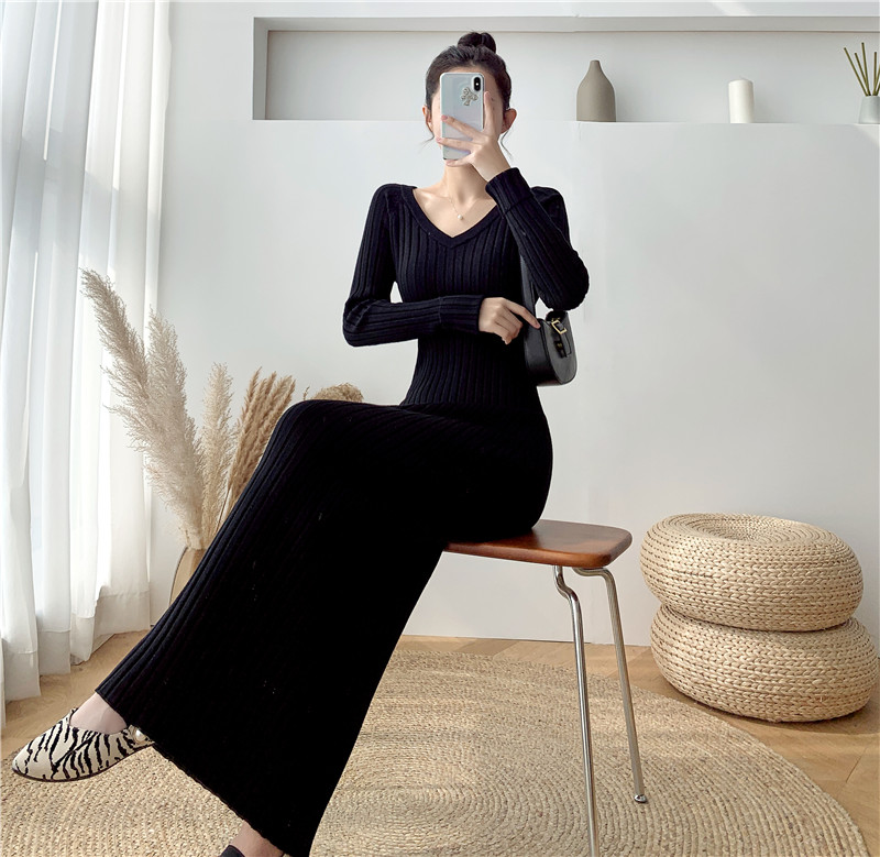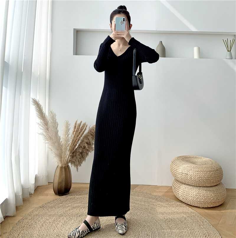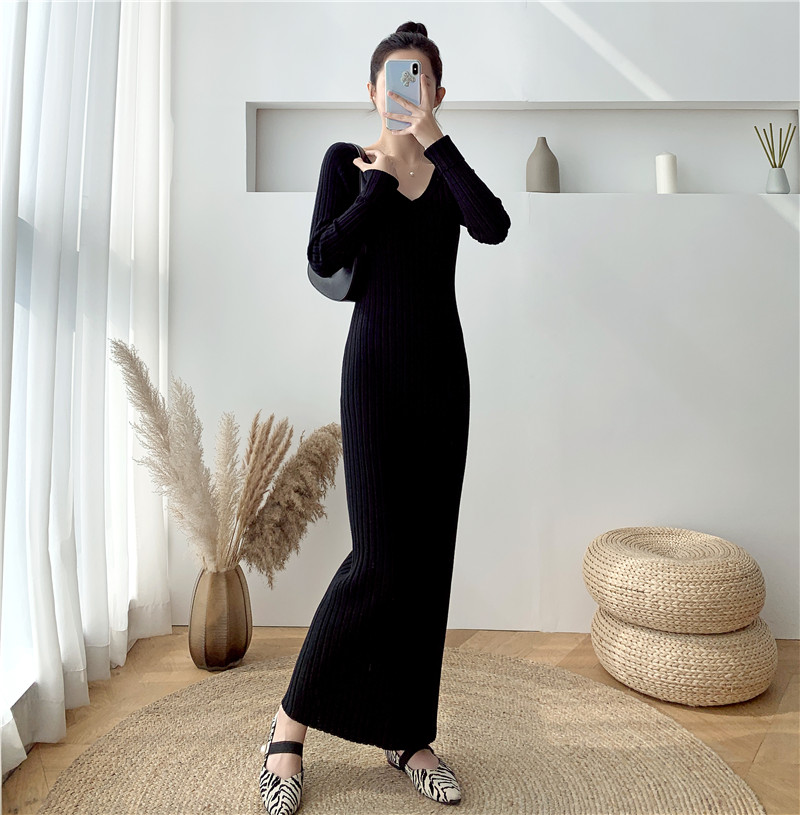 超長款V領針織連衣裙女 秋冬修身包臀打底衫內搭針織毛衣過膝長裙