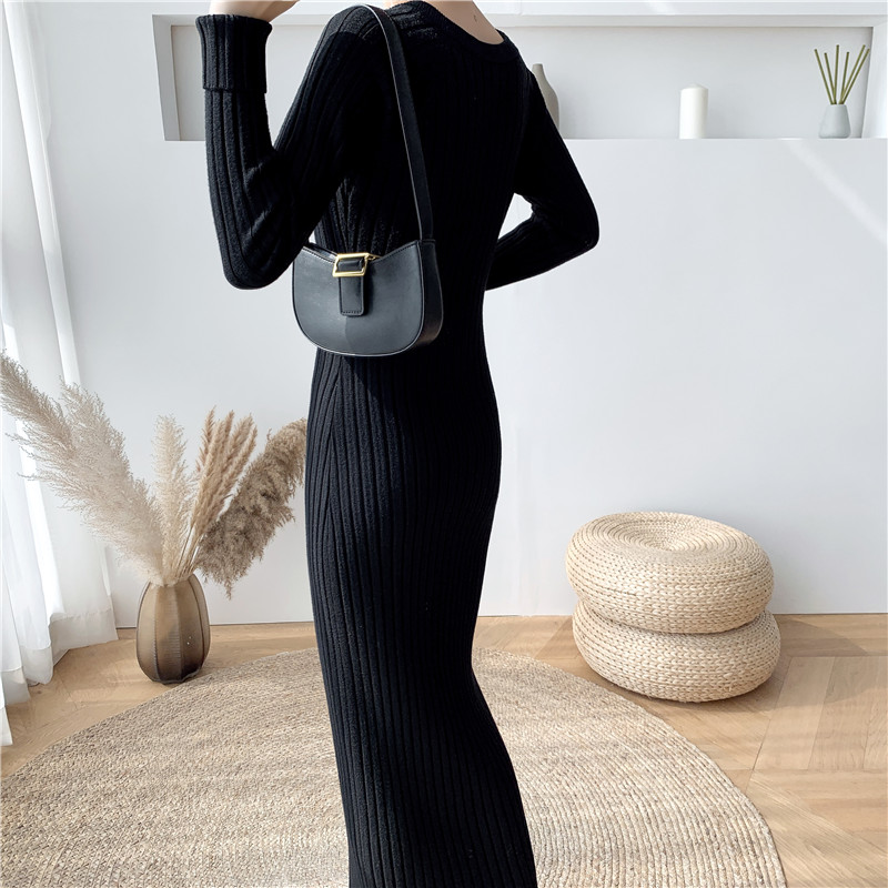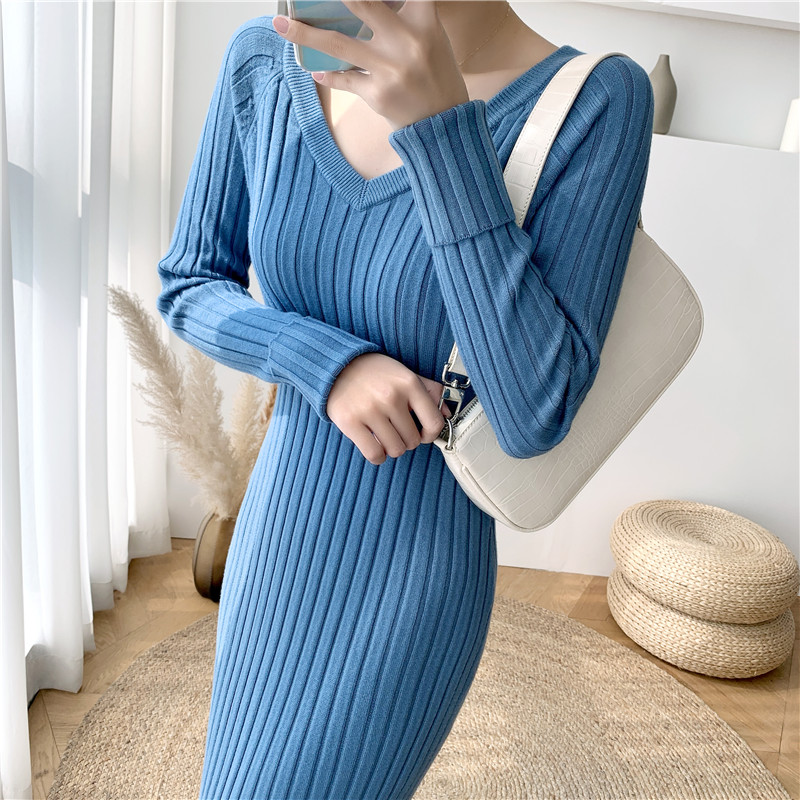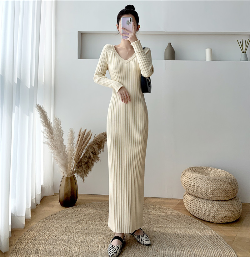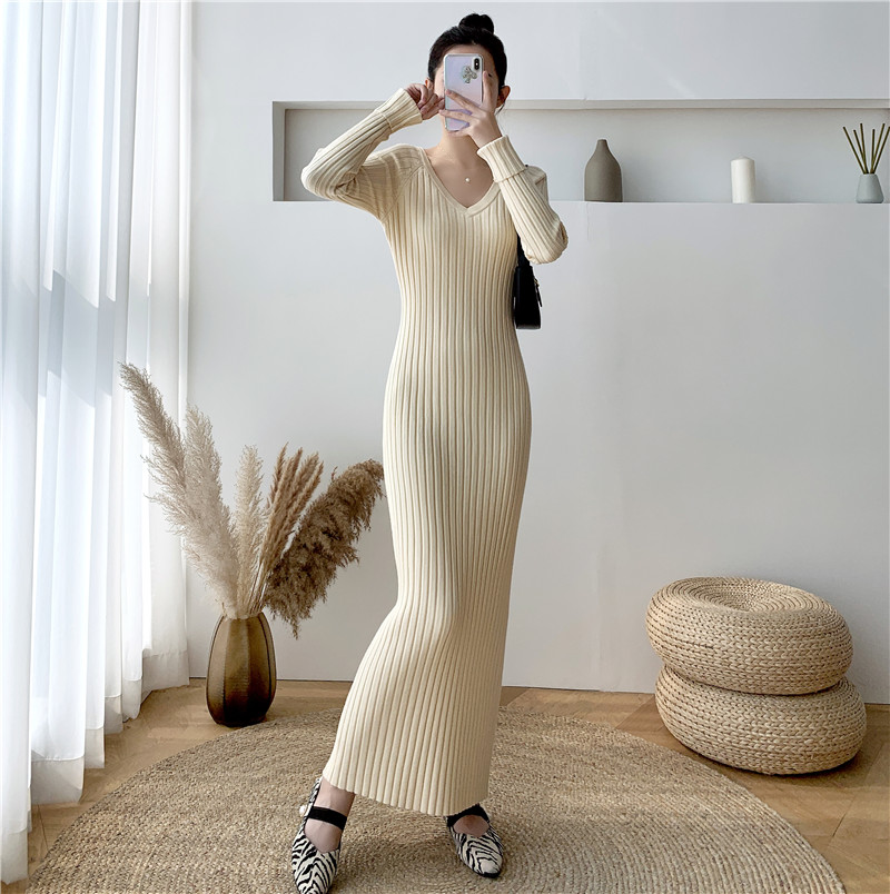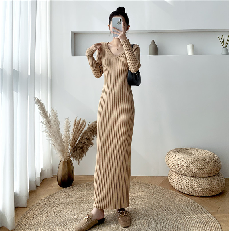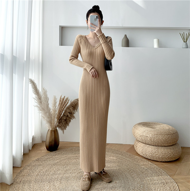 超長款V領針織連衣裙女 秋冬修身包臀打底衫內搭針織毛衣過膝長裙