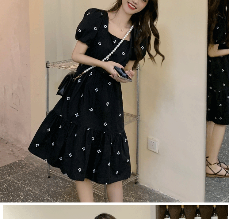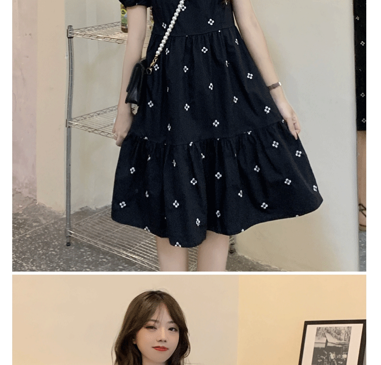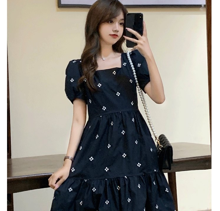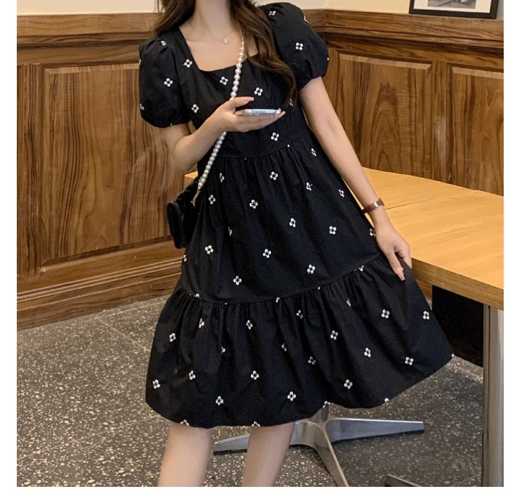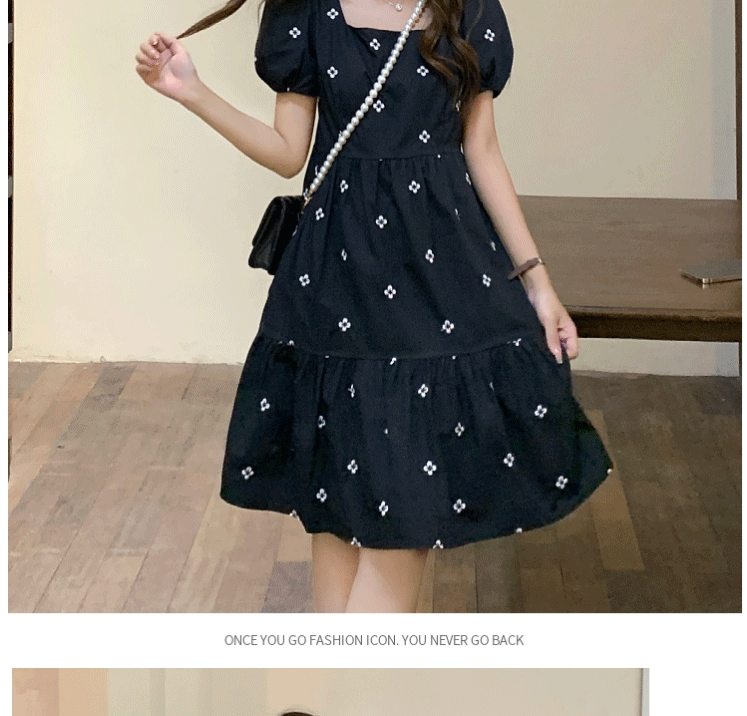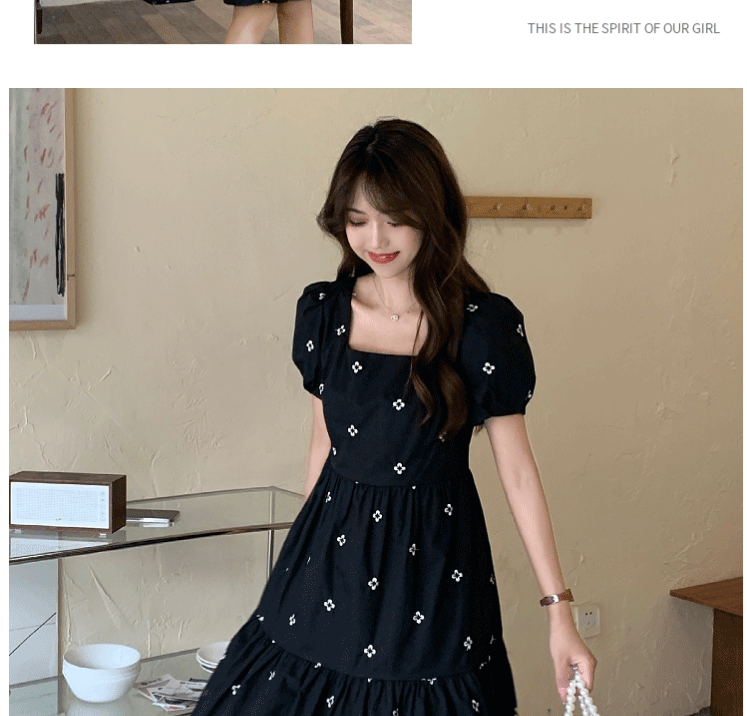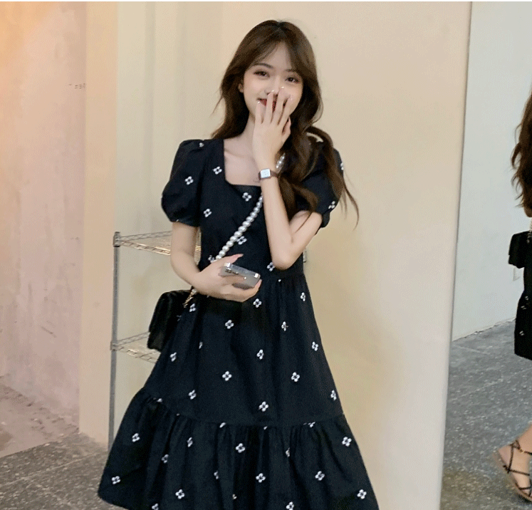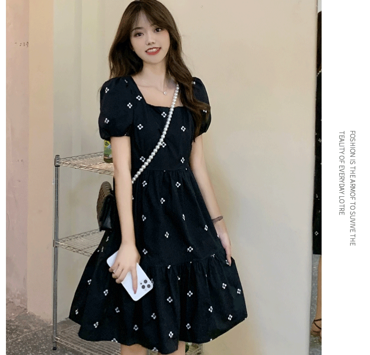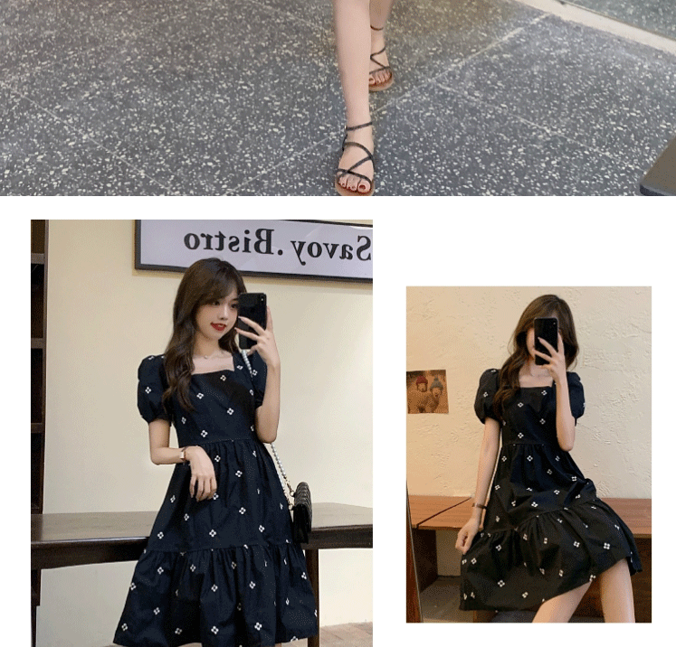 大碼女裝法式復古方領顯瘦小黑裙女夏季胖mm遮肚子收腰減齡連衣裙