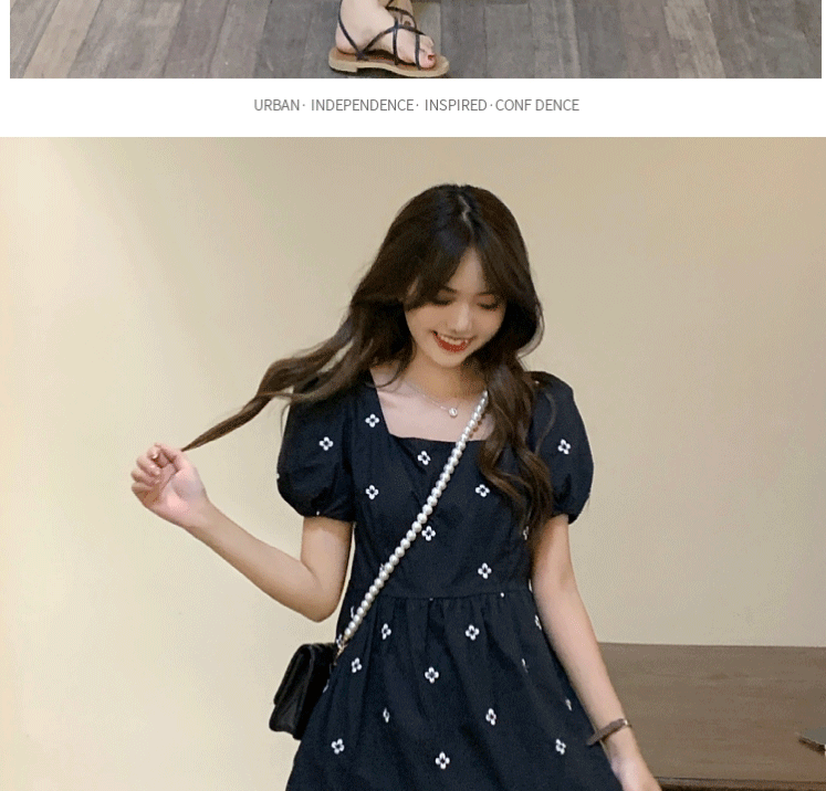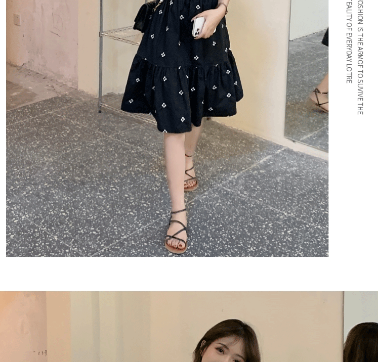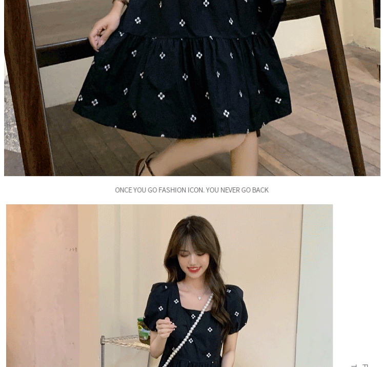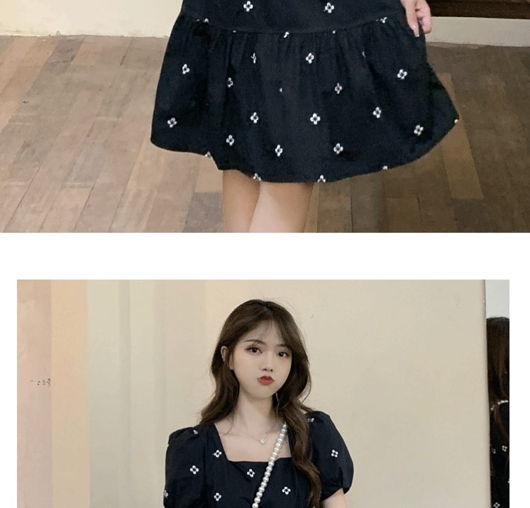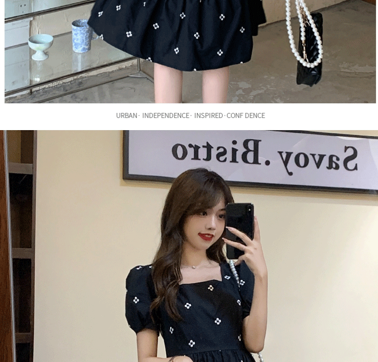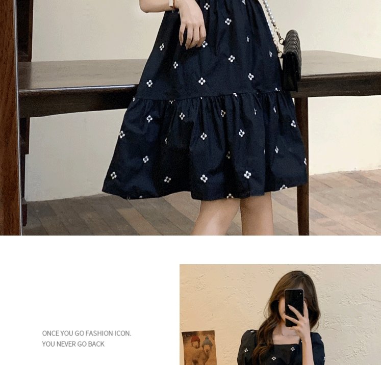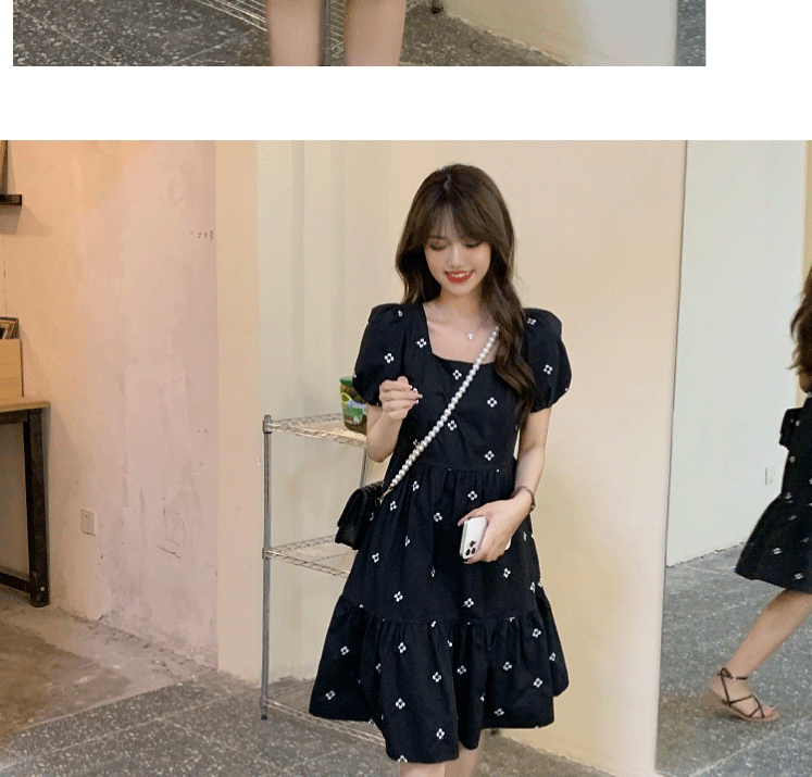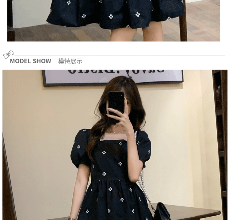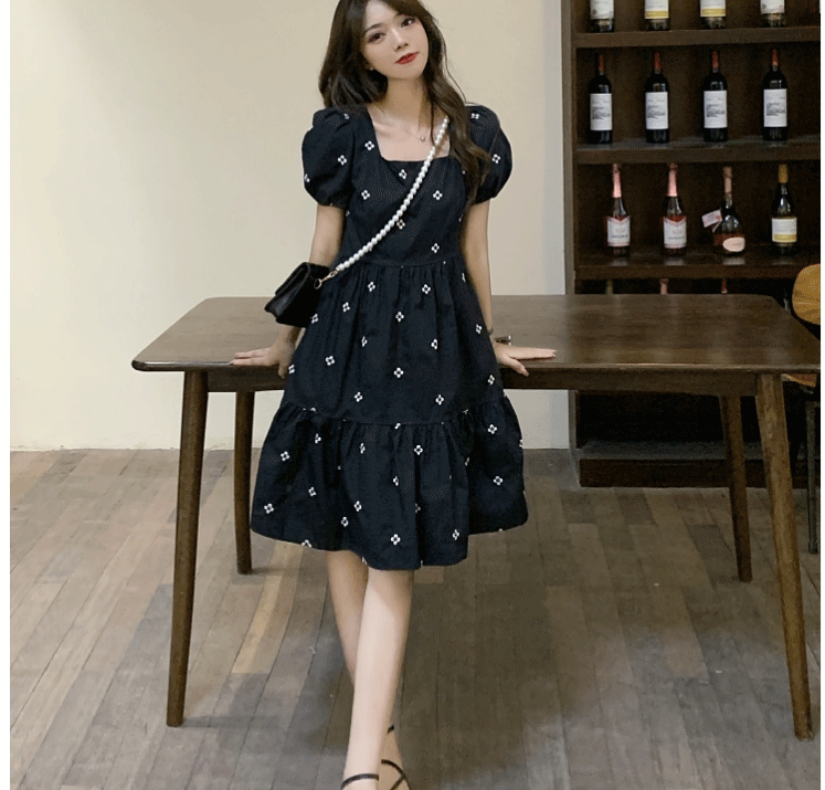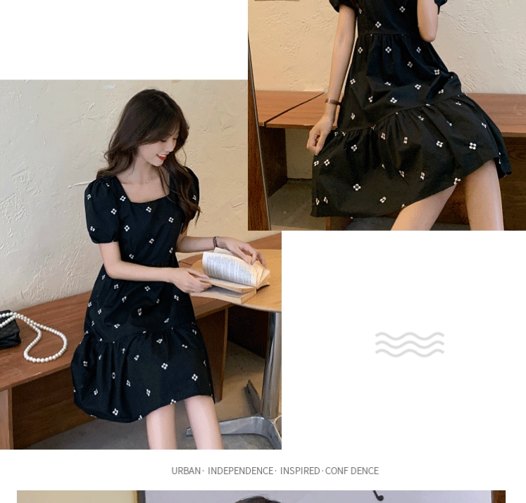 大碼女裝法式復古方領顯瘦小黑裙女夏季胖mm遮肚子收腰減齡連衣裙