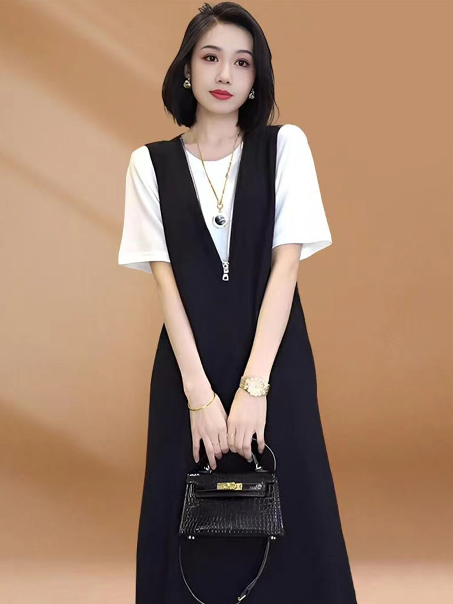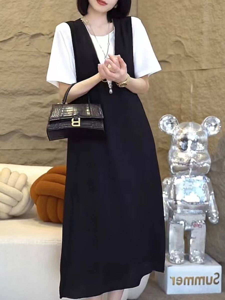 大碼通勤百搭V領背心連衣裙女2025夏季新款休閒短袖背帶裙兩件套