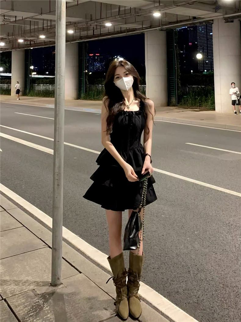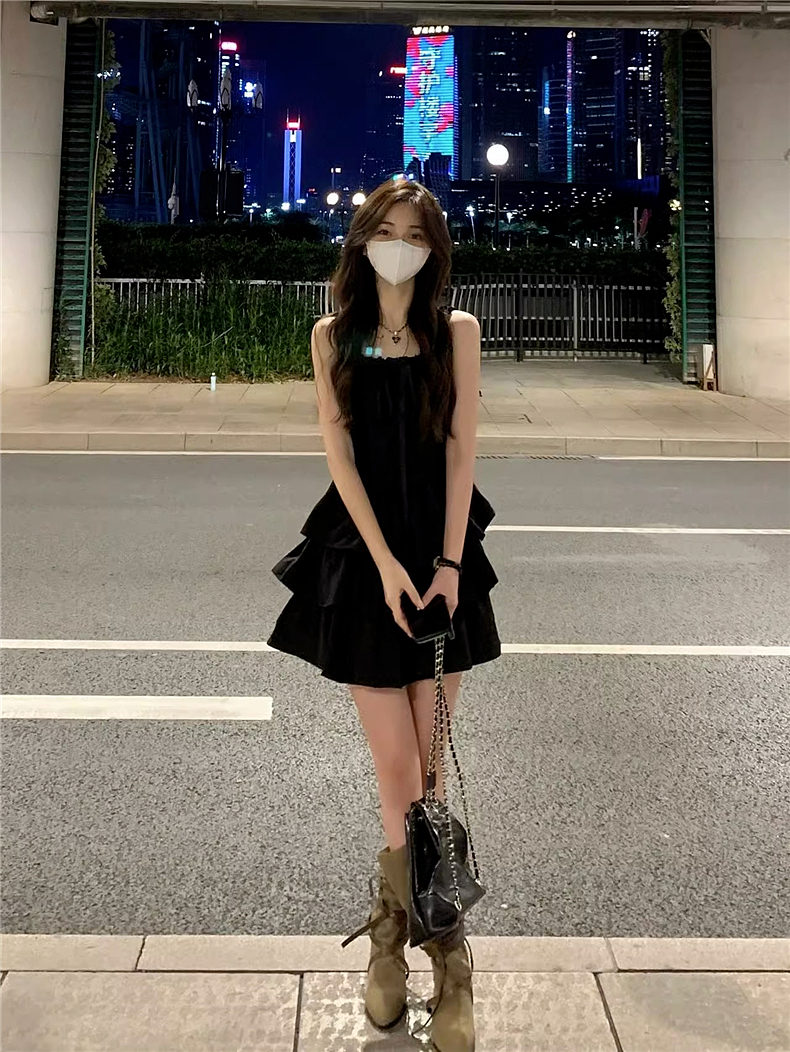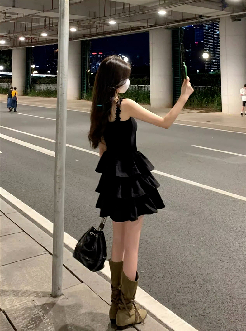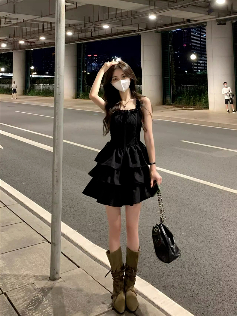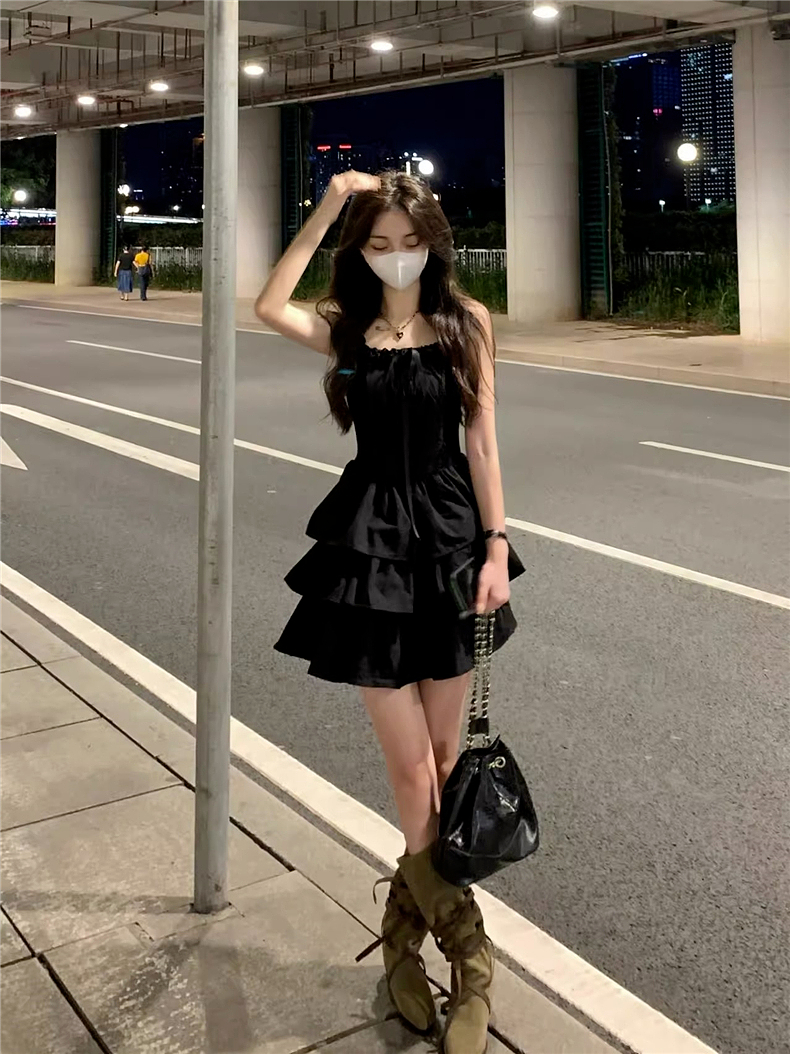 2025新款法式黑色吊帶連衣裙子女夏掐腰顯瘦氣質絕美公主蓬蓬裙