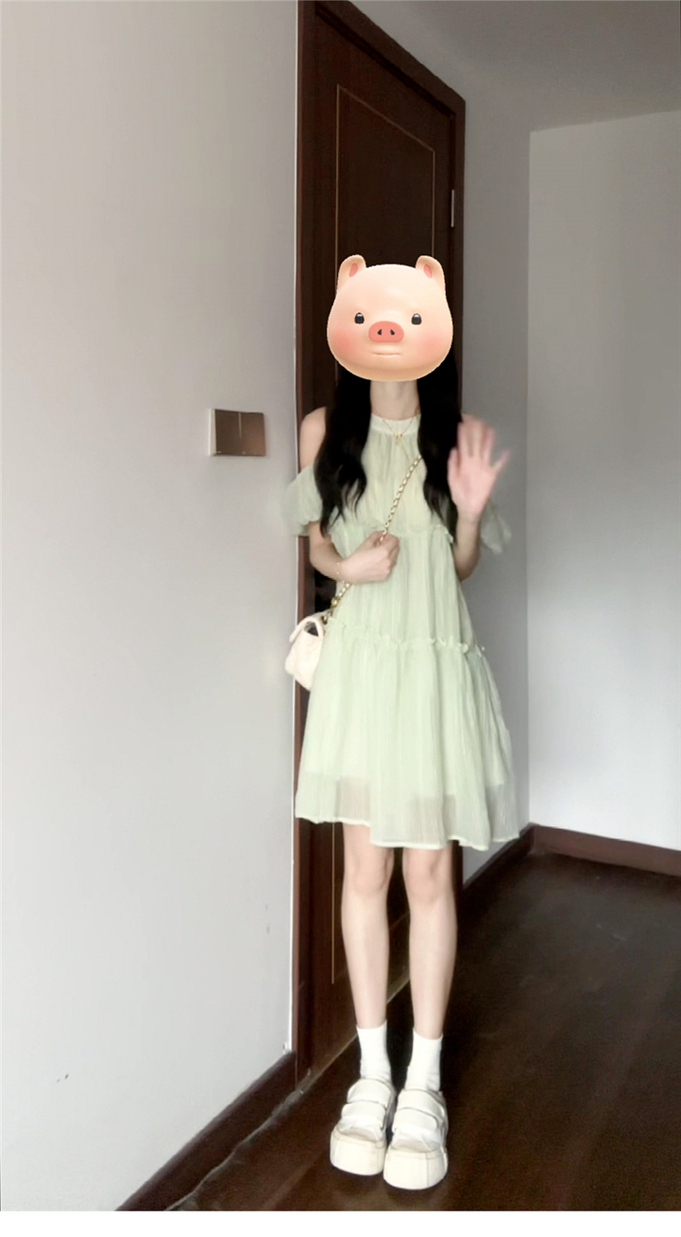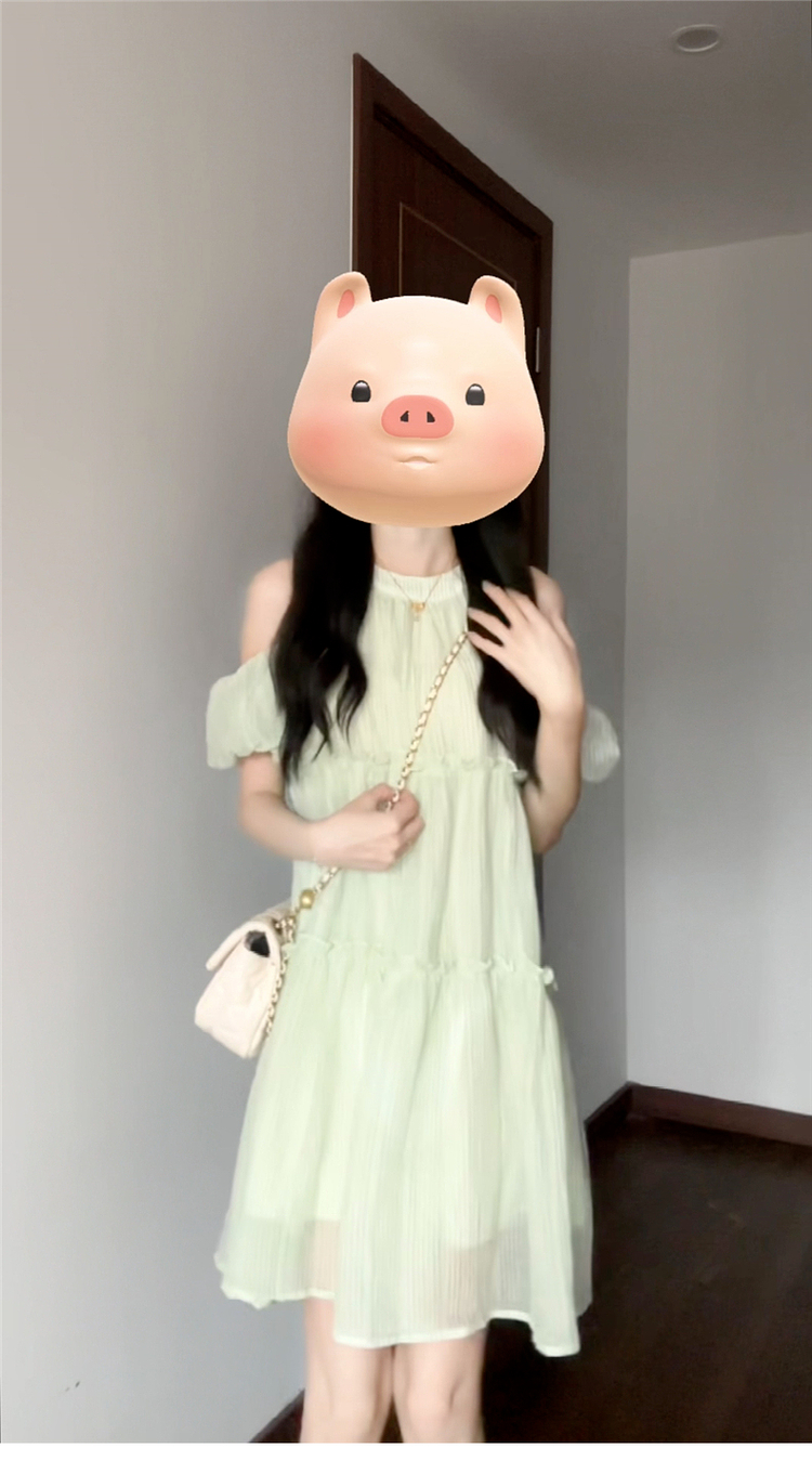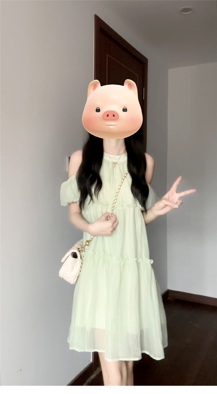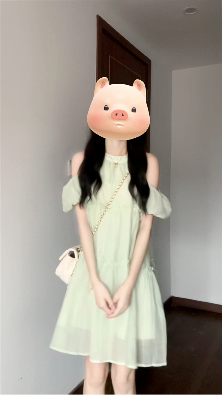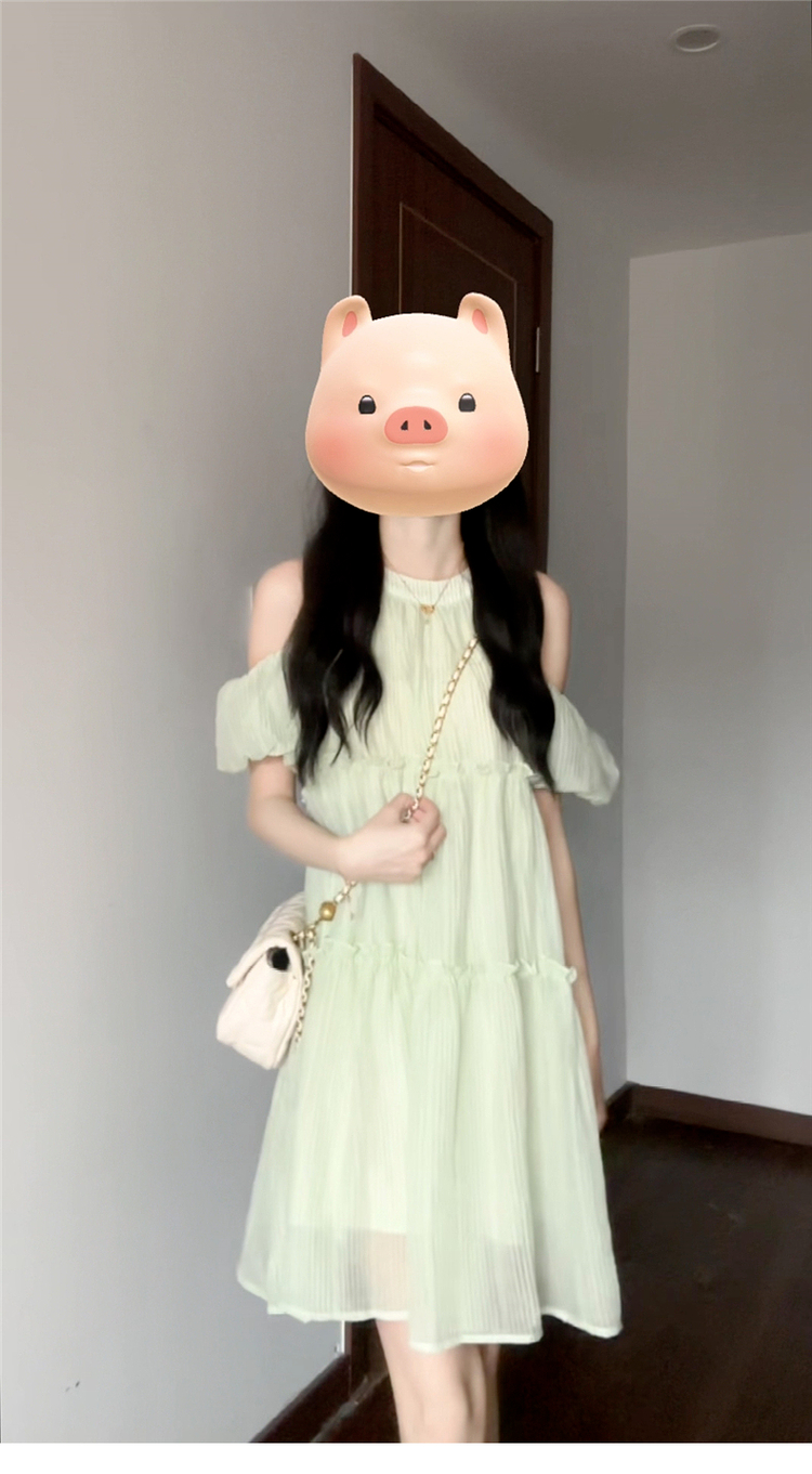 2025新款小個子露肩掛脖吊帶綠色連衣裙子女夏季法式初戀仙女短裙