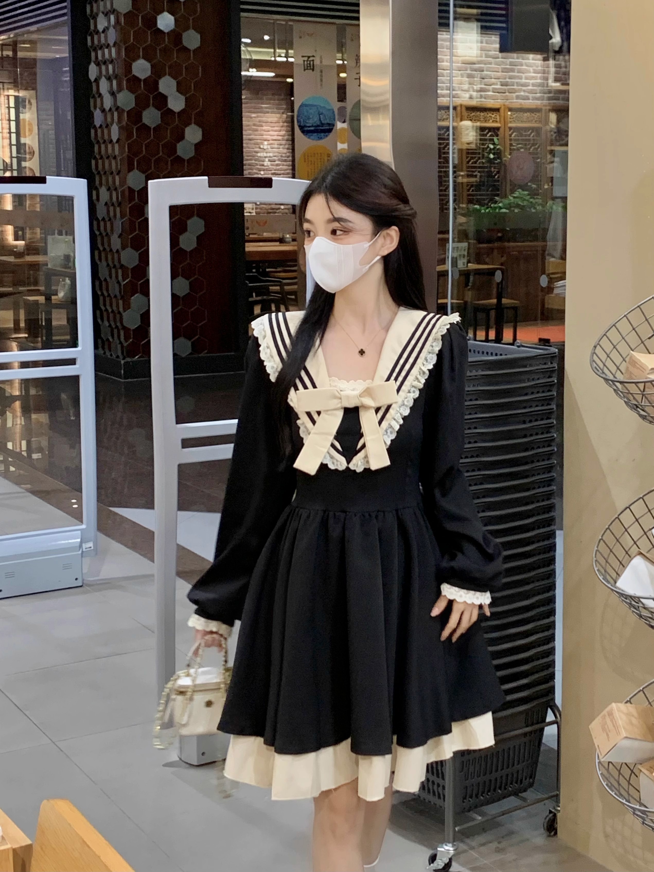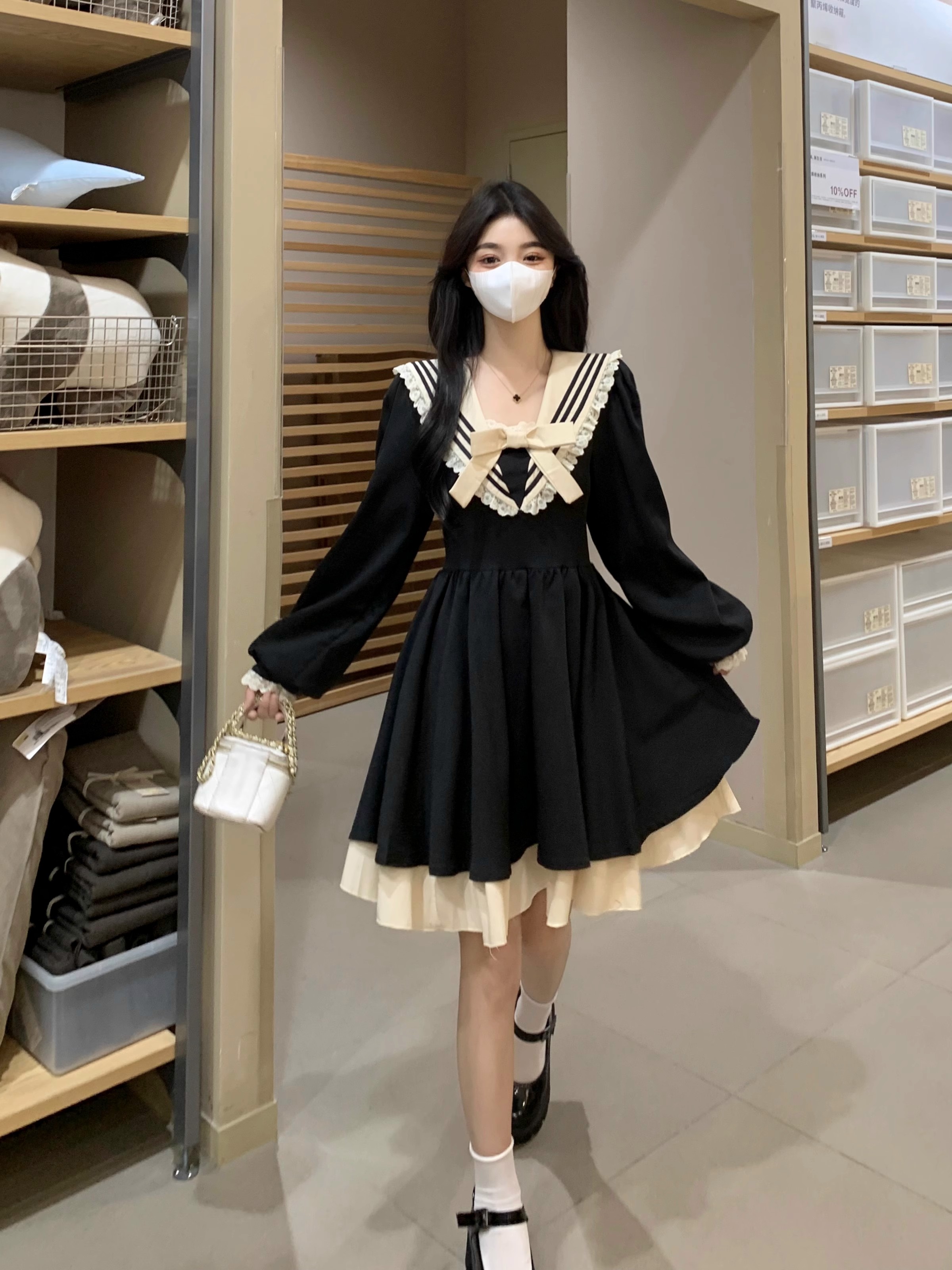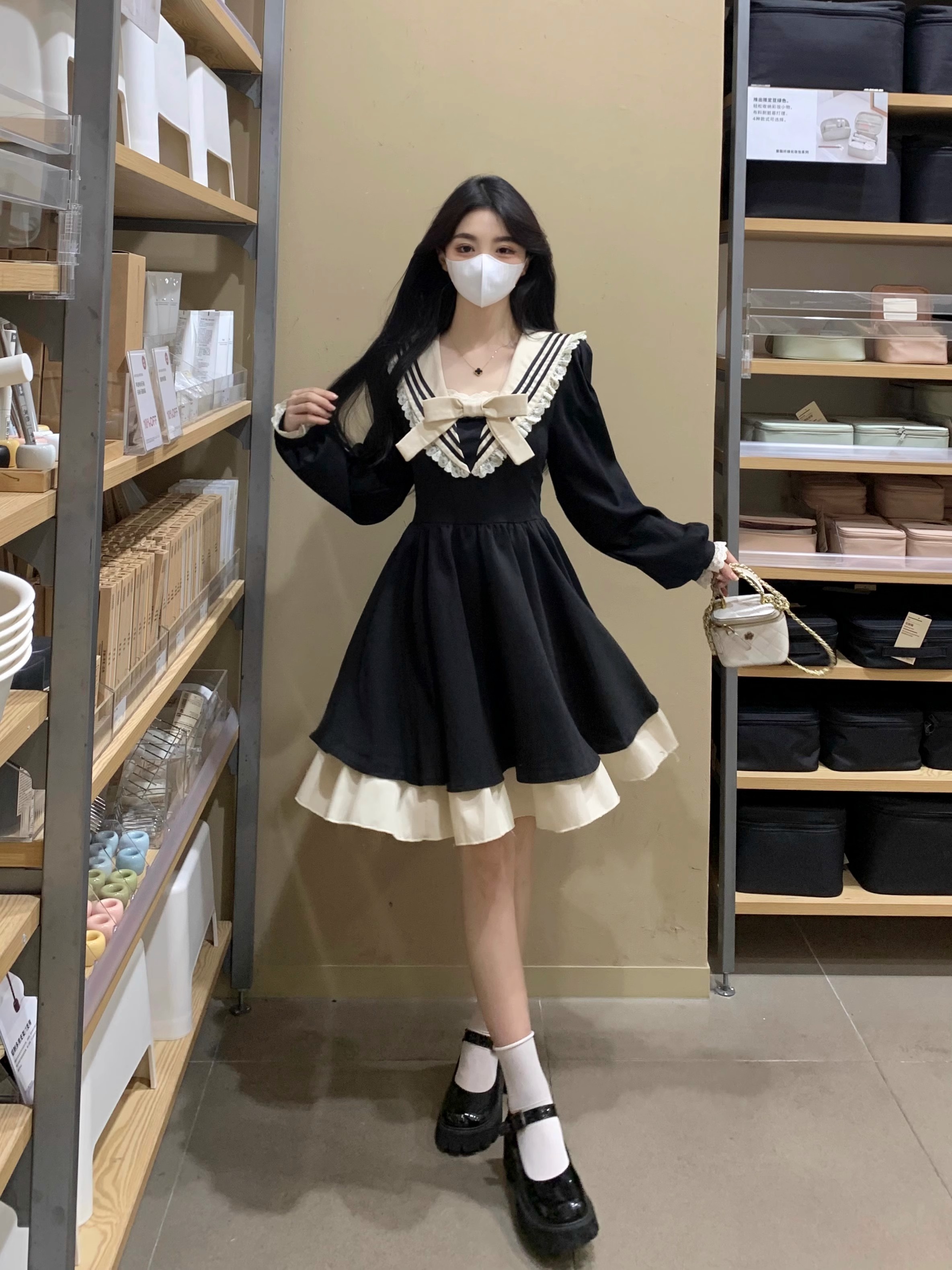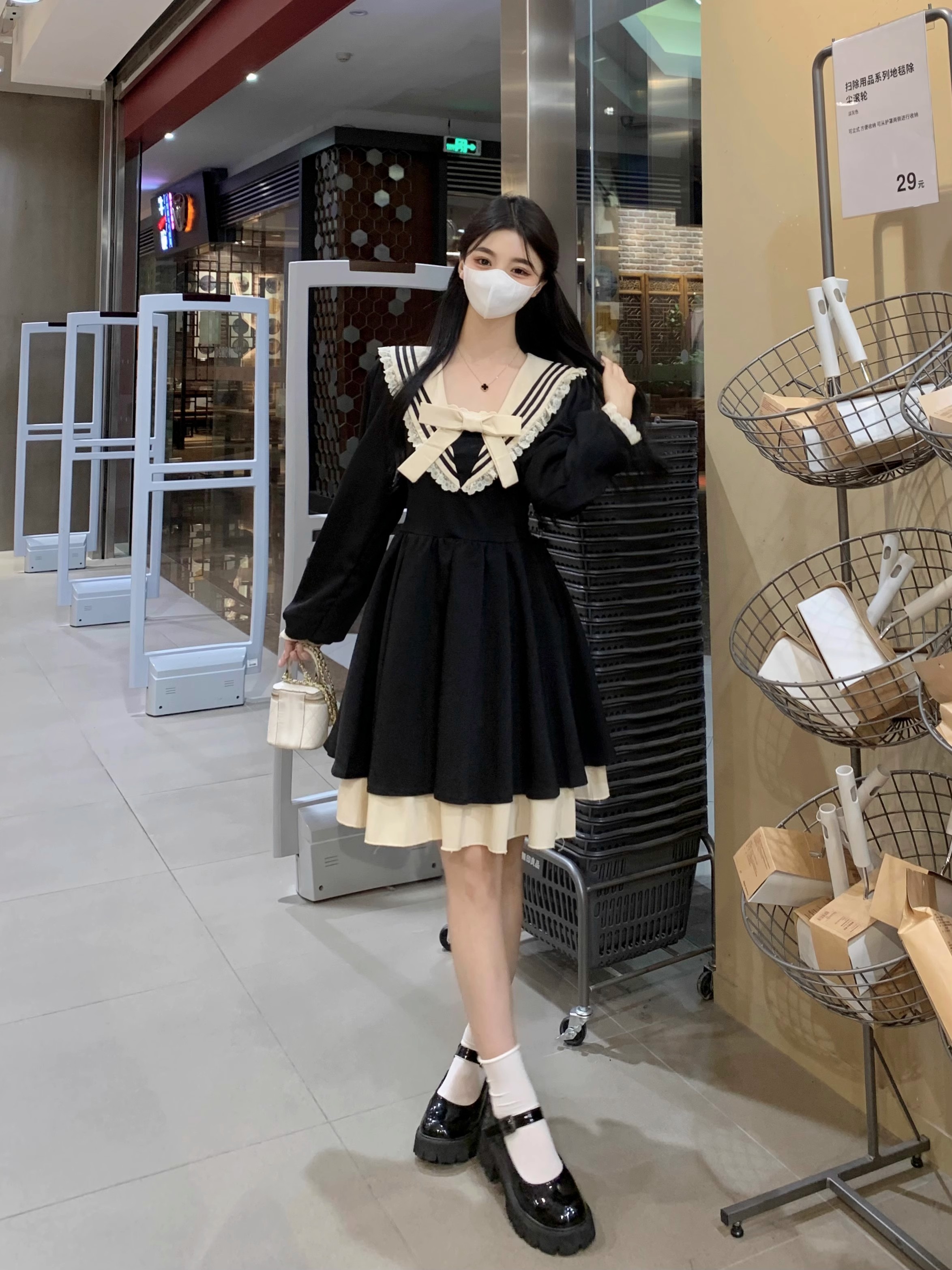 大碼顯瘦海軍領長袖赫本風連衣裙秋季新款女裝蓬蓬裙胖mm黑色裙子