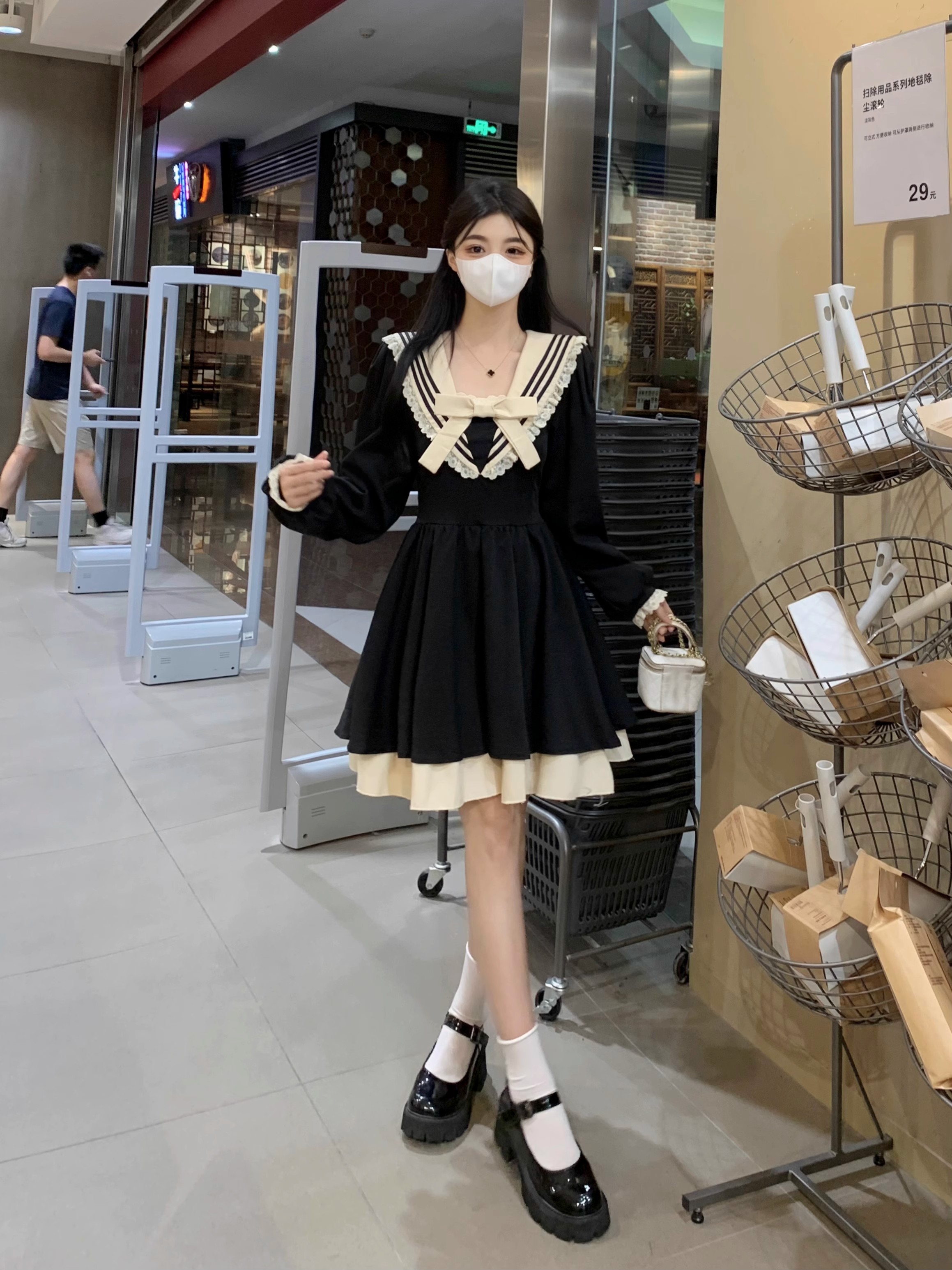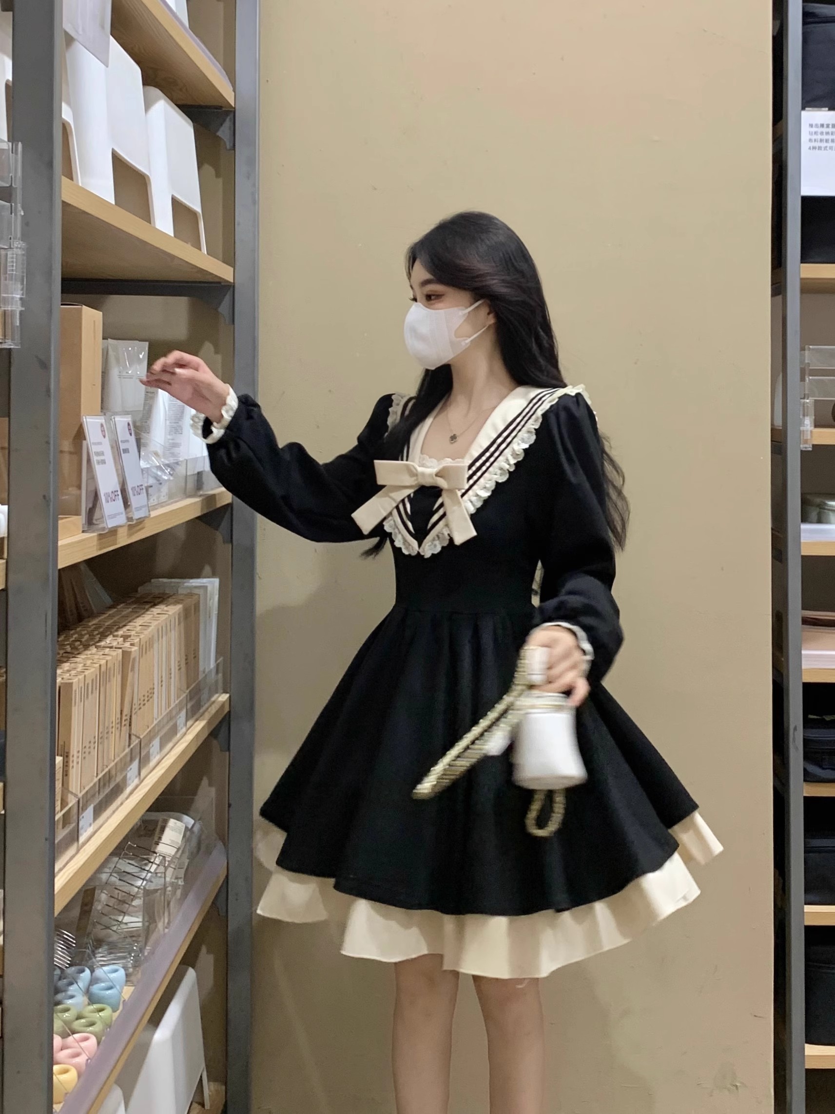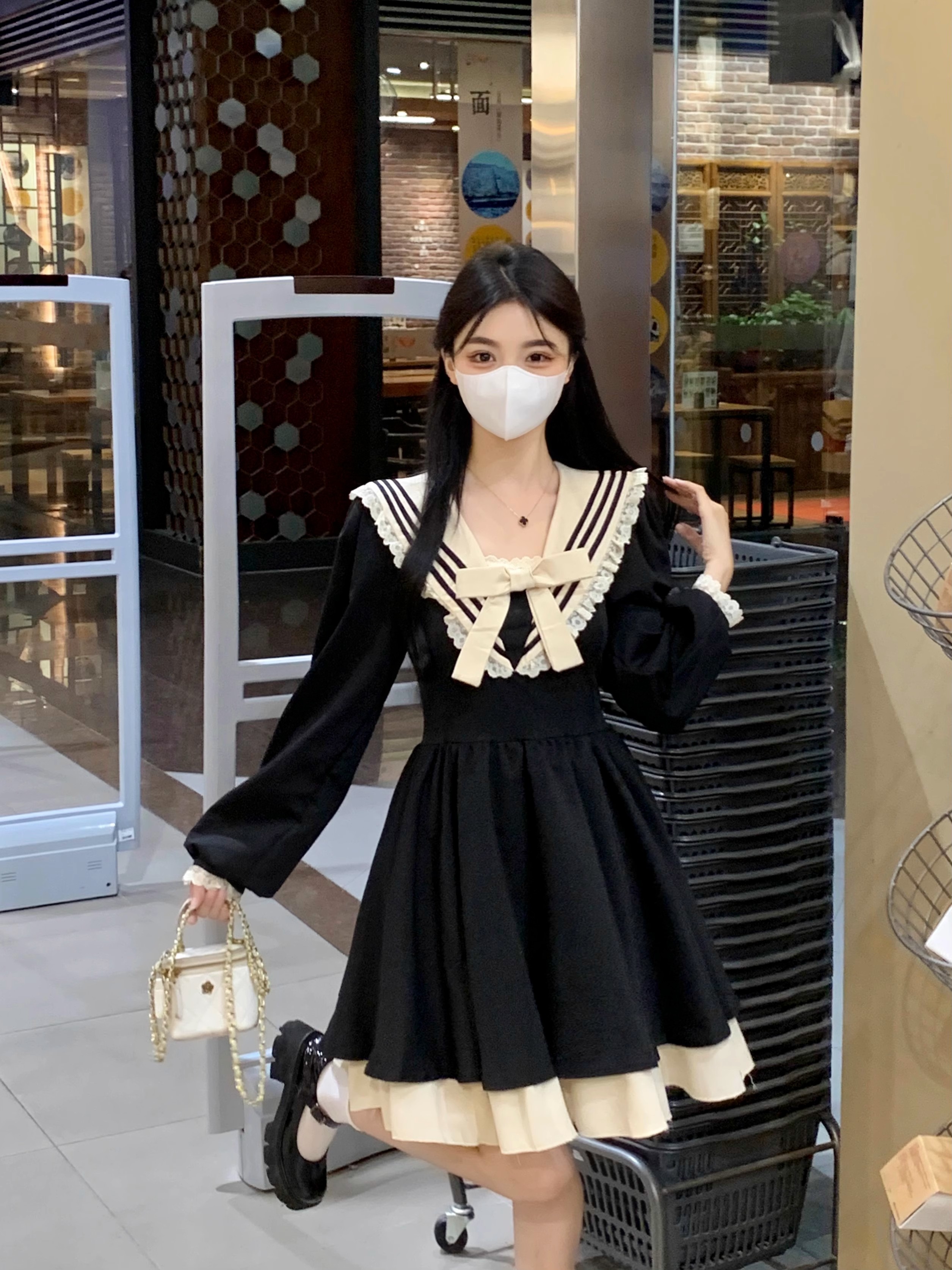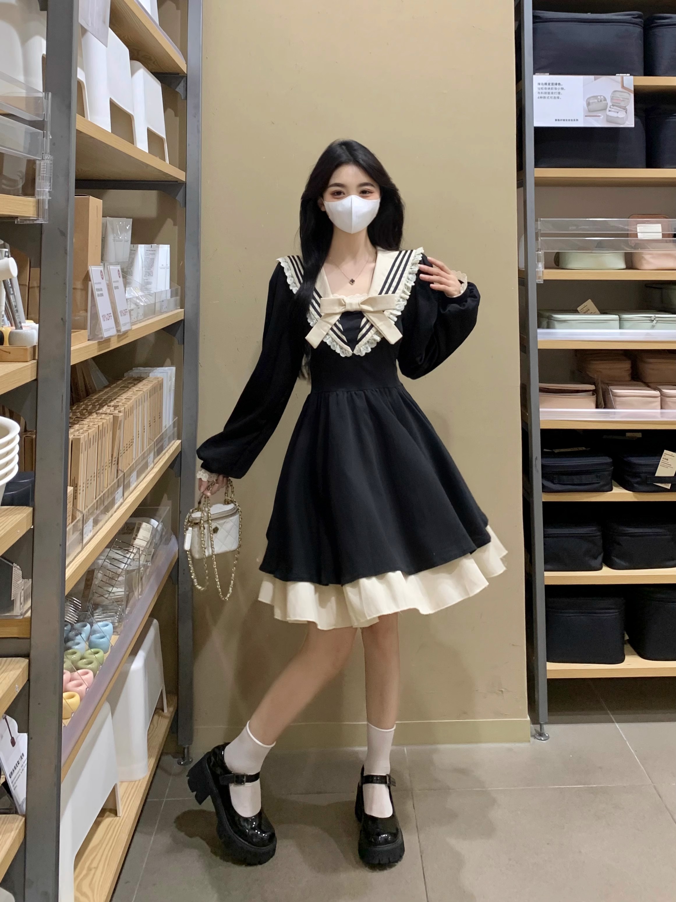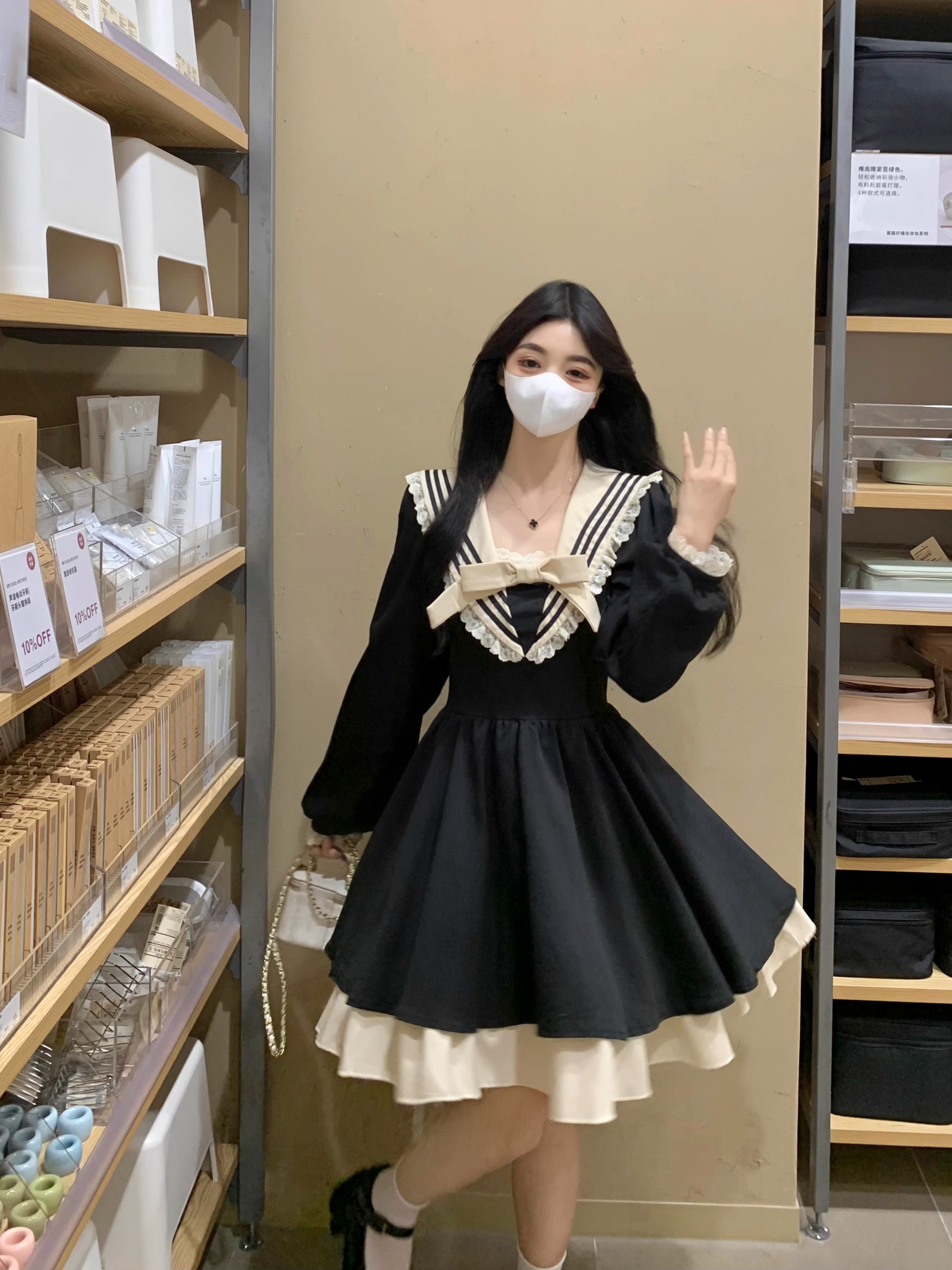大碼顯瘦海軍領長袖赫本風連衣裙秋季新款女裝蓬蓬裙胖mm黑色裙子