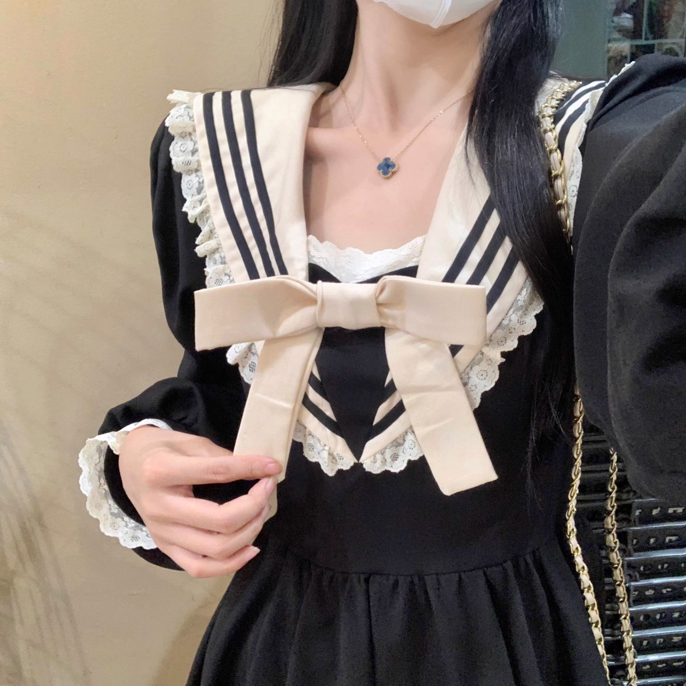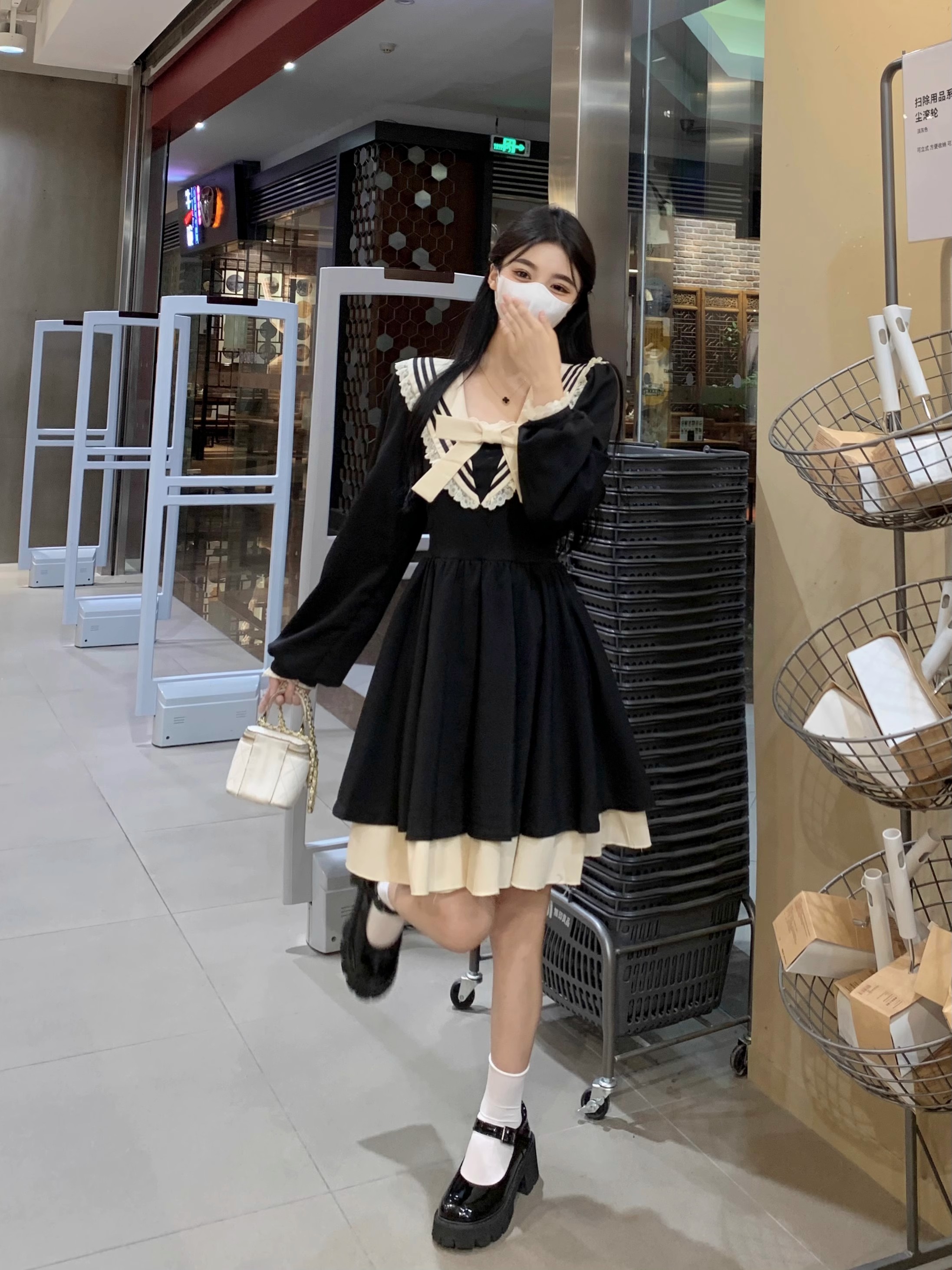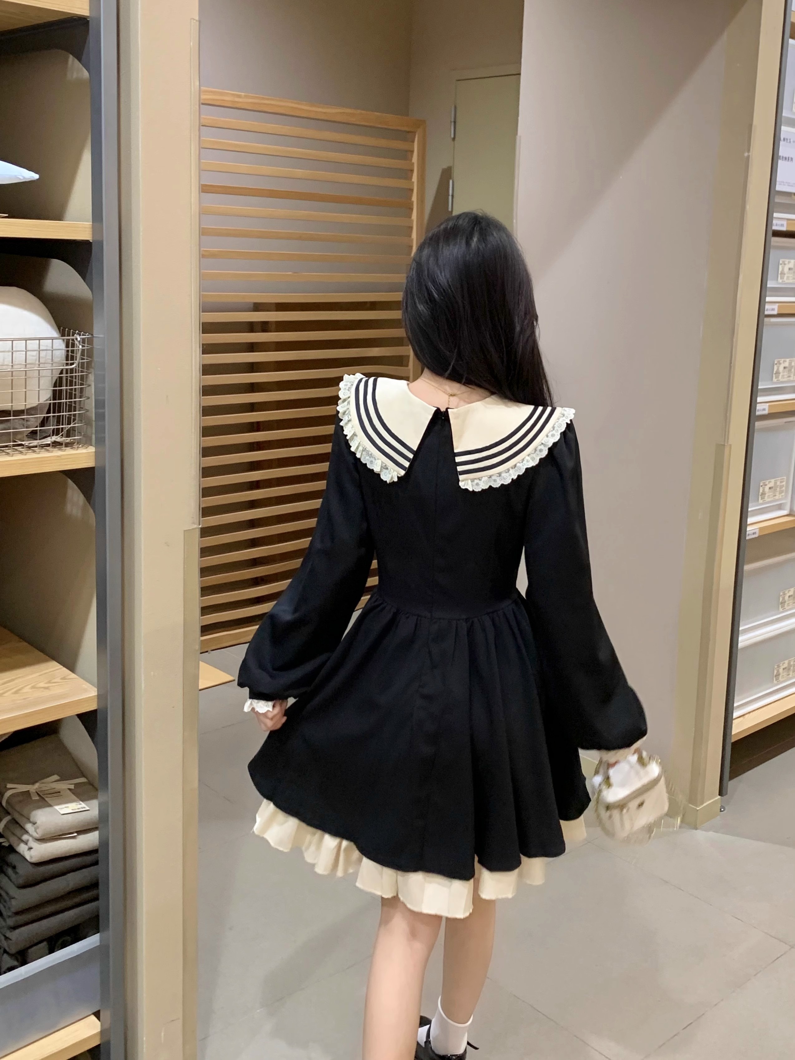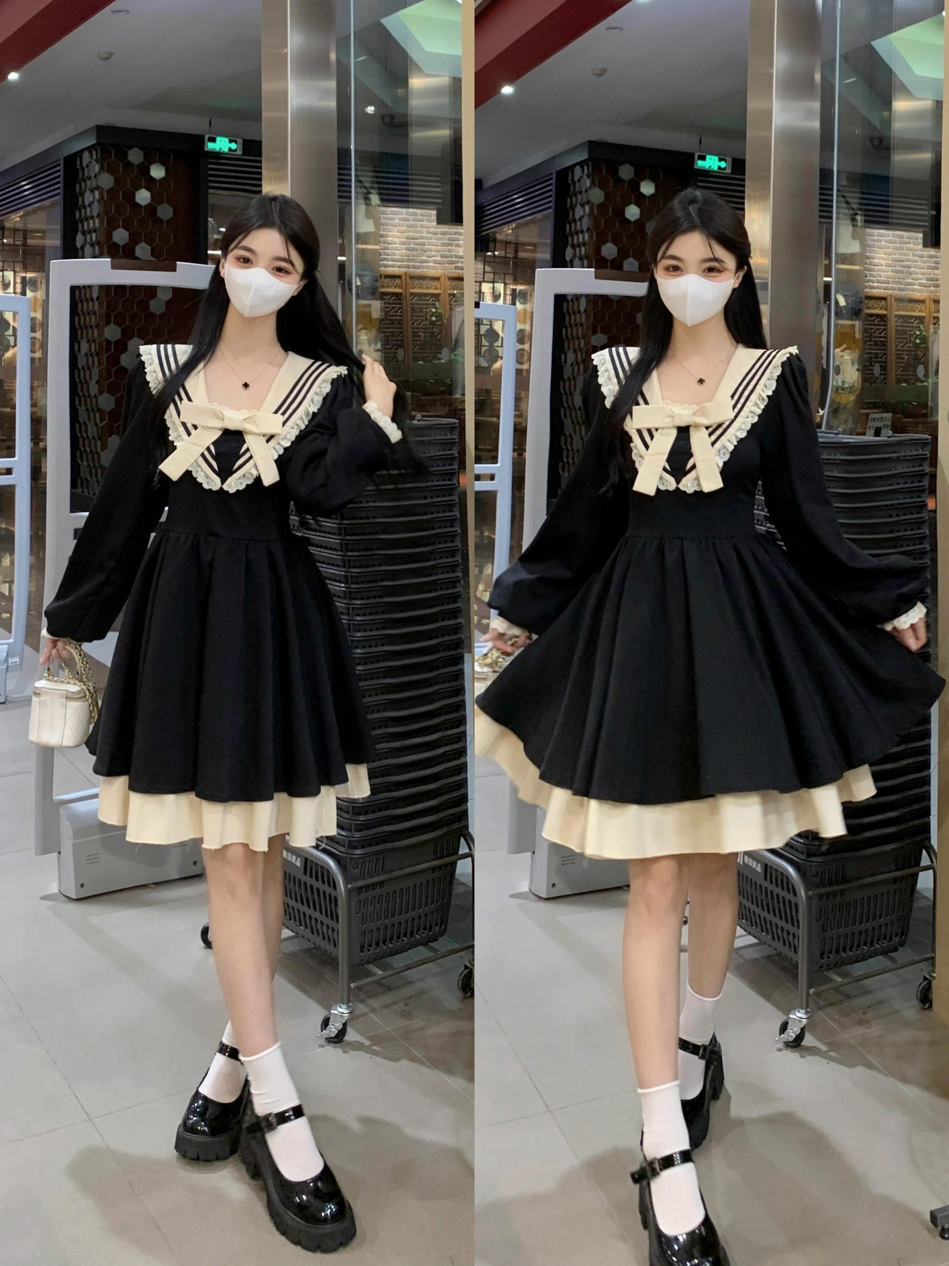 大碼顯瘦海軍領長袖赫本風連衣裙秋季新款女裝蓬蓬裙胖mm黑色裙子