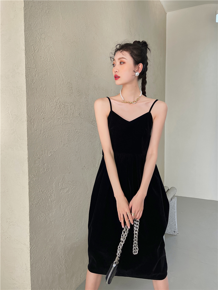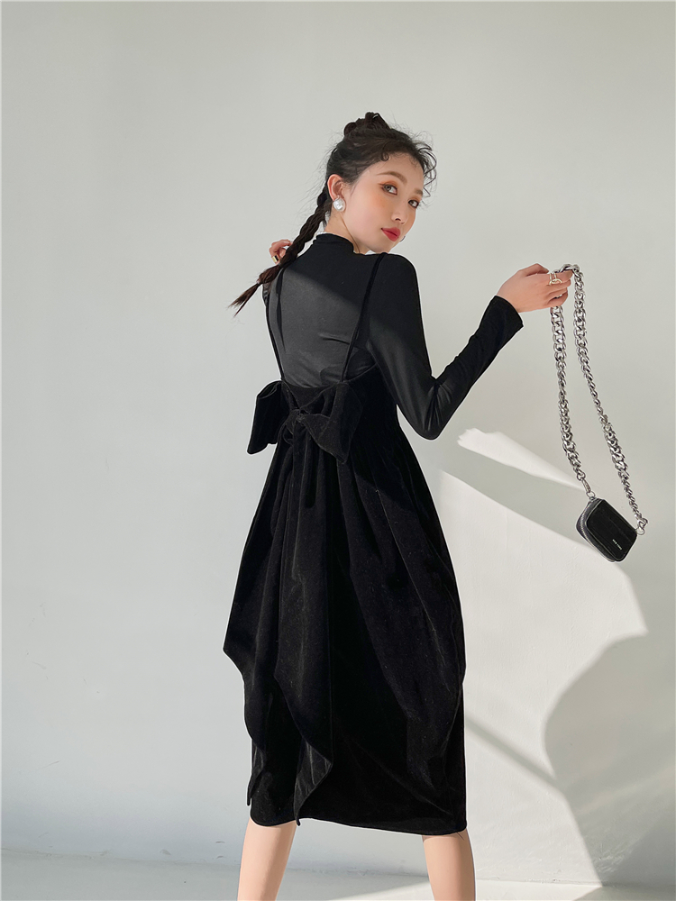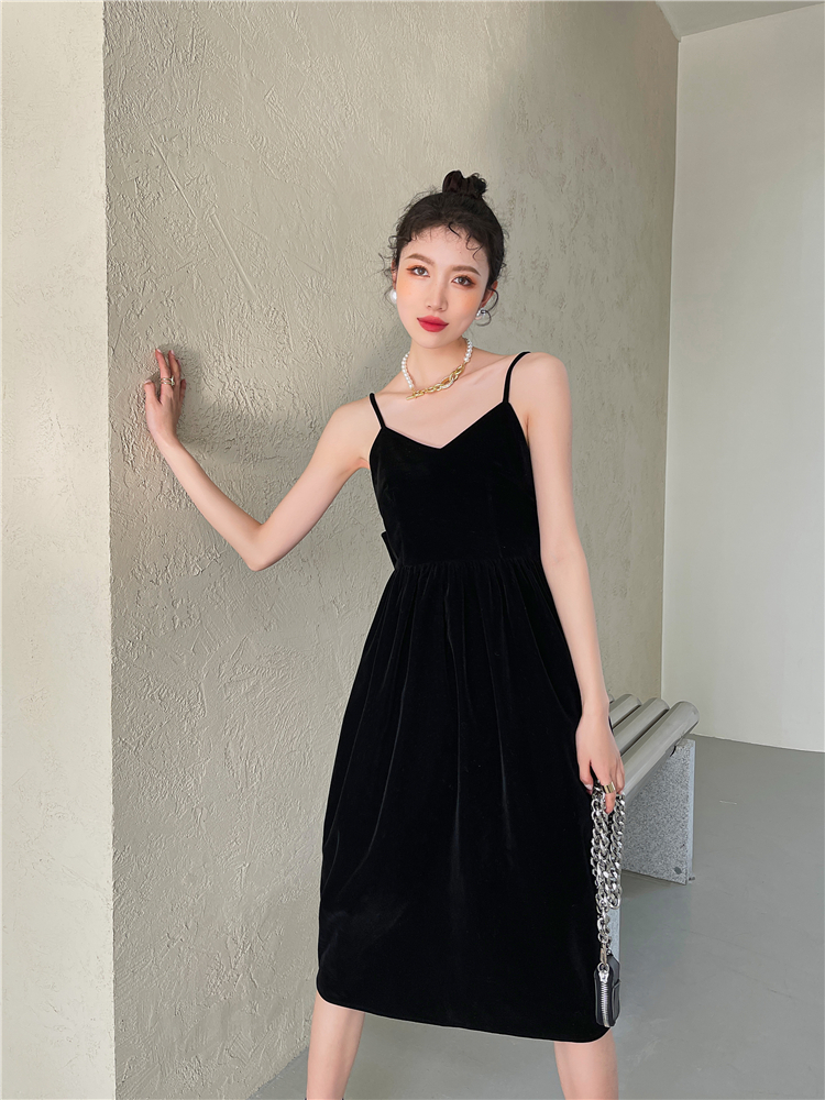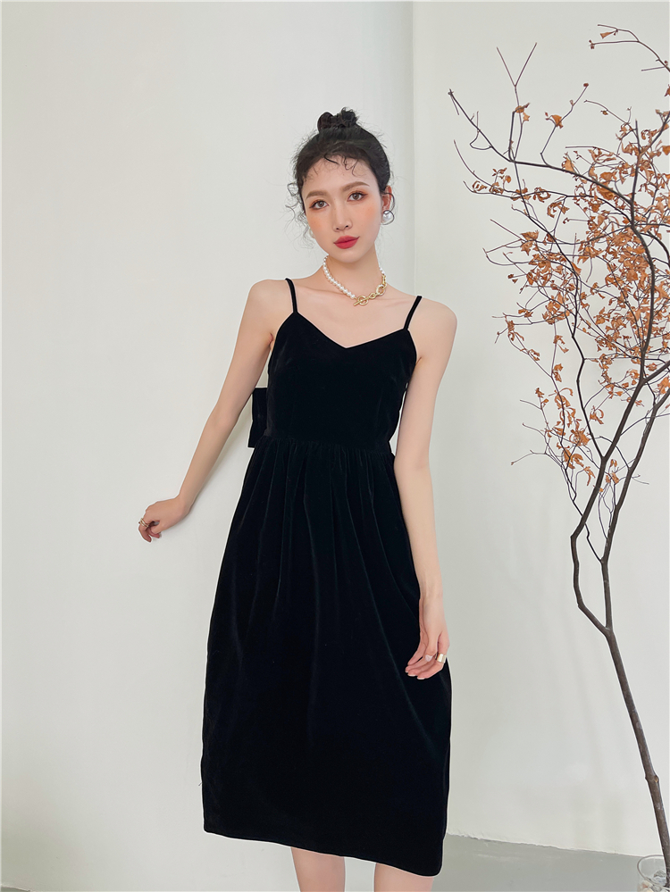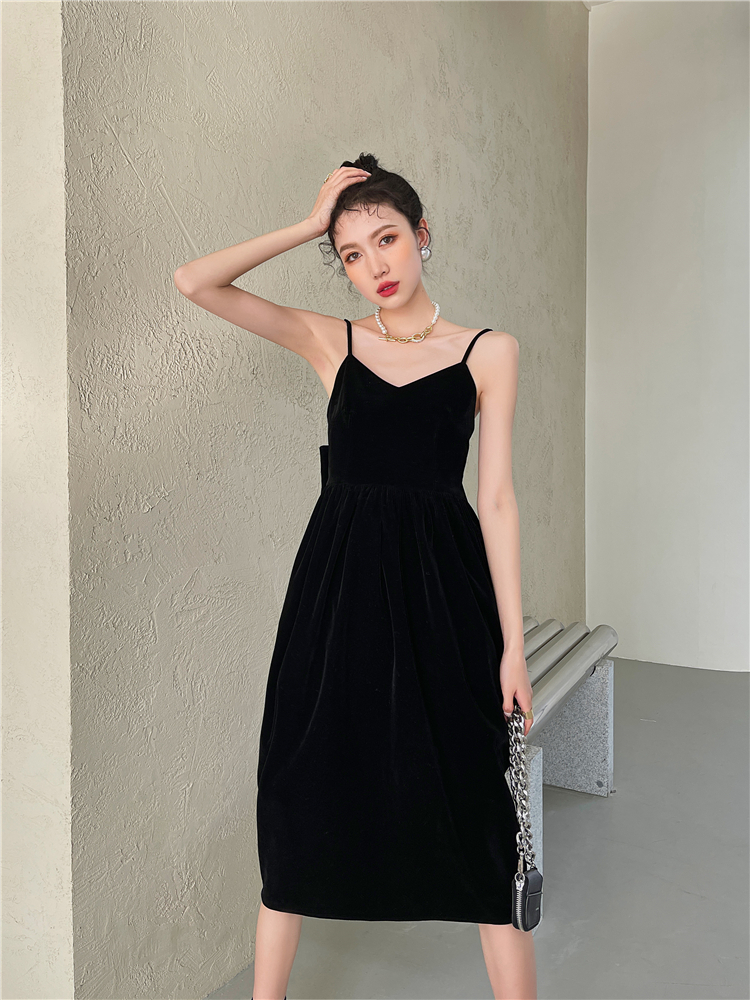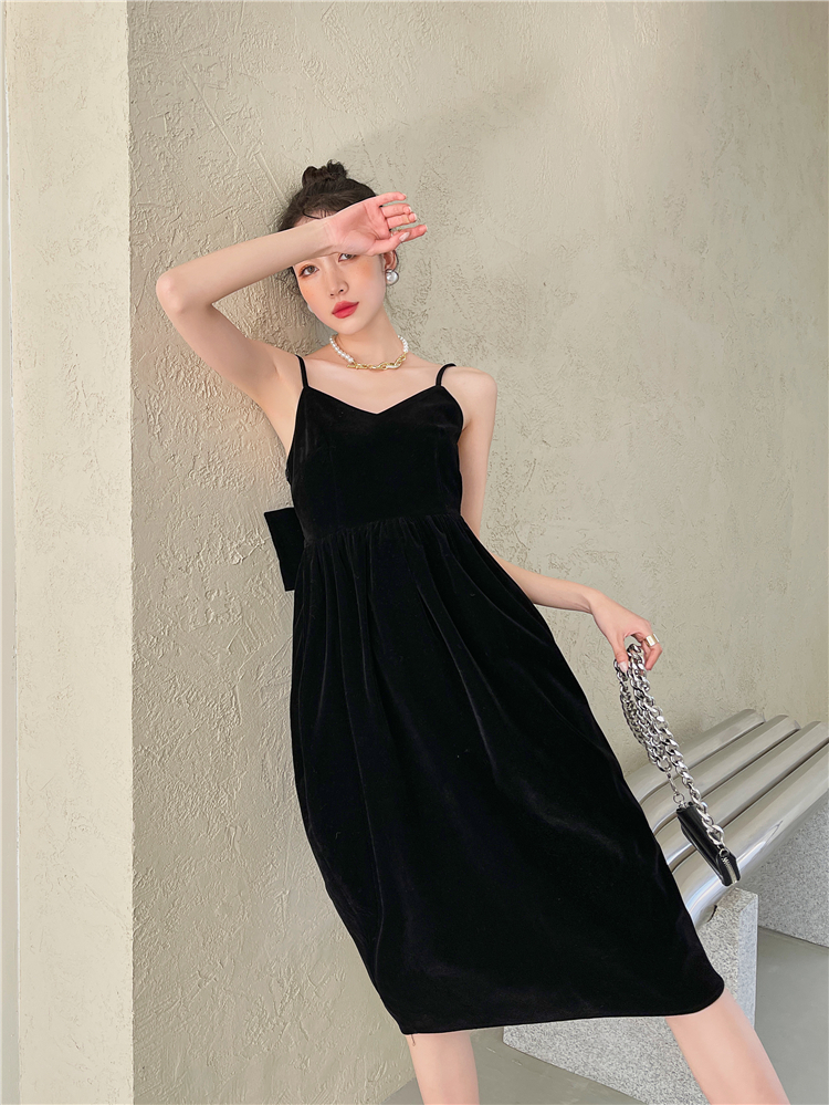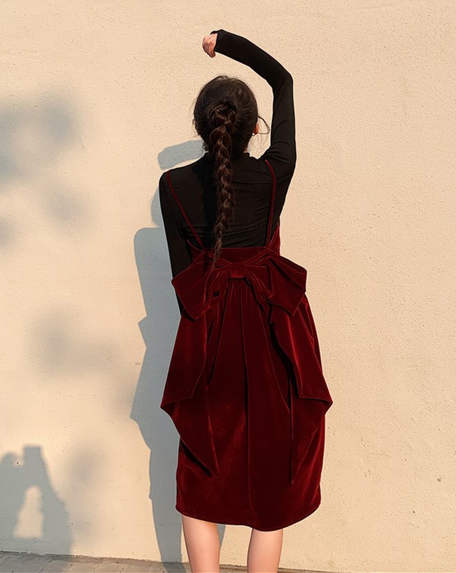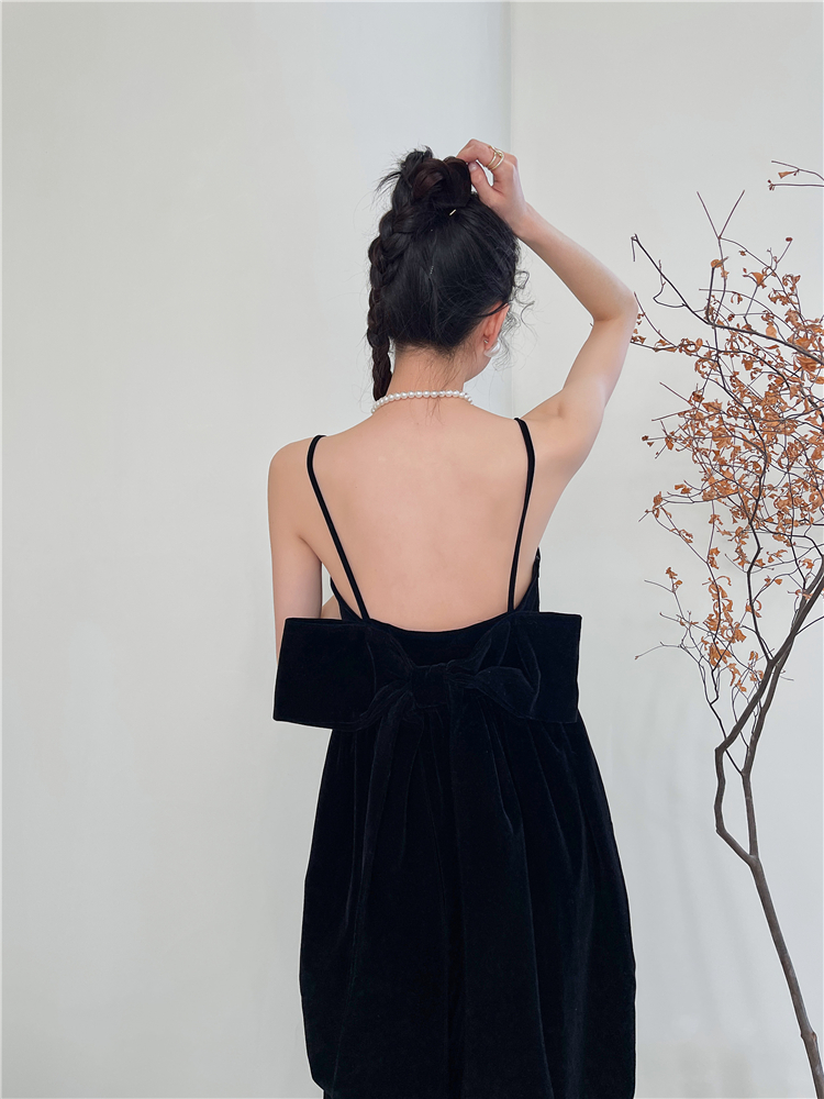 酒紅絲絨露背大蝴蝶結年會禮服宴會生日吊帶連衣裙女