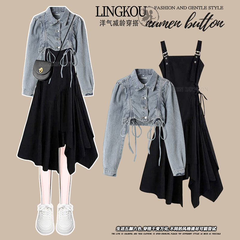 大碼春秋牛仔套裝女設計感寬松外套氣質不規則吊帶連衣裙兩件套