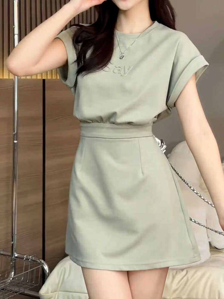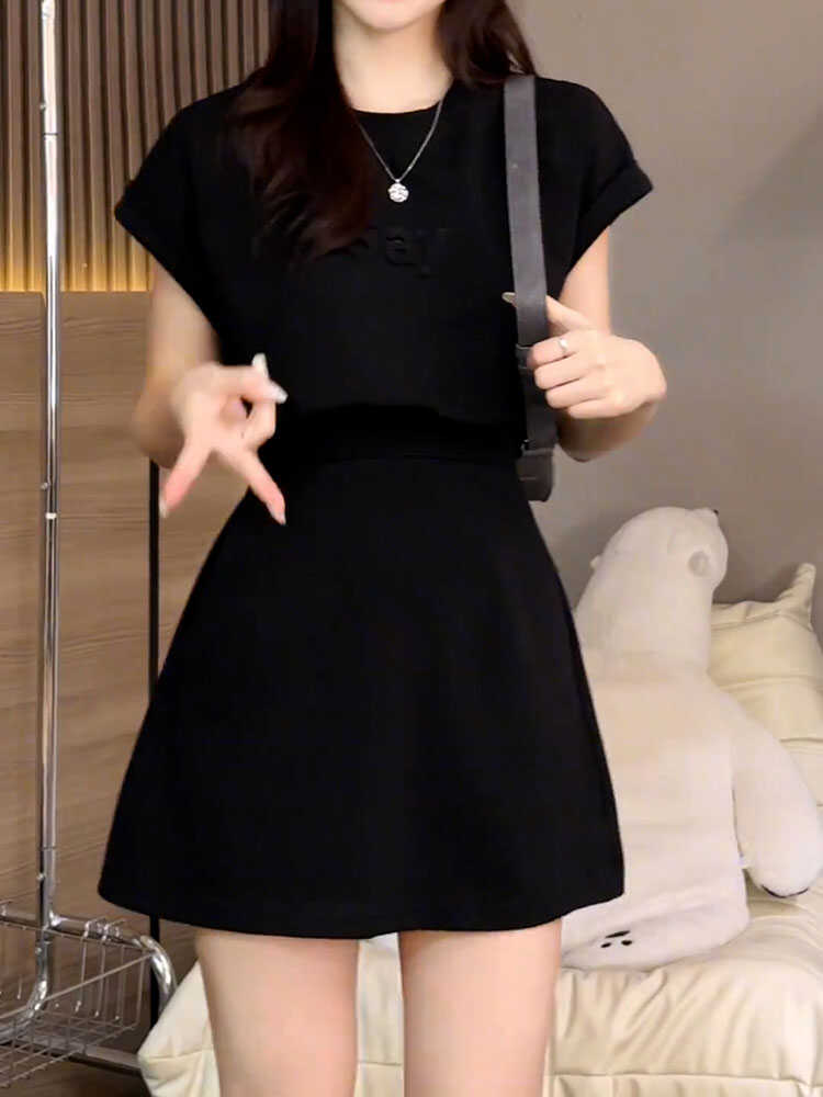 設計感字母浮雕短袖連衣裙夏季新款大碼胖mm收腰顯瘦別致短款裙子