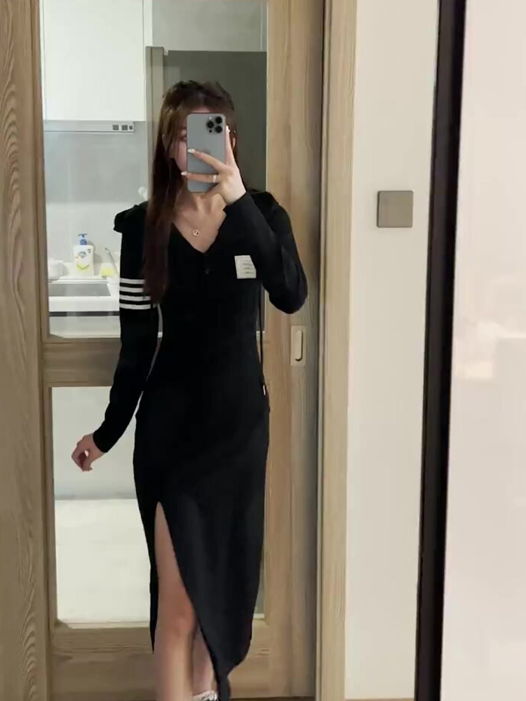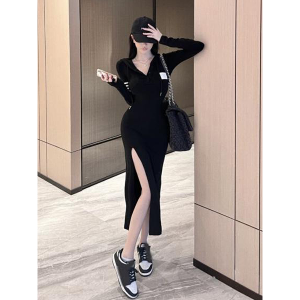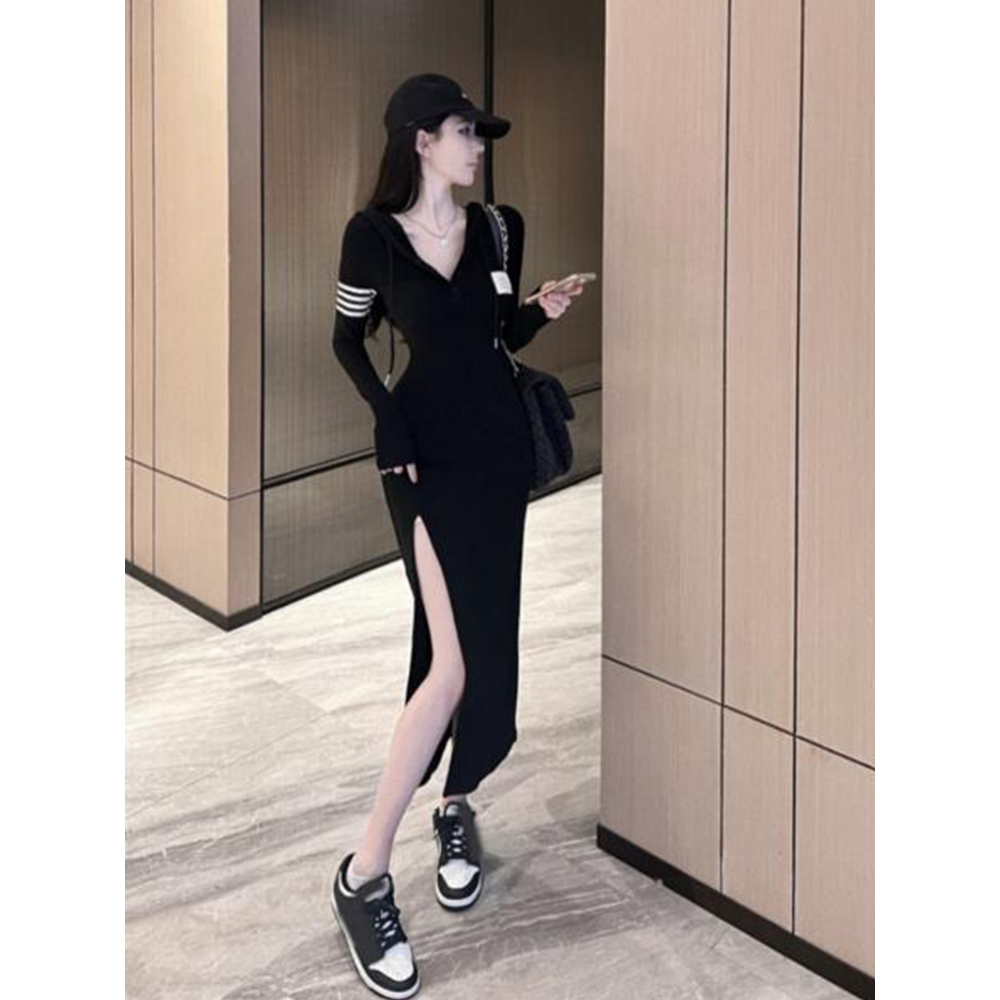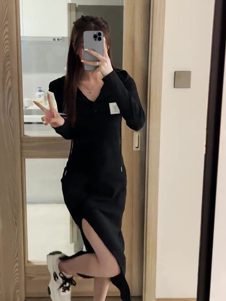 黑色v領連帽開叉連衣裙女春秋季新款辣妹性感修身顯瘦中長款裙子