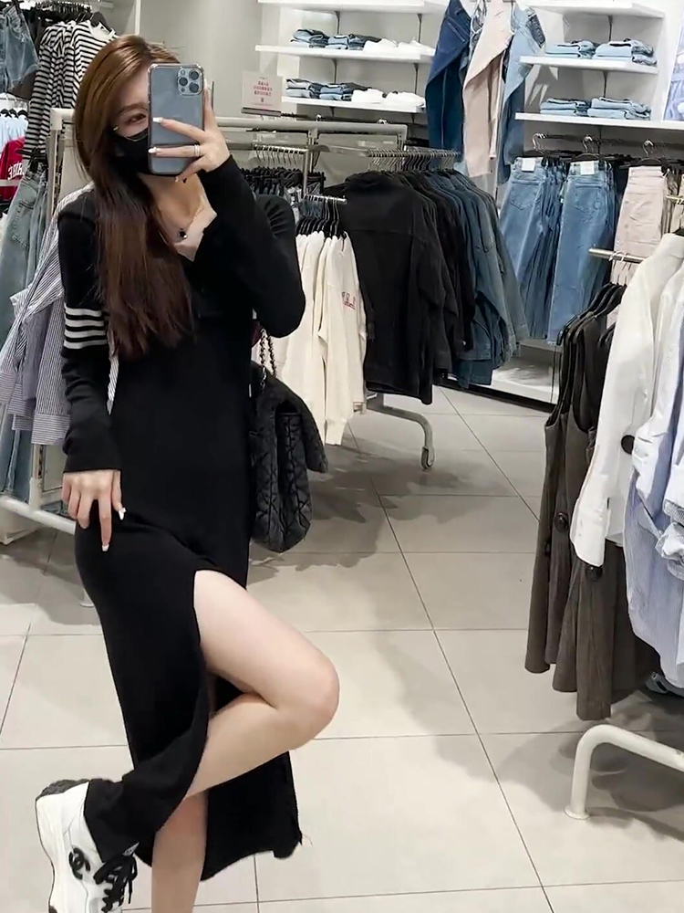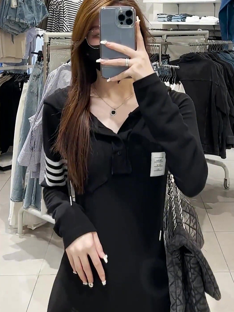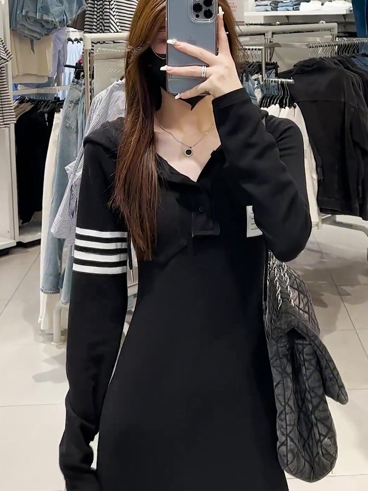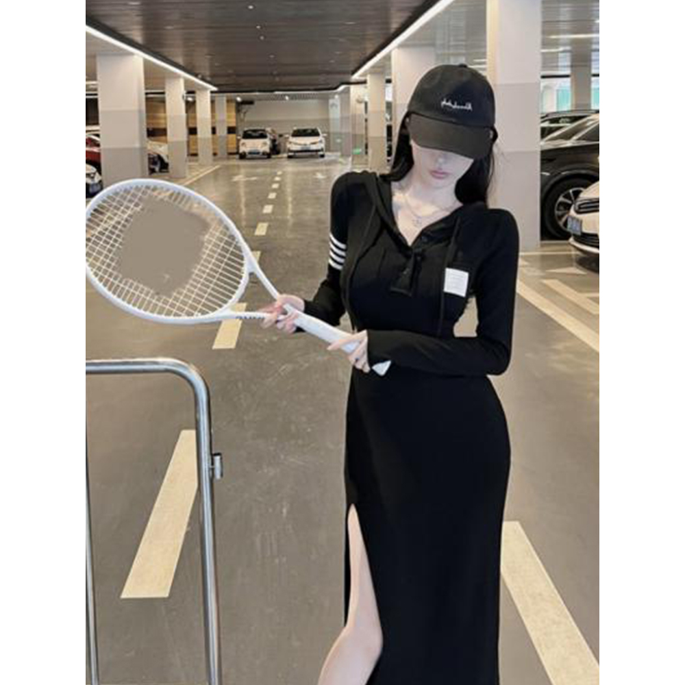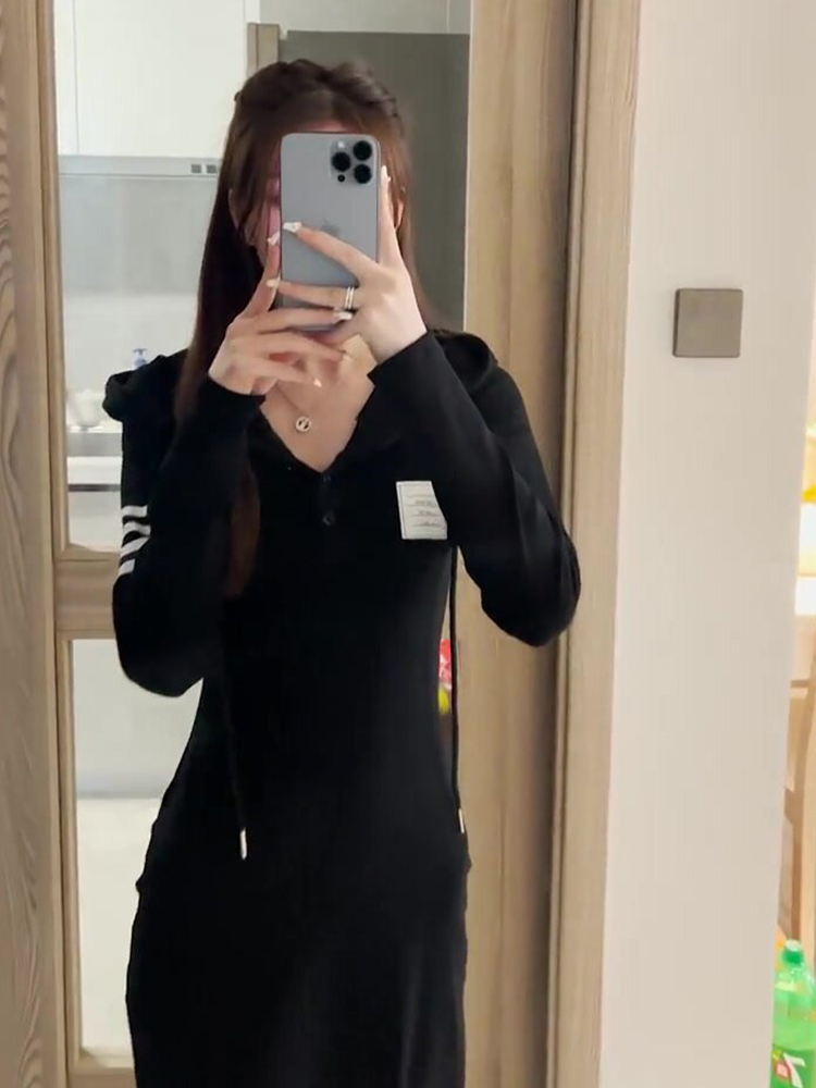 黑色v領連帽開叉連衣裙女春秋季新款辣妹性感修身顯瘦中長款裙子