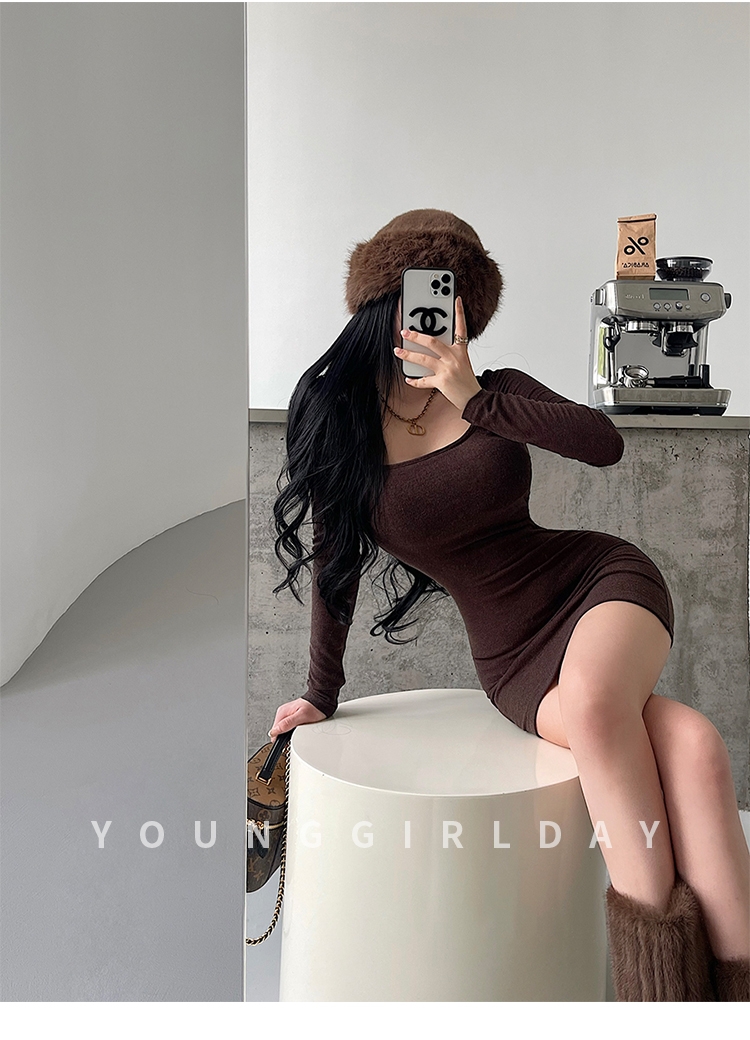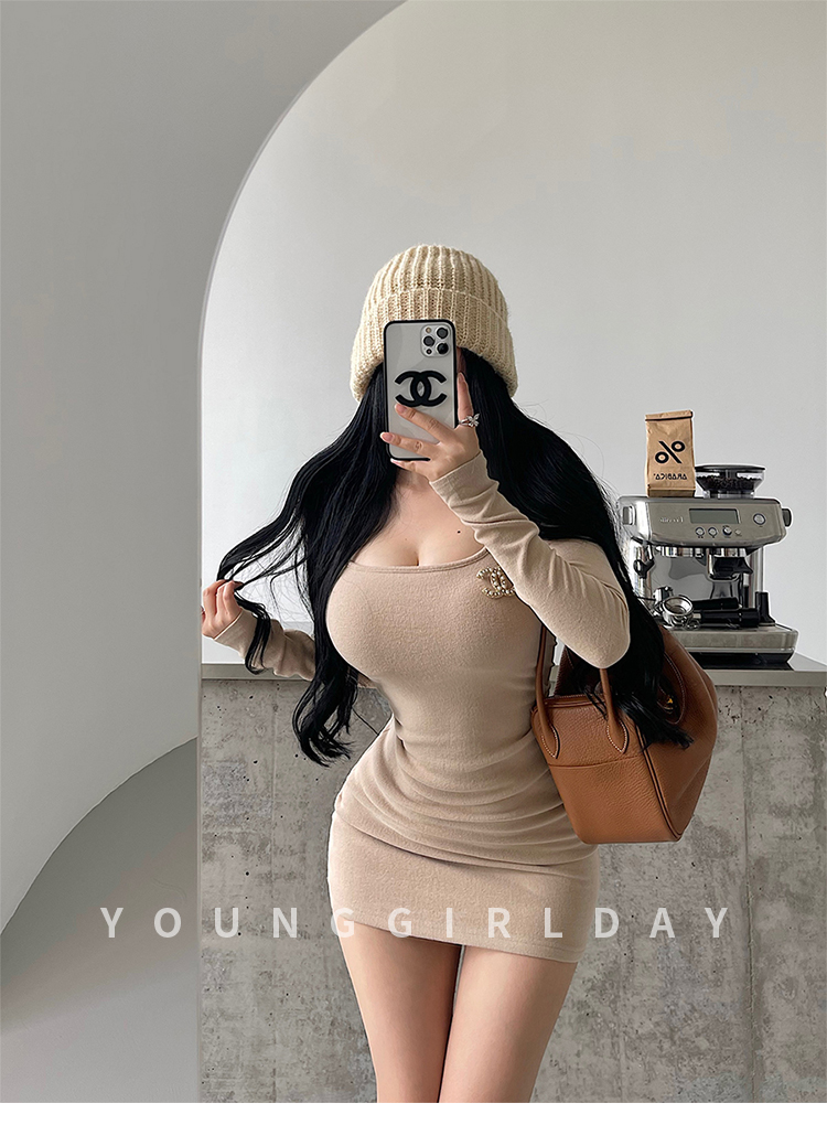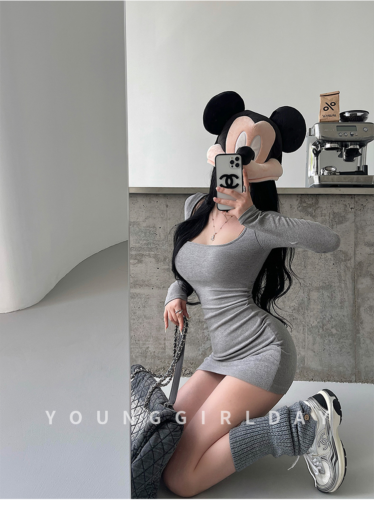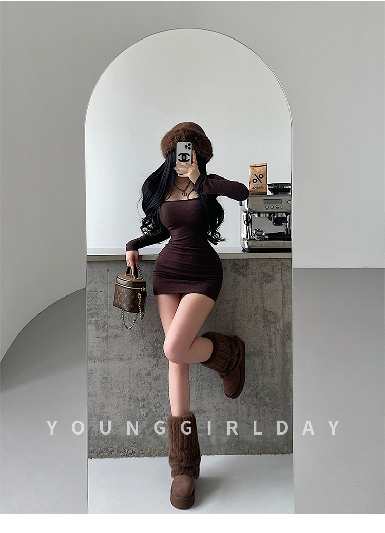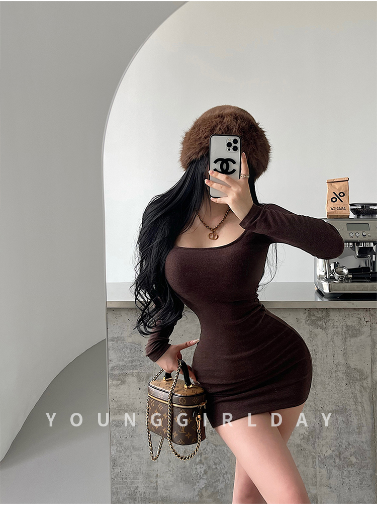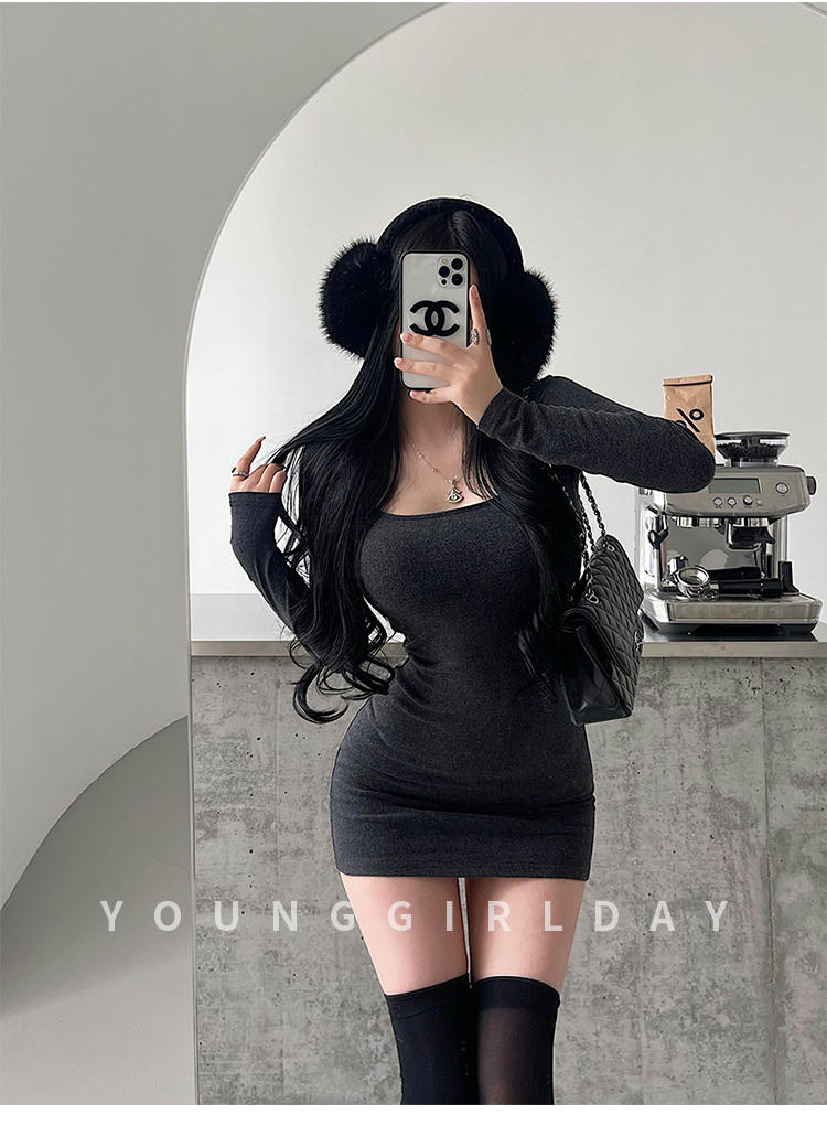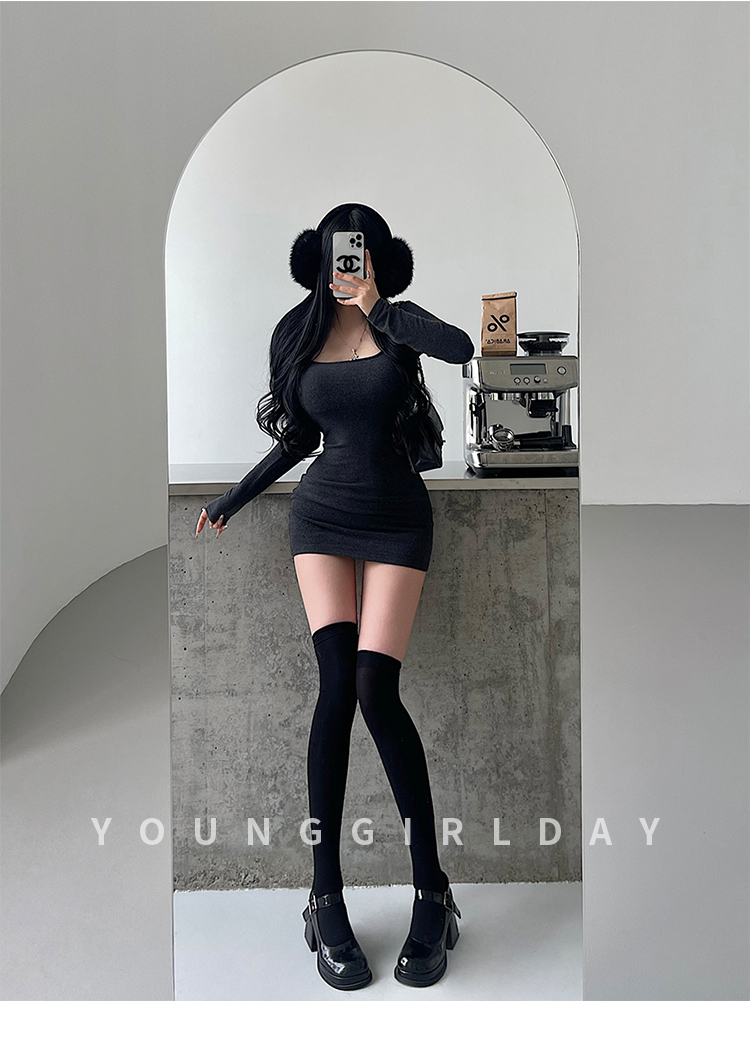 YoungGirlDay純欲性感方領修身顯瘦德絨長袖包臀連衣裙短裙含胸墊