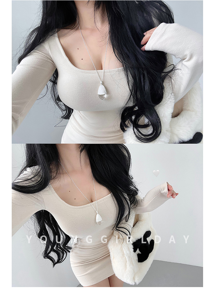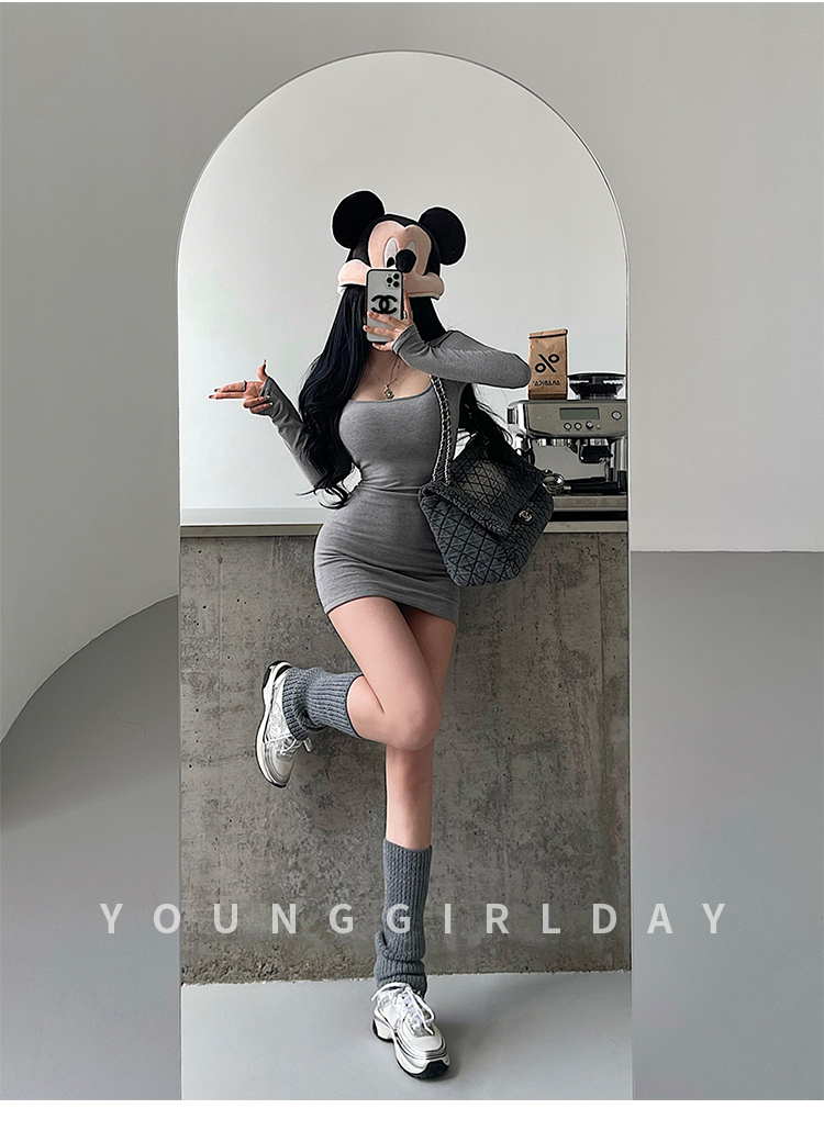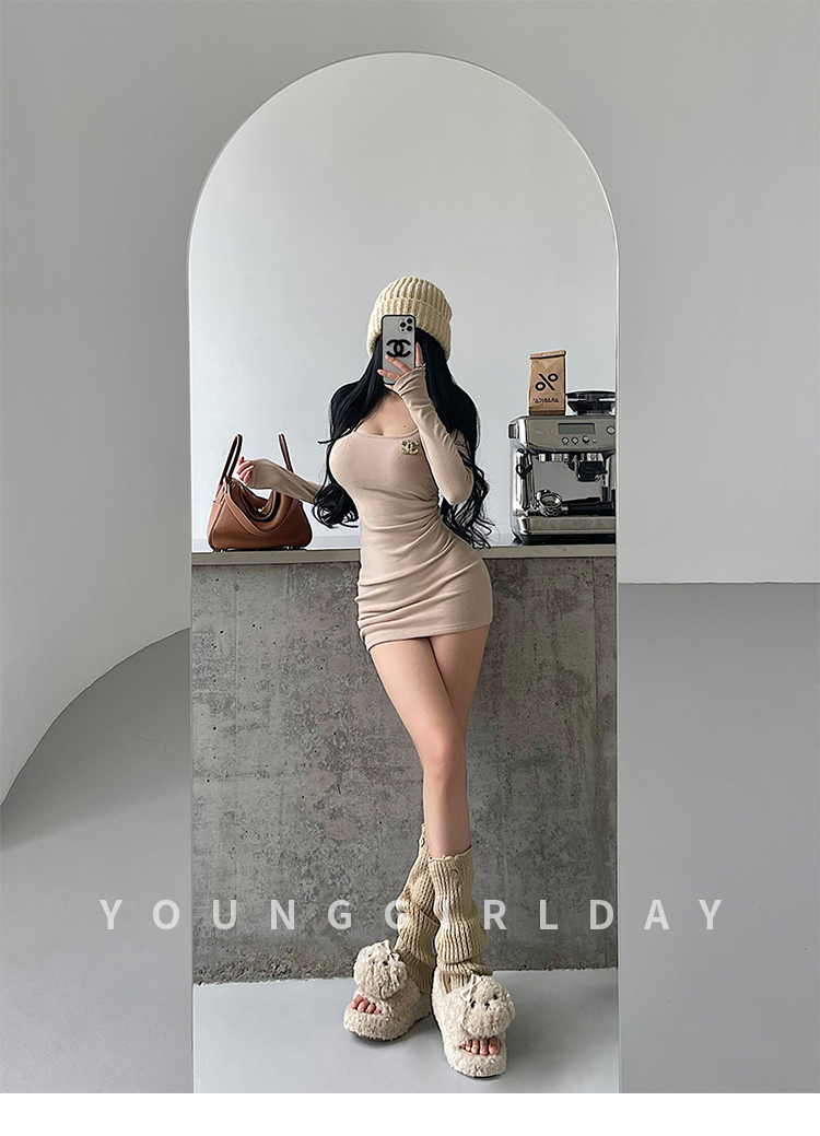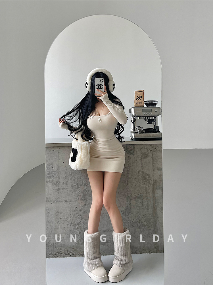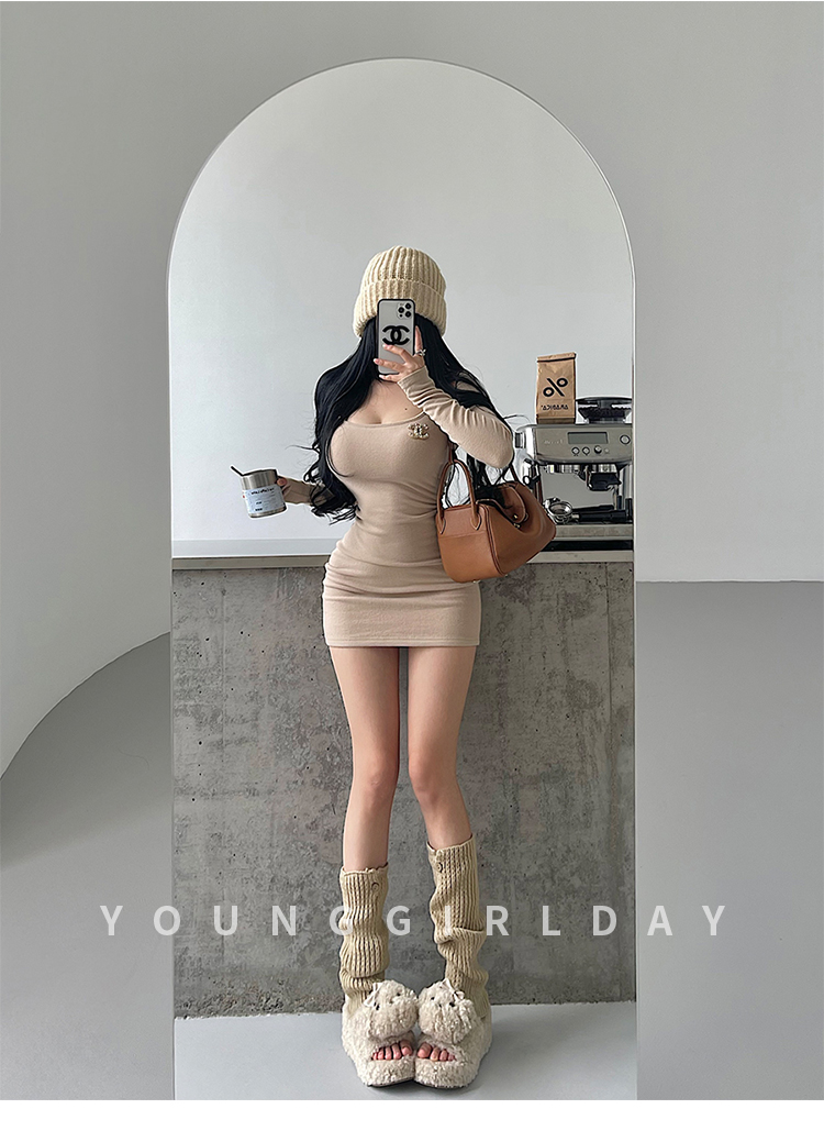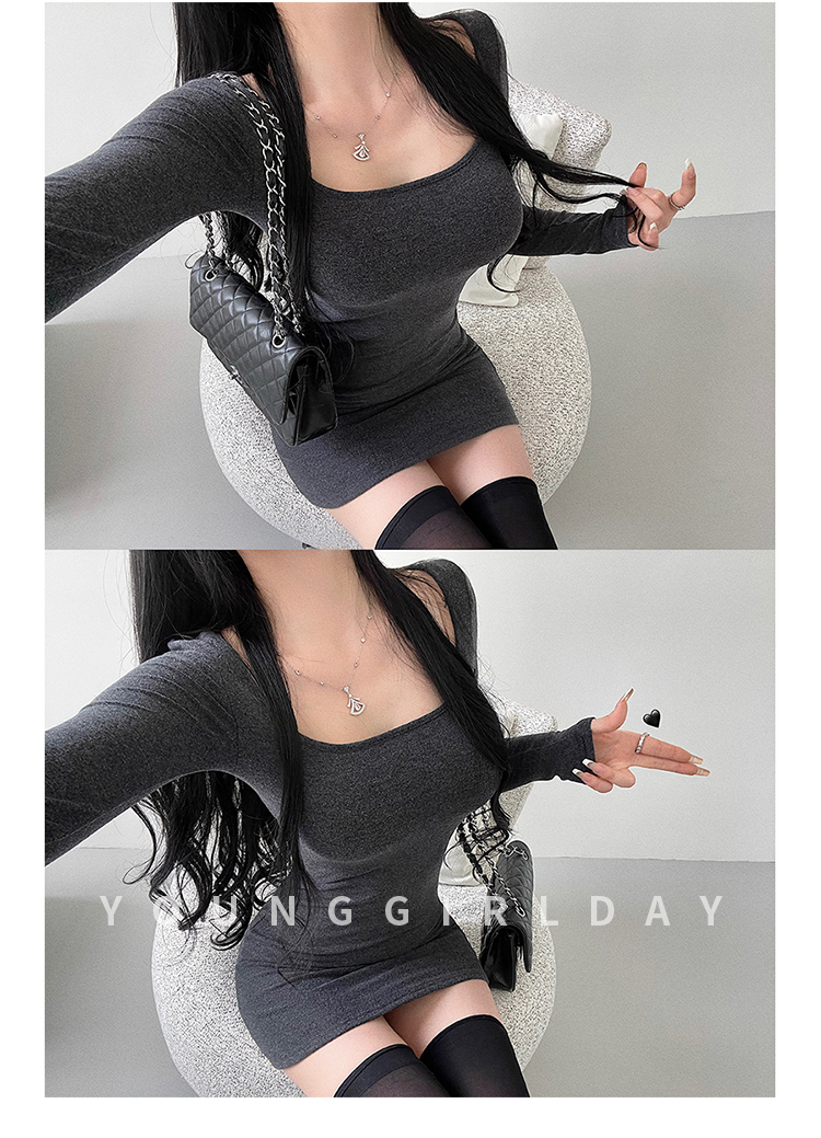 YoungGirlDay純欲性感方領修身顯瘦德絨長袖包臀連衣裙短裙含胸墊