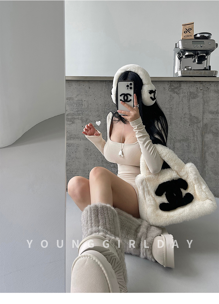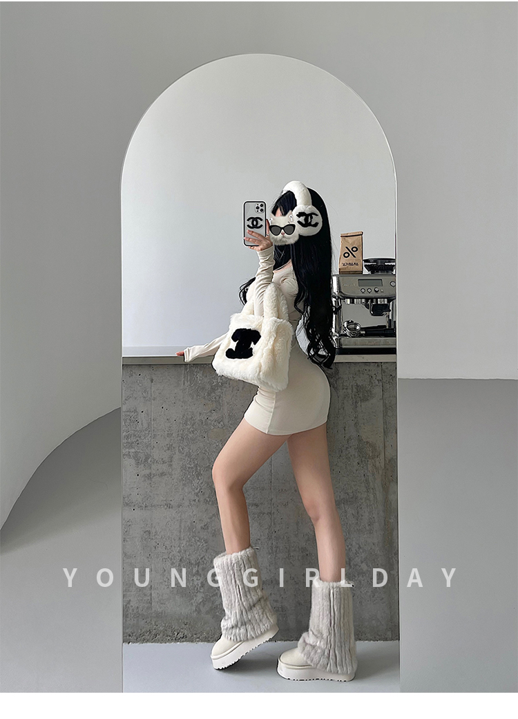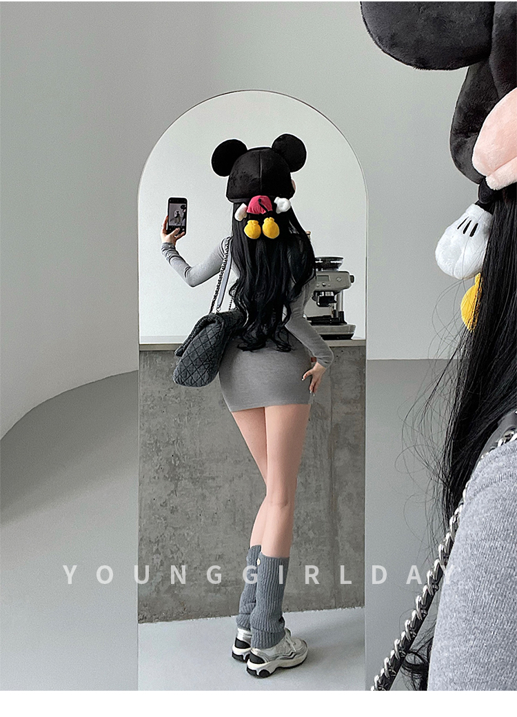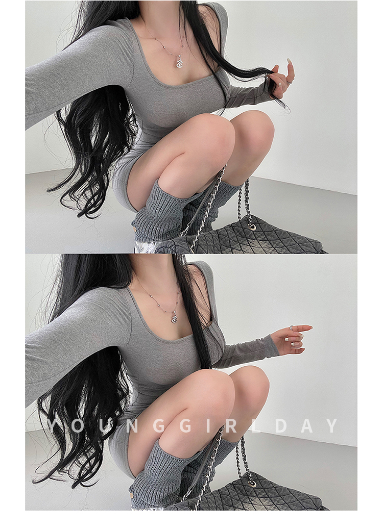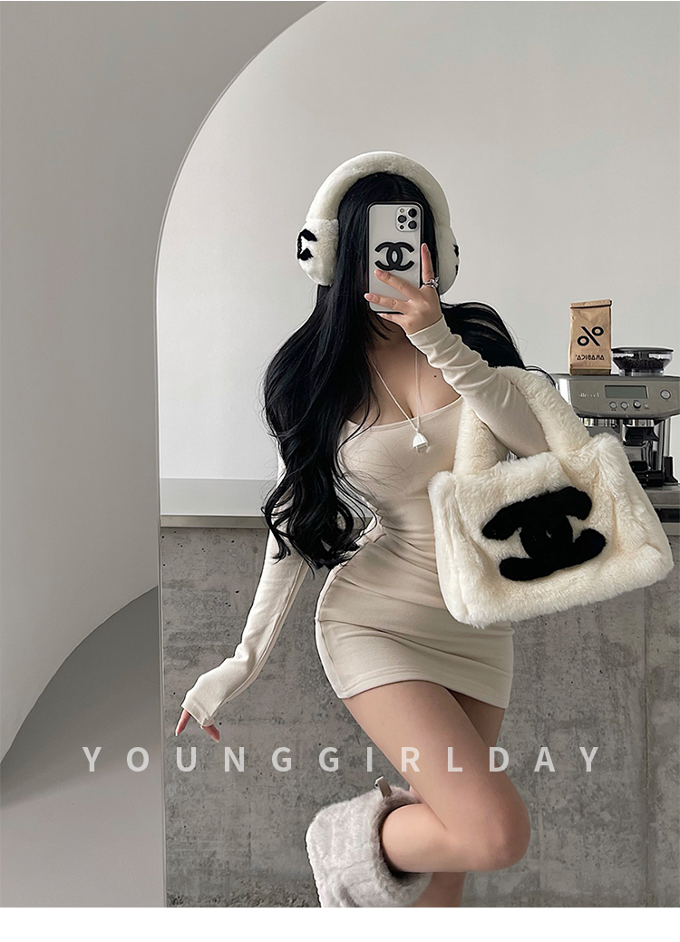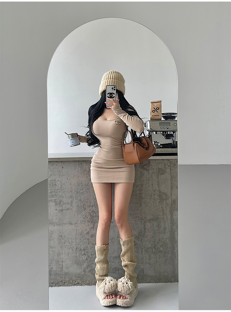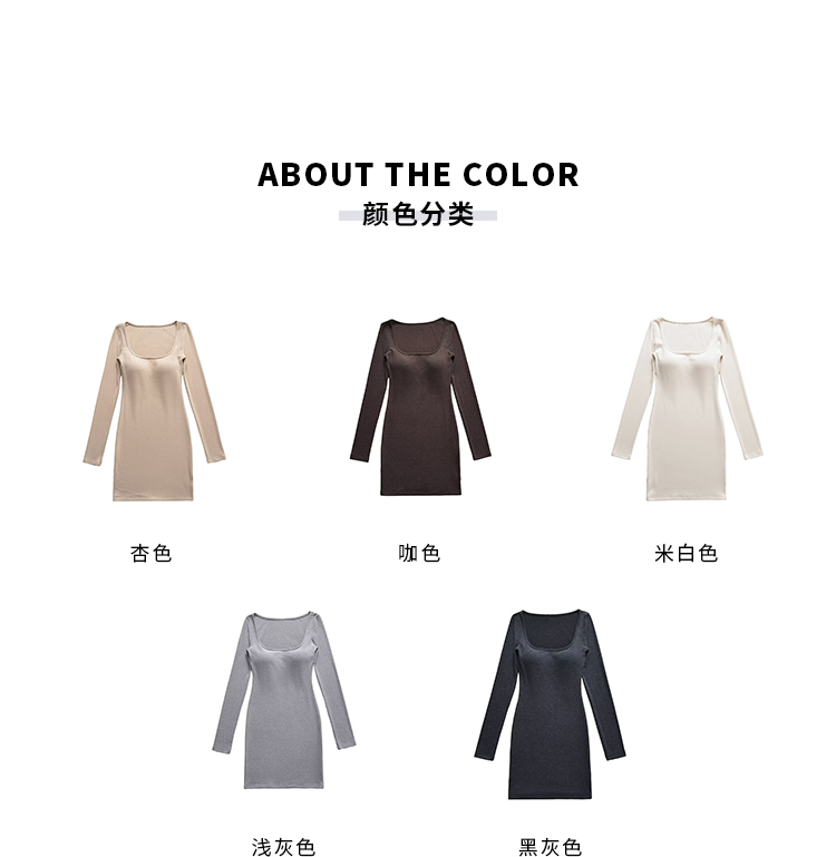 YoungGirlDay純欲性感方領修身顯瘦德絨長袖包臀連衣裙短裙含胸墊