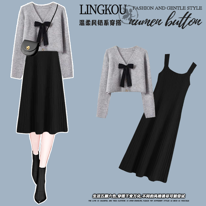 小個子春秋時尚套裝裙女新款小香風針織衫吊帶連衣裙氣質感兩件套