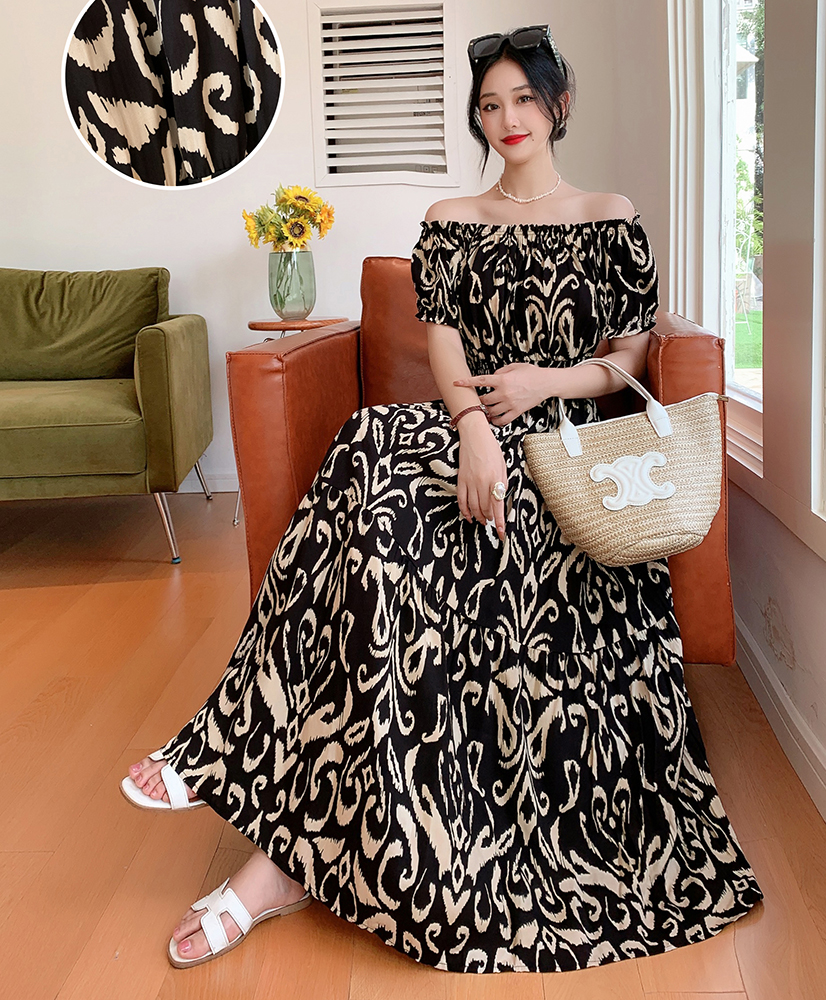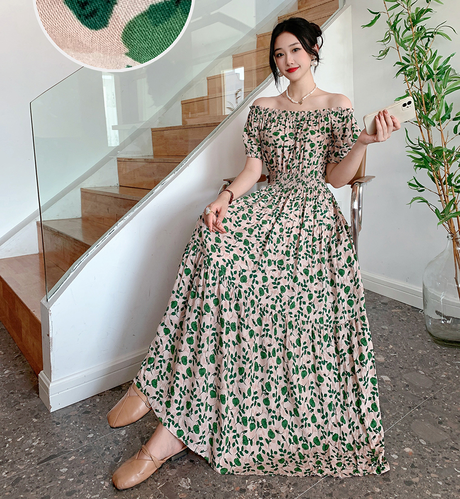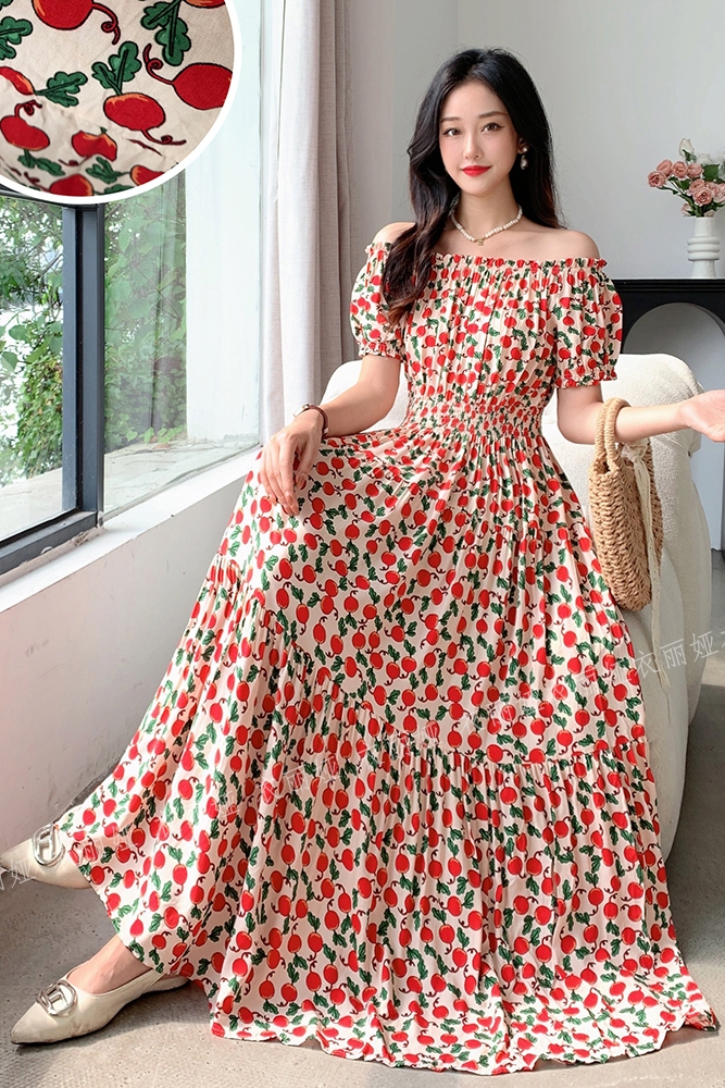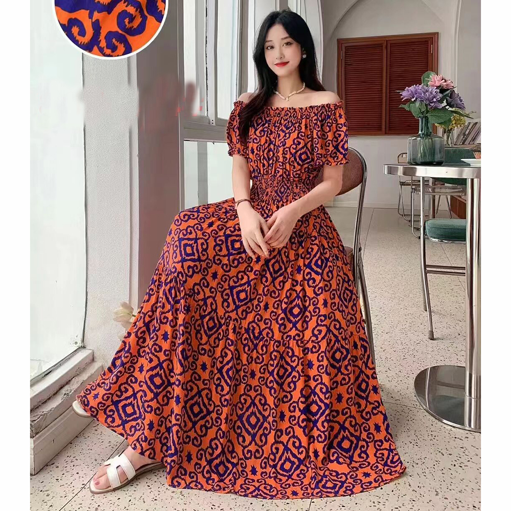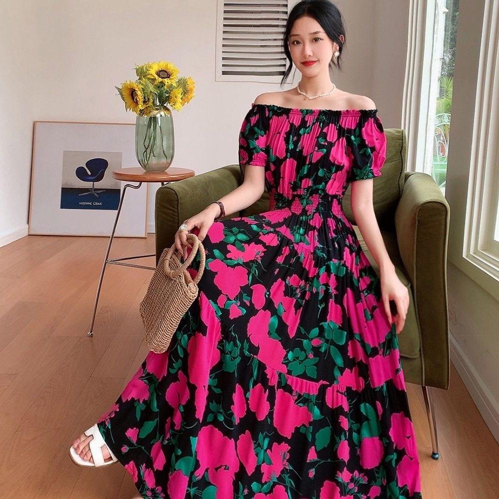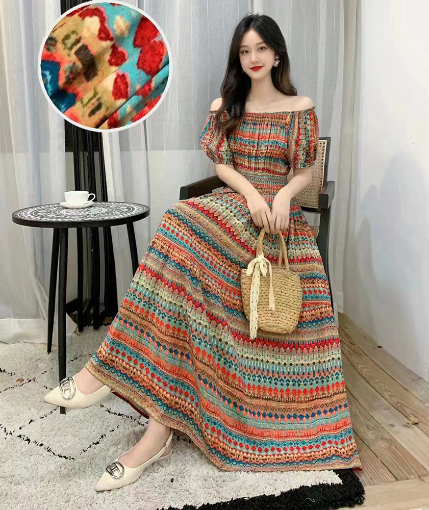 波西米亞碎花棉綢大擺裙連衣裙長裙沙灘裙度假裙印花一字領甜美夏
