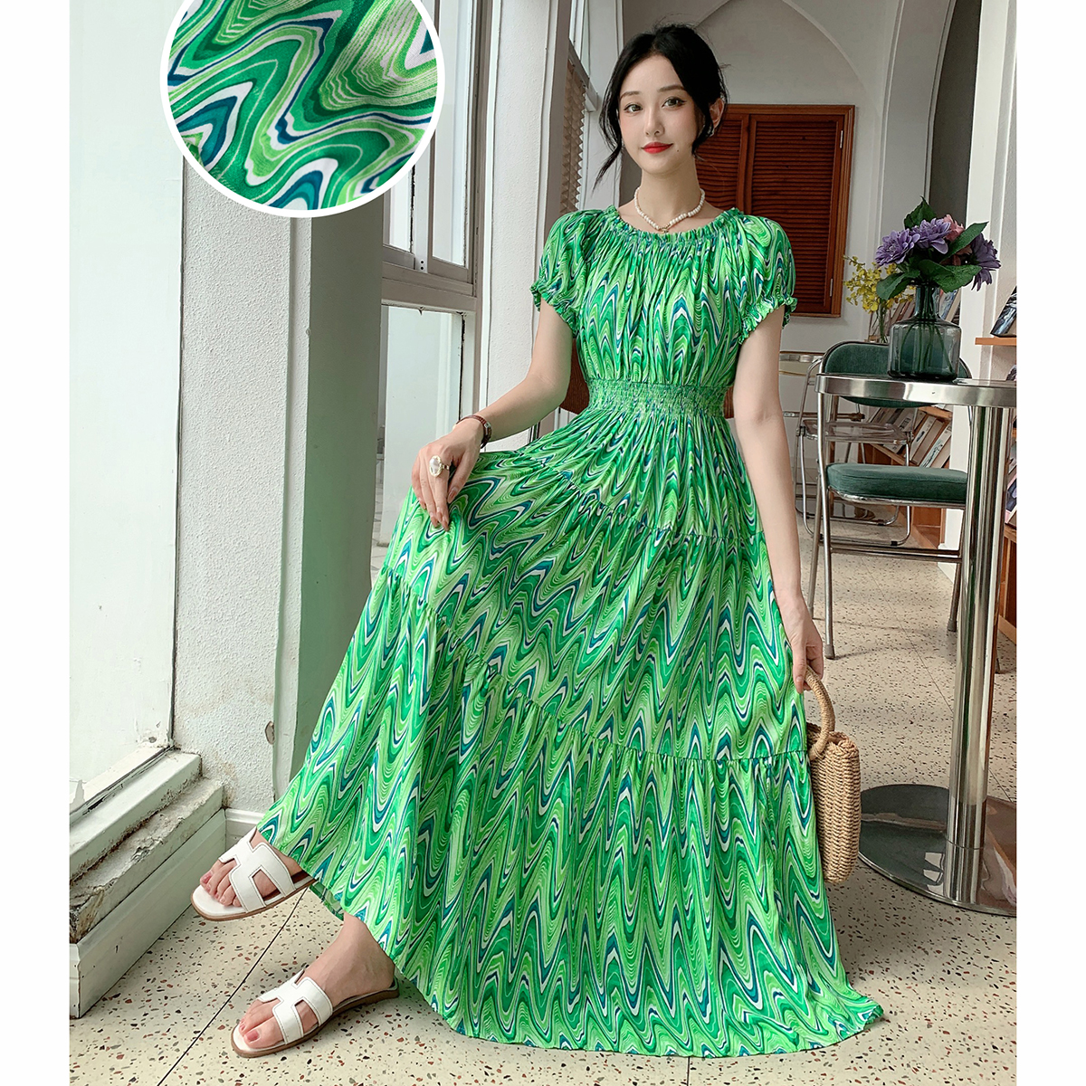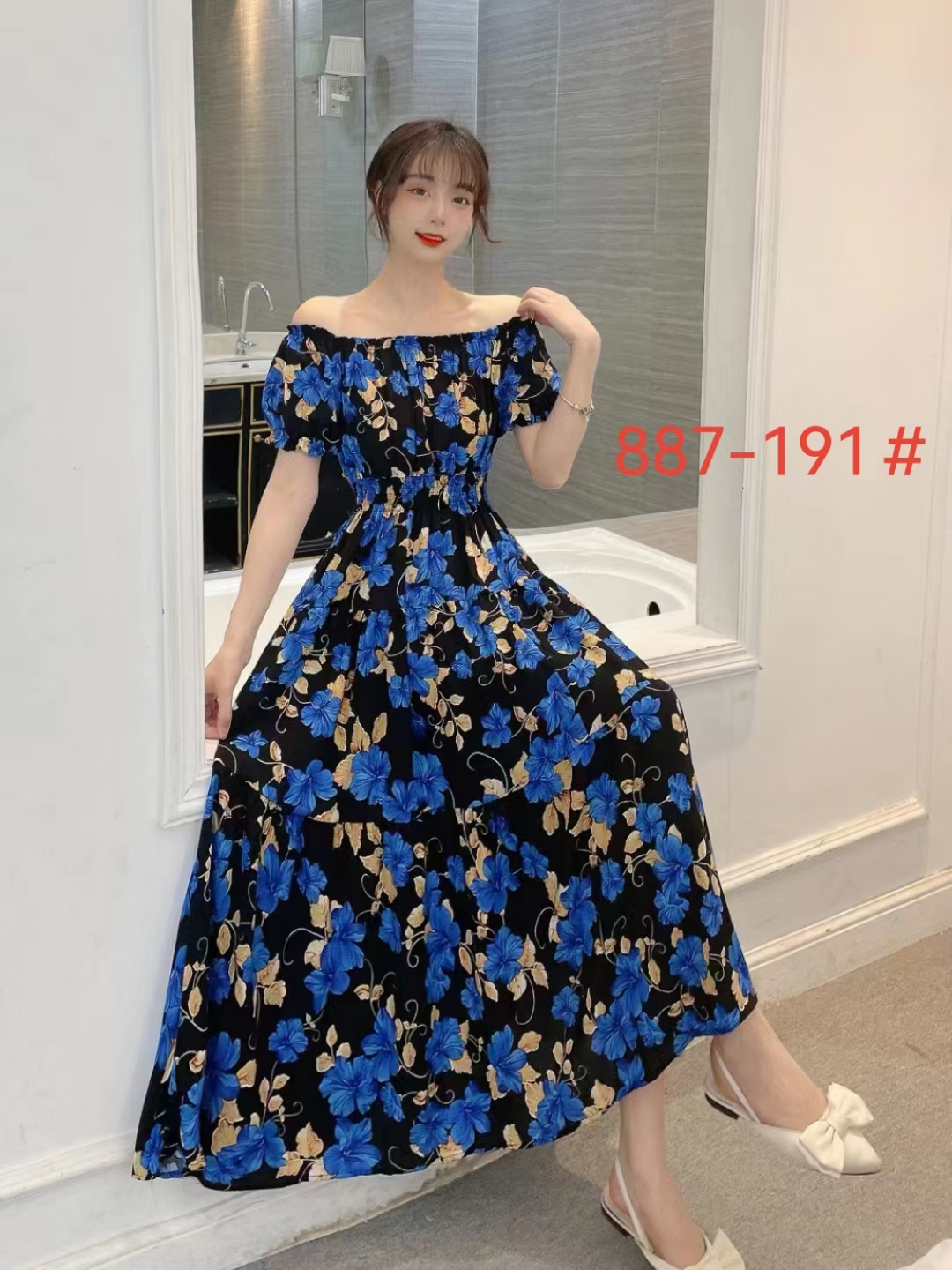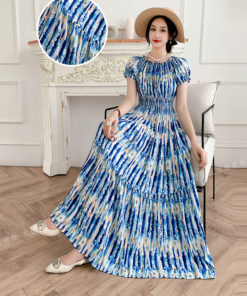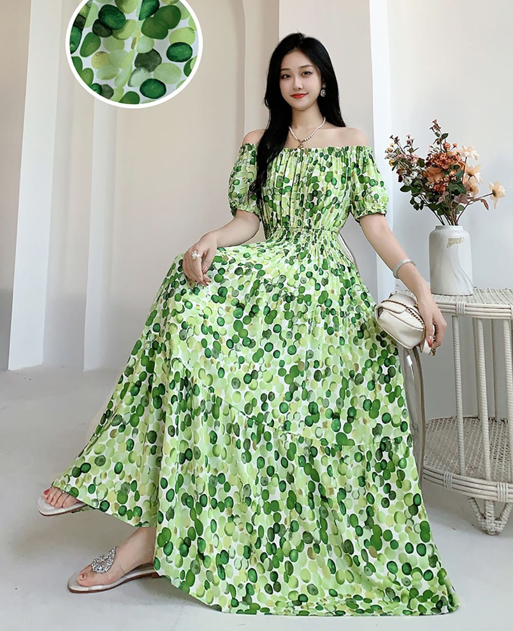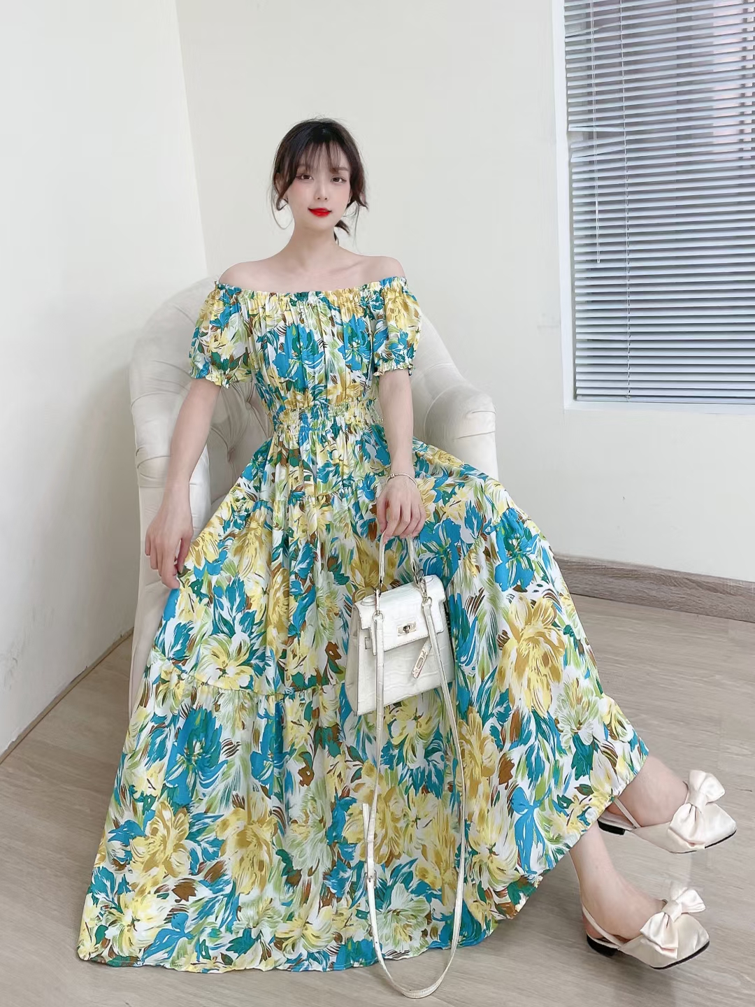 波西米亞碎花棉綢大擺裙連衣裙長裙沙灘裙度假裙印花一字領甜美夏