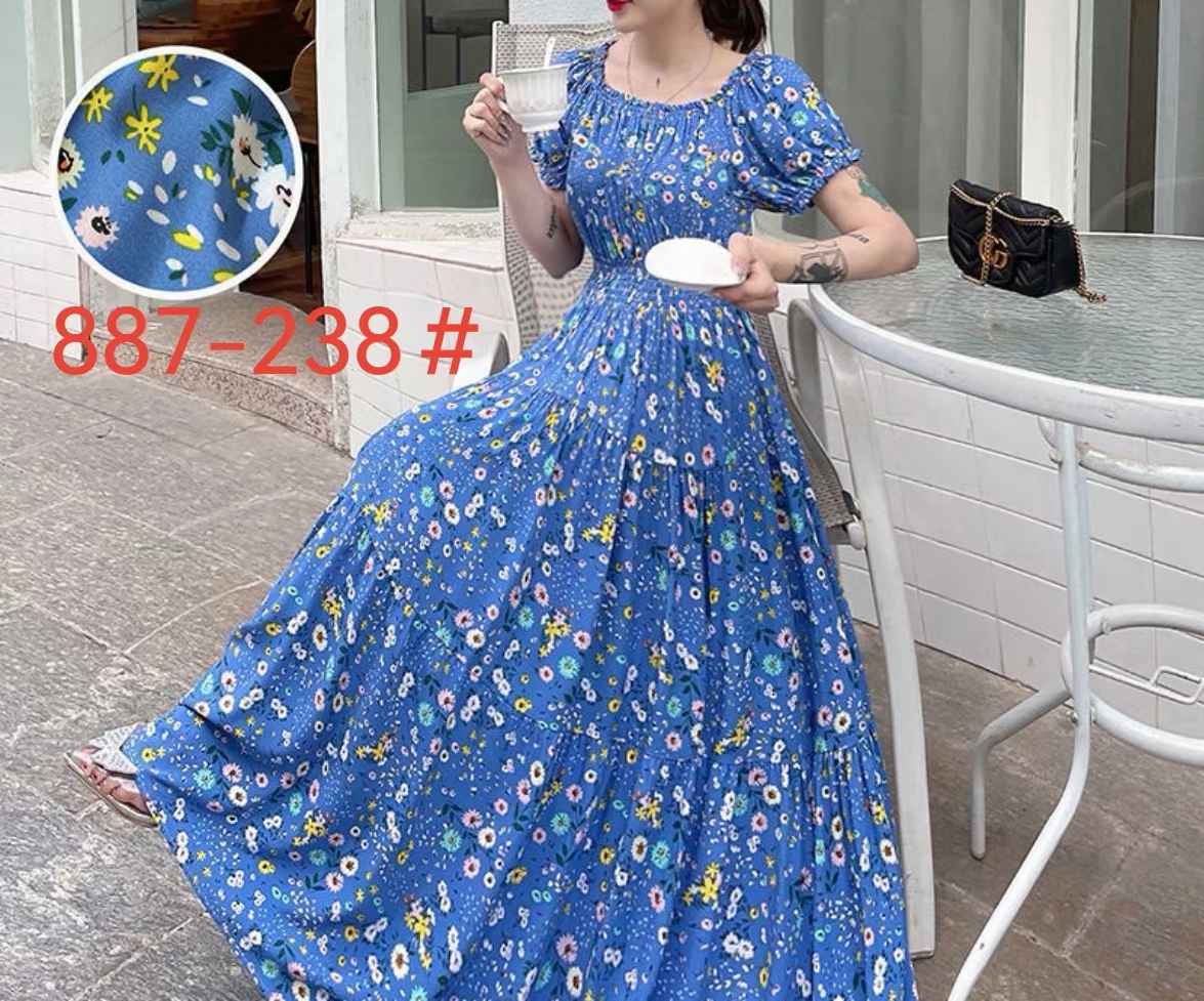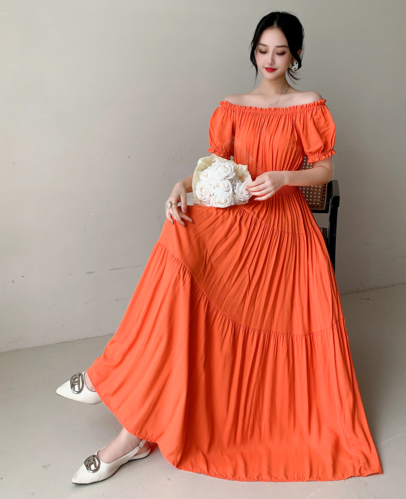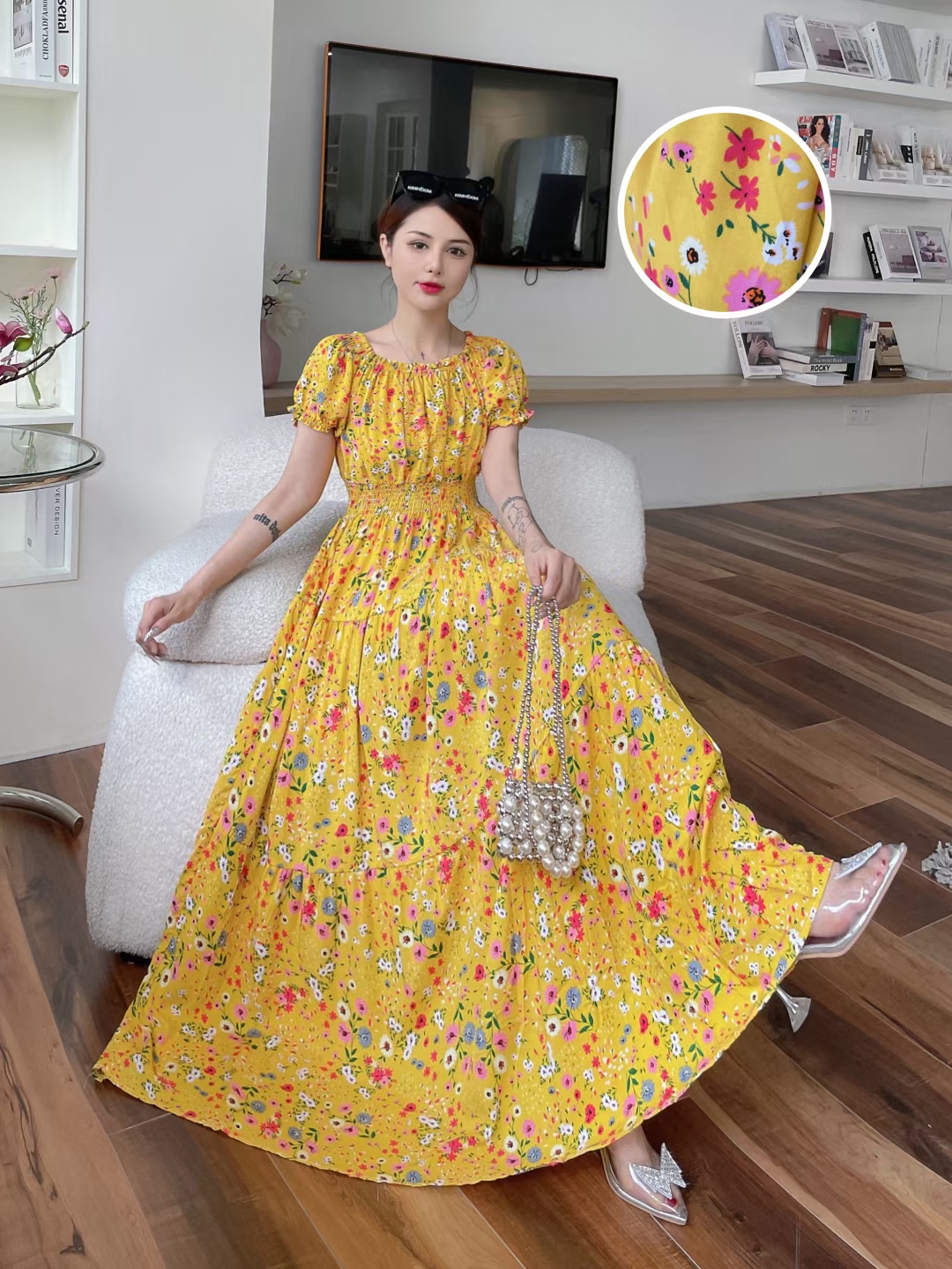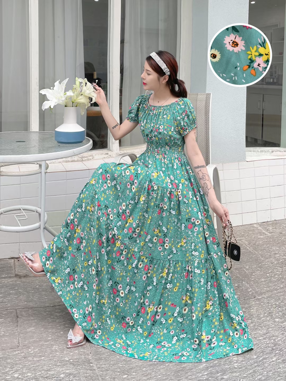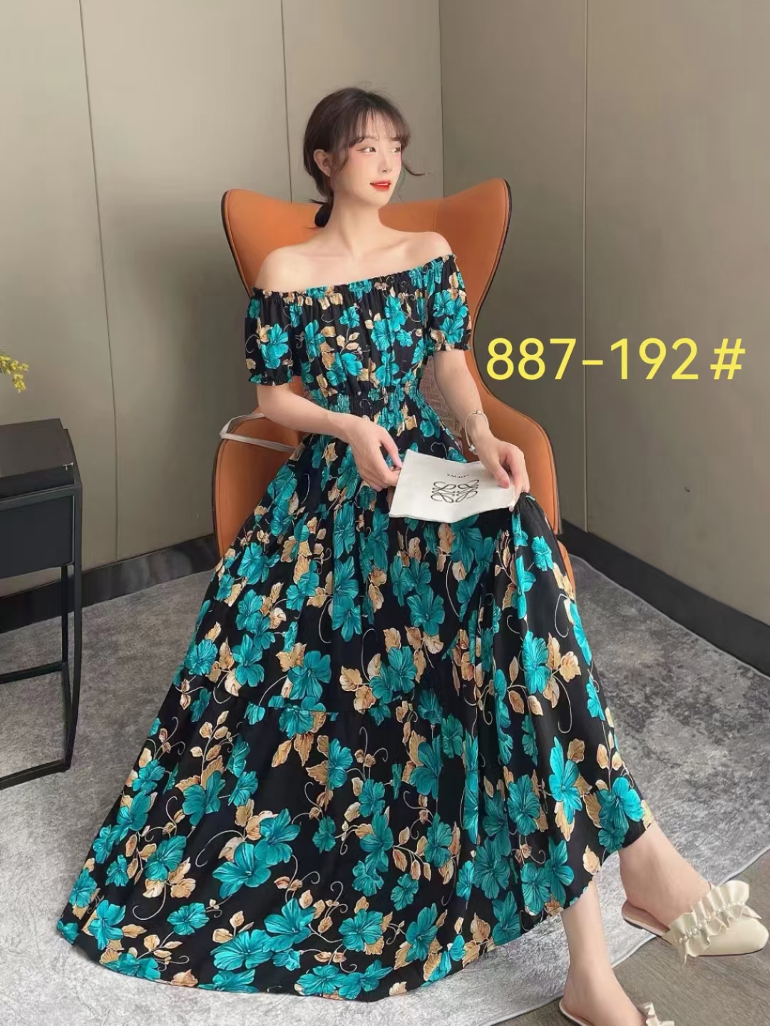 波西米亞碎花棉綢大擺裙連衣裙長裙沙灘裙度假裙印花一字領甜美夏