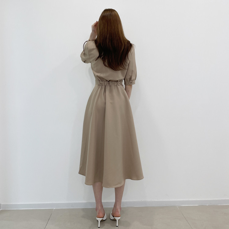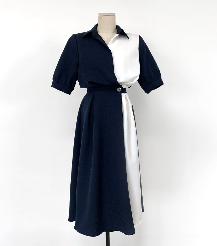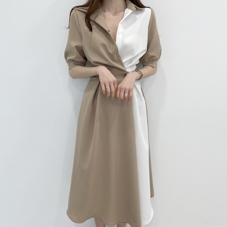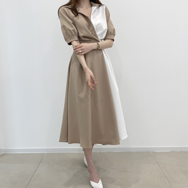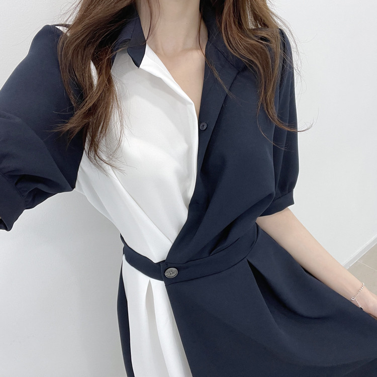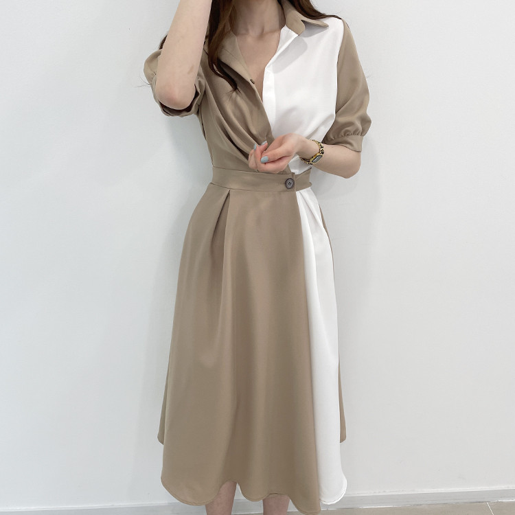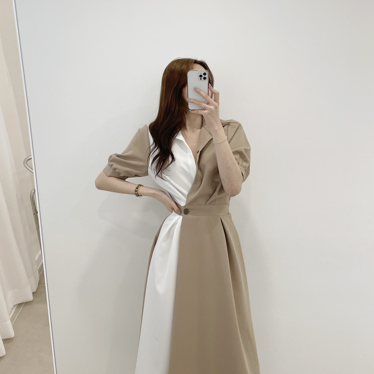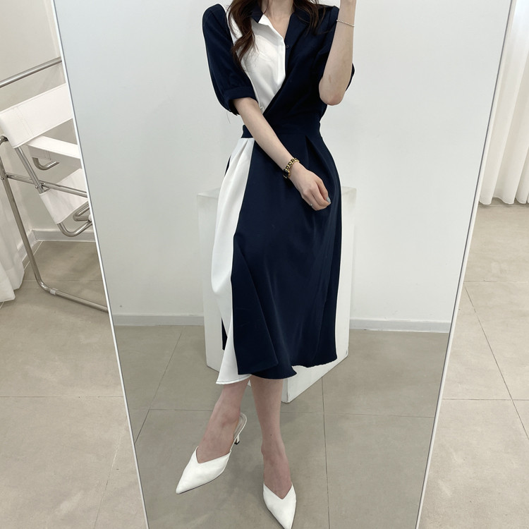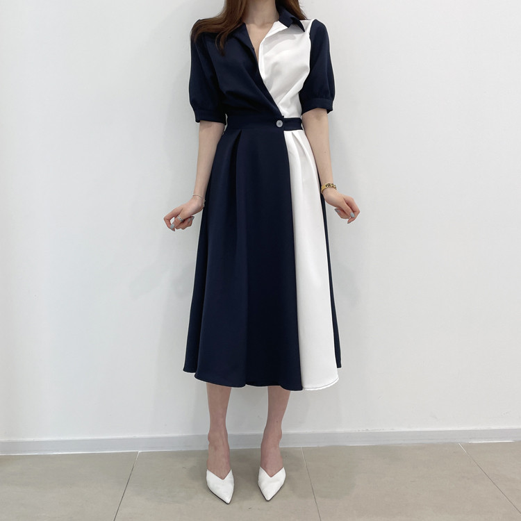 韓國chic夏季法式小衆翻領設計感撞色拼接一粒釦收腰短袖連衣裙女