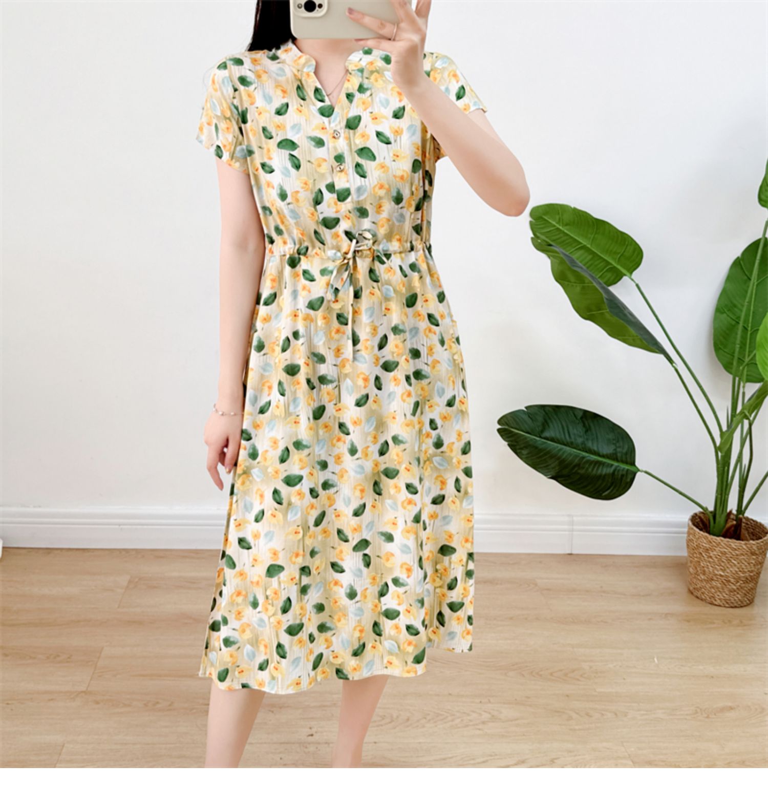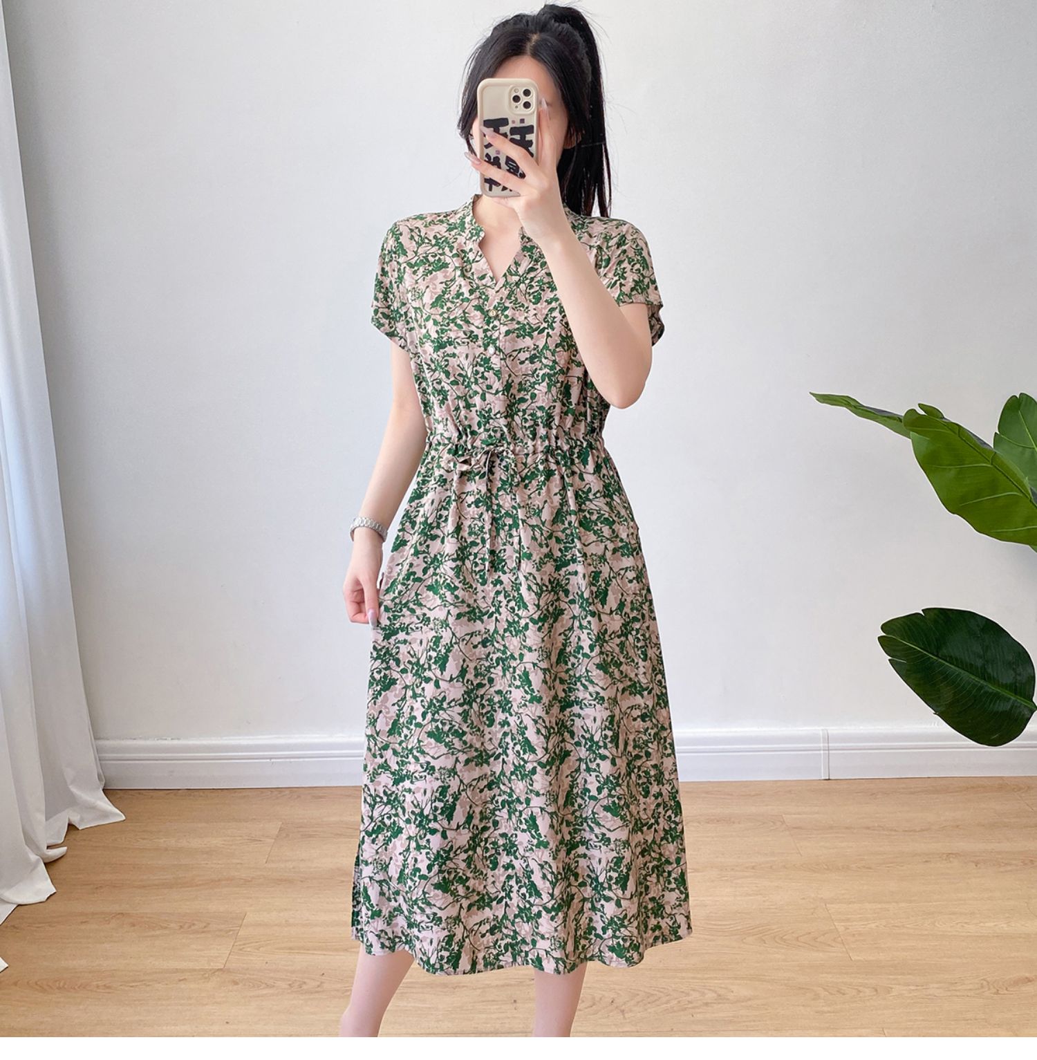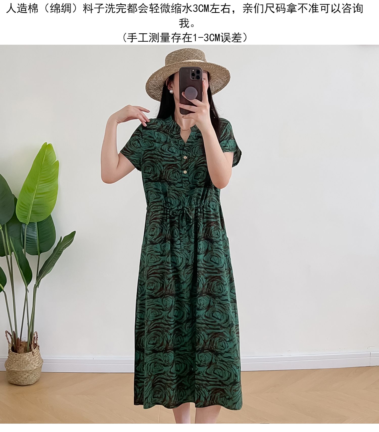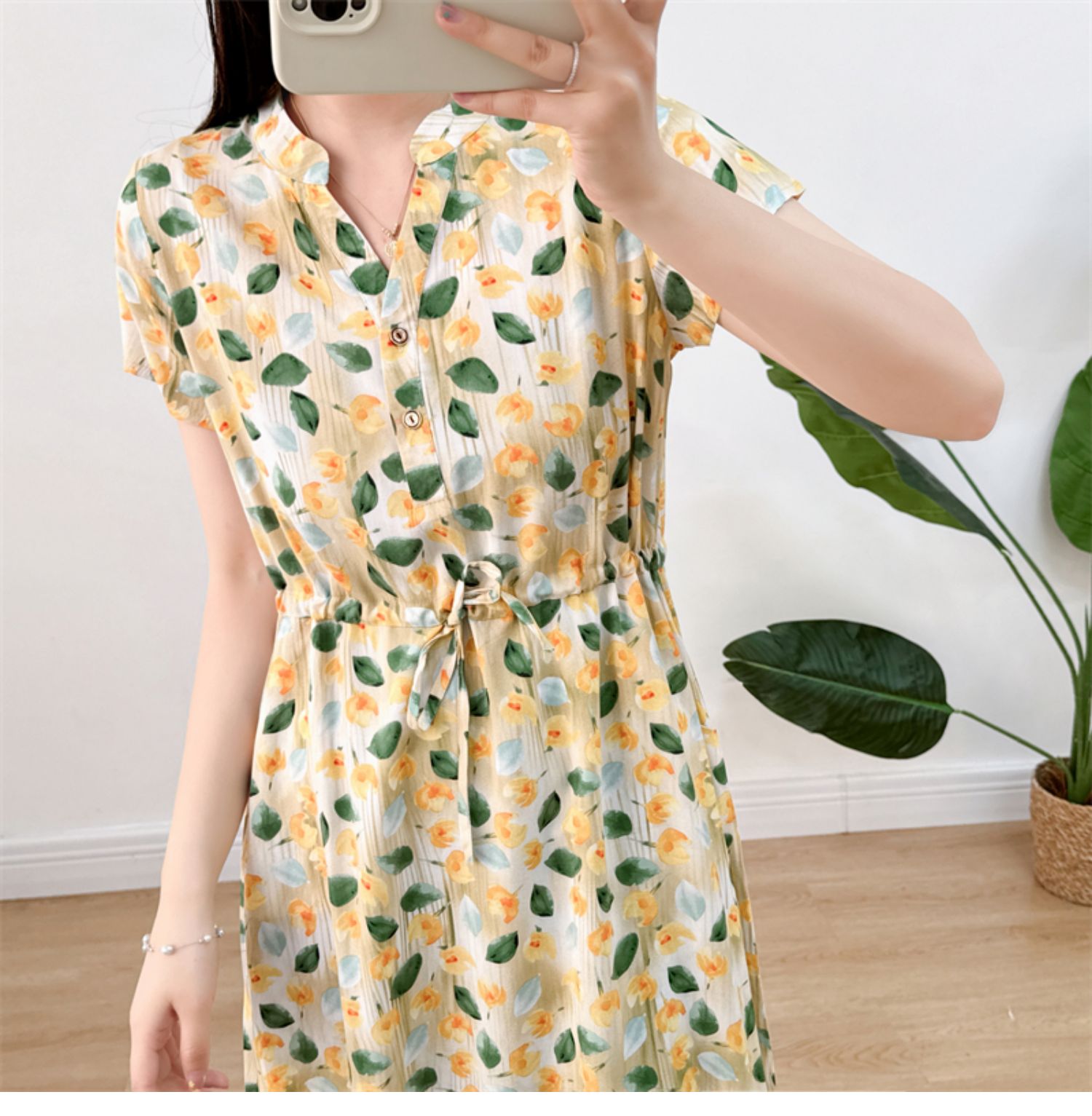 棉綢連衣裙女2024年夏季薄款收腰顯瘦立領碎花中長裙人造棉沙灘裙