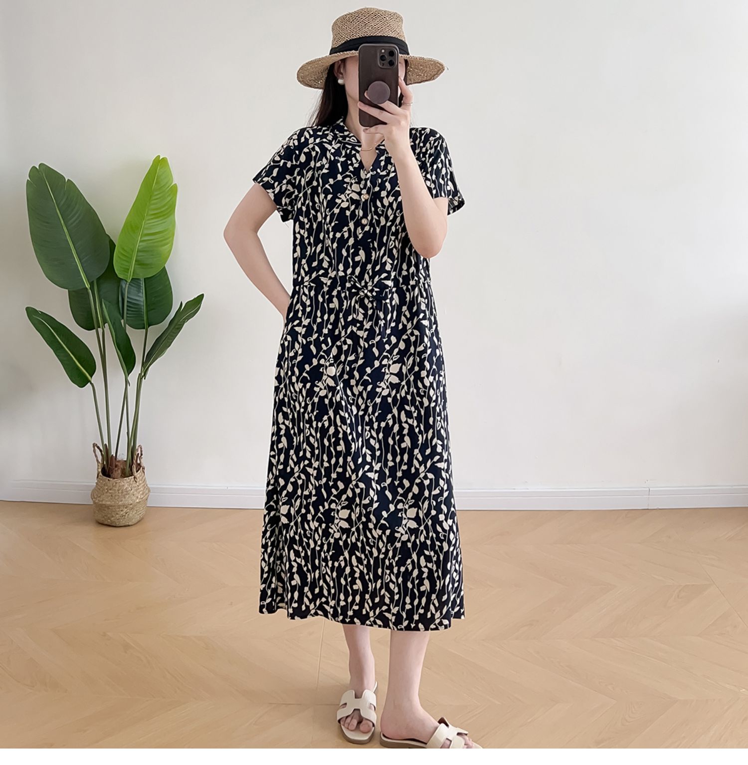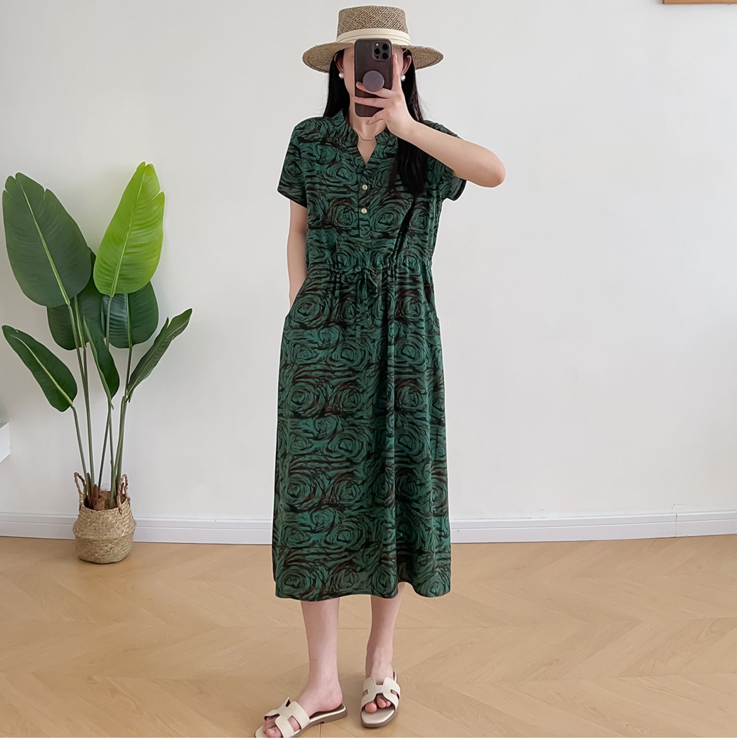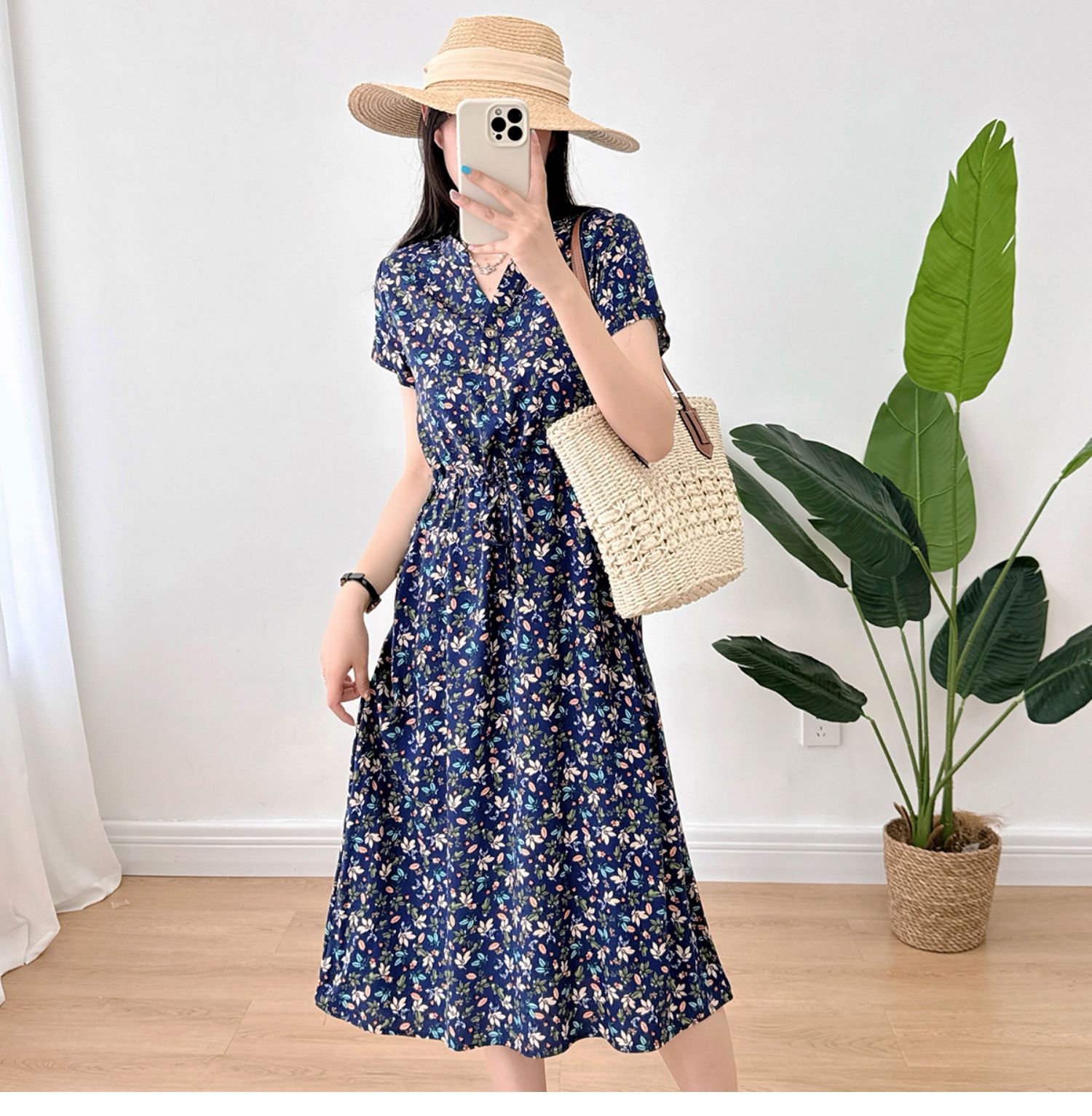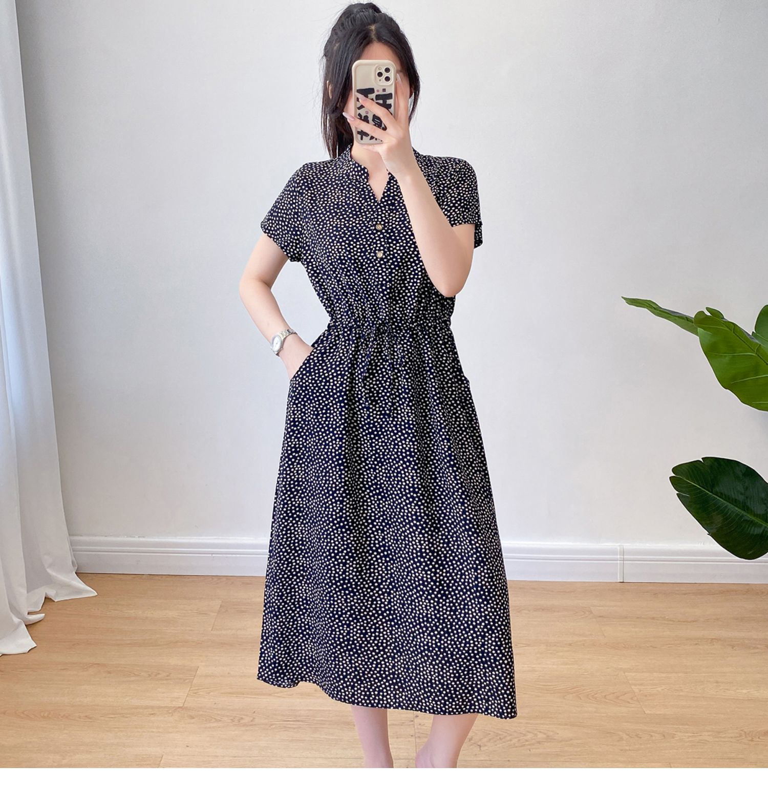 棉綢連衣裙女2024年夏季薄款收腰顯瘦立領碎花中長裙人造棉沙灘裙