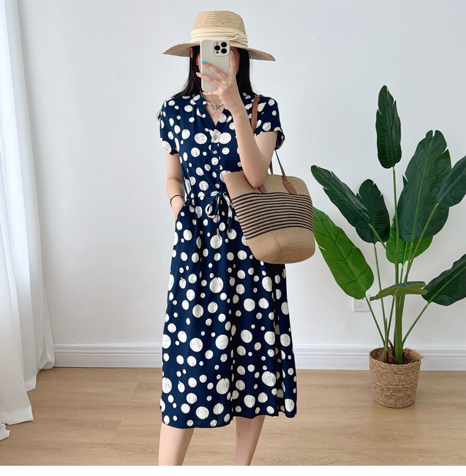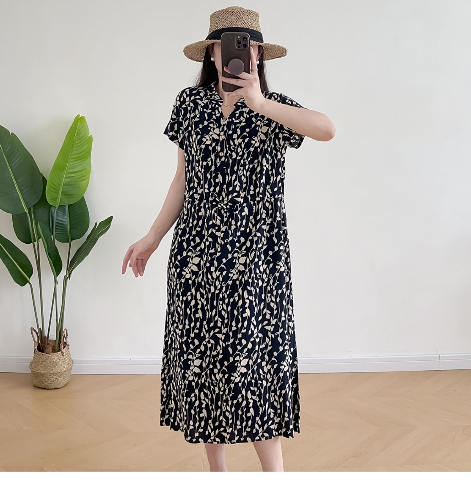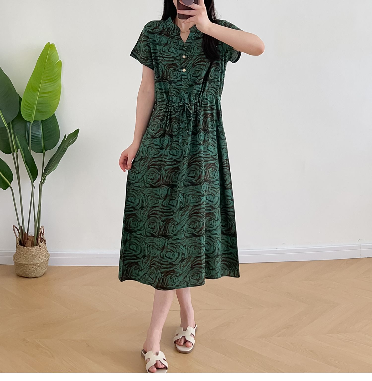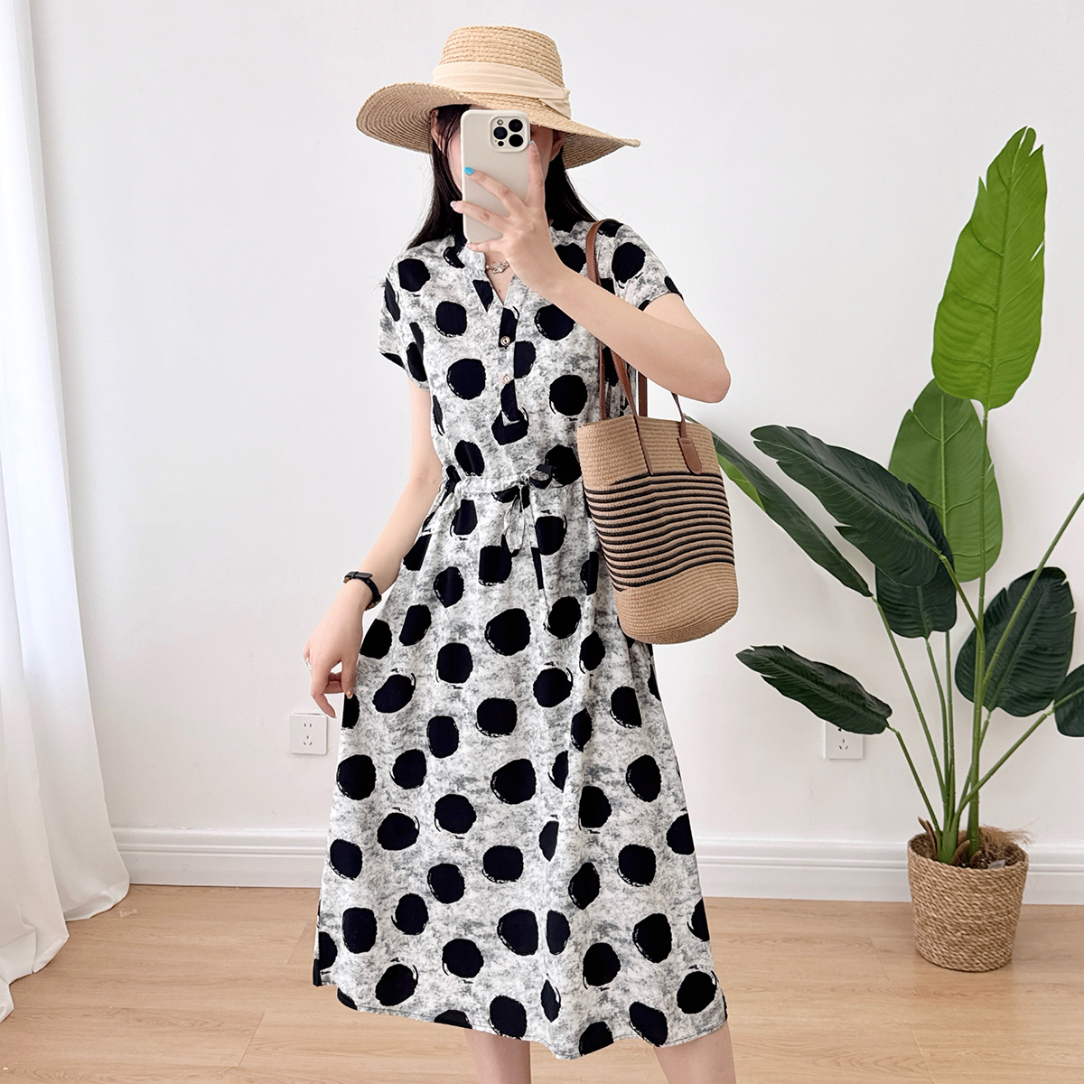 棉綢連衣裙女2024年夏季薄款收腰顯瘦立領碎花中長裙人造棉沙灘裙