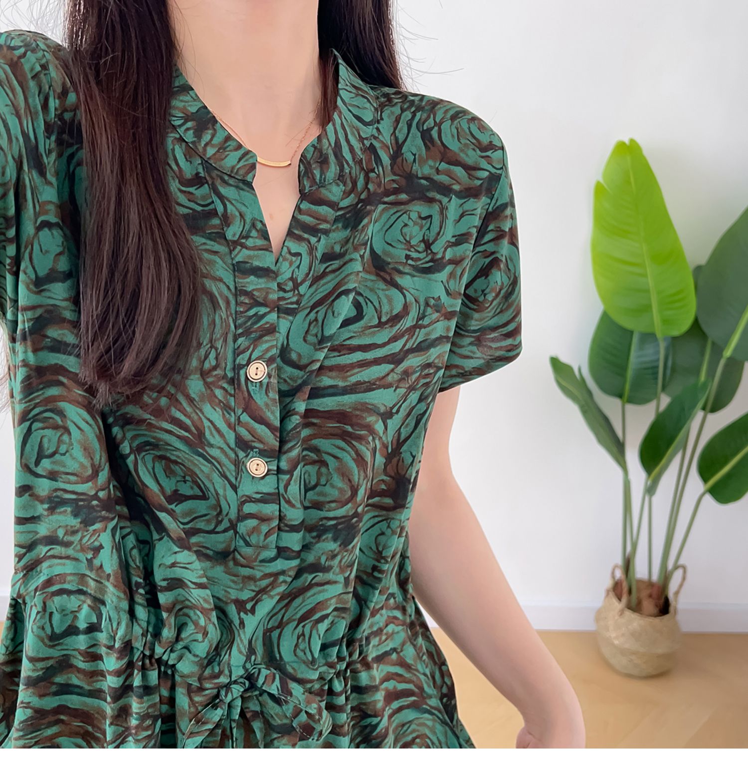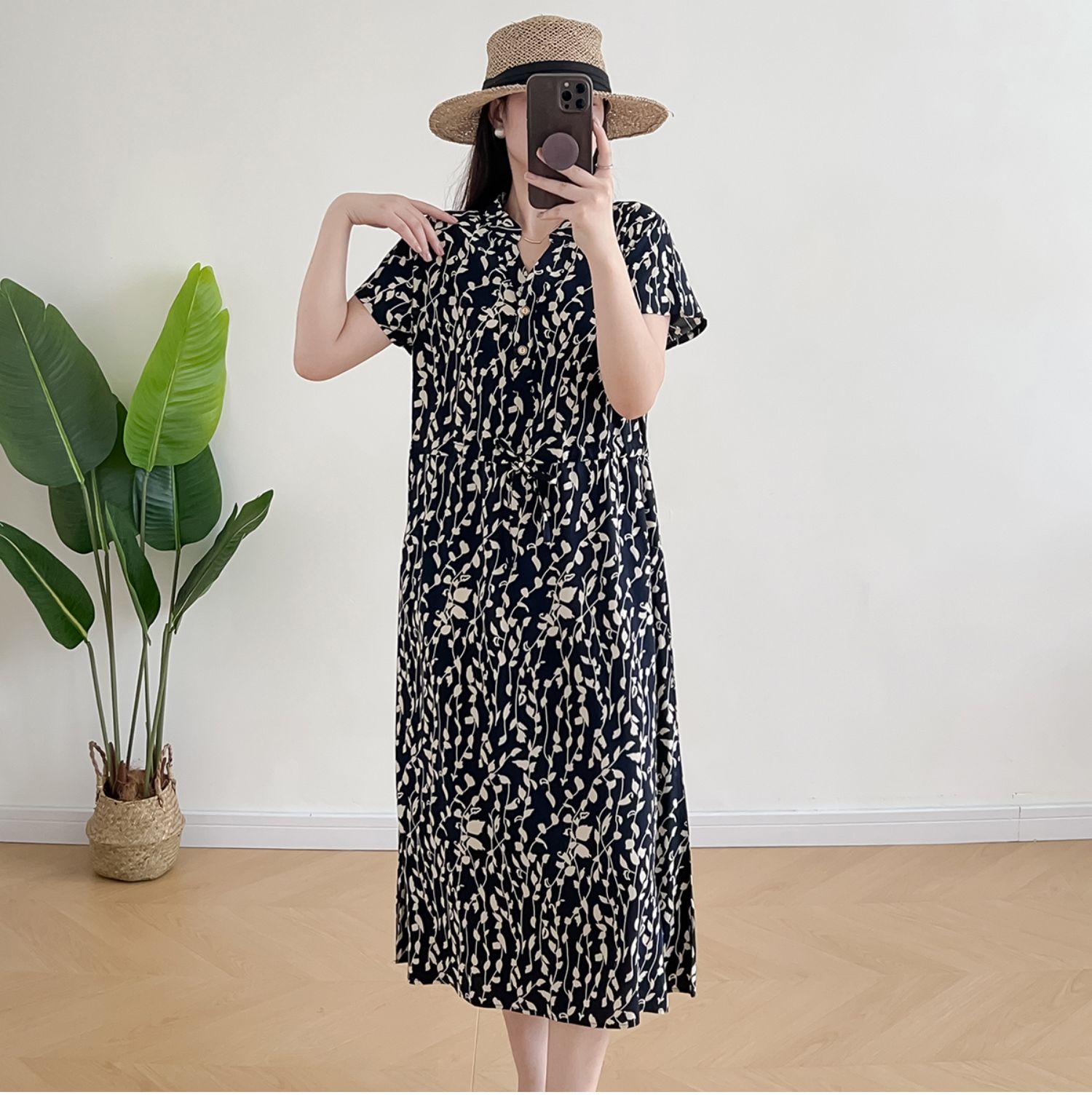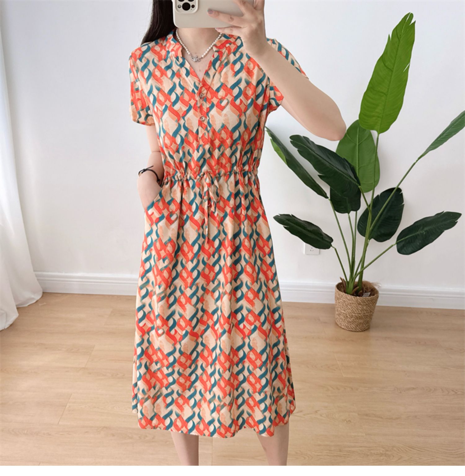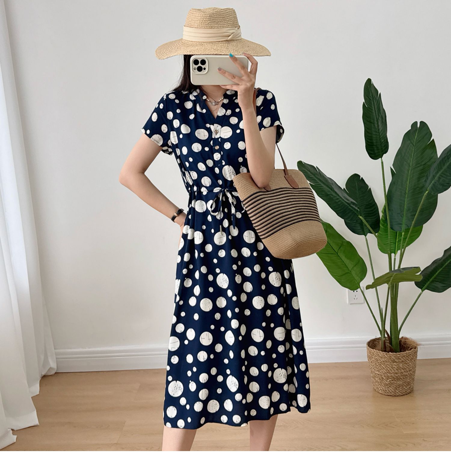 棉綢連衣裙女2024年夏季薄款收腰顯瘦立領碎花中長裙人造棉沙灘裙